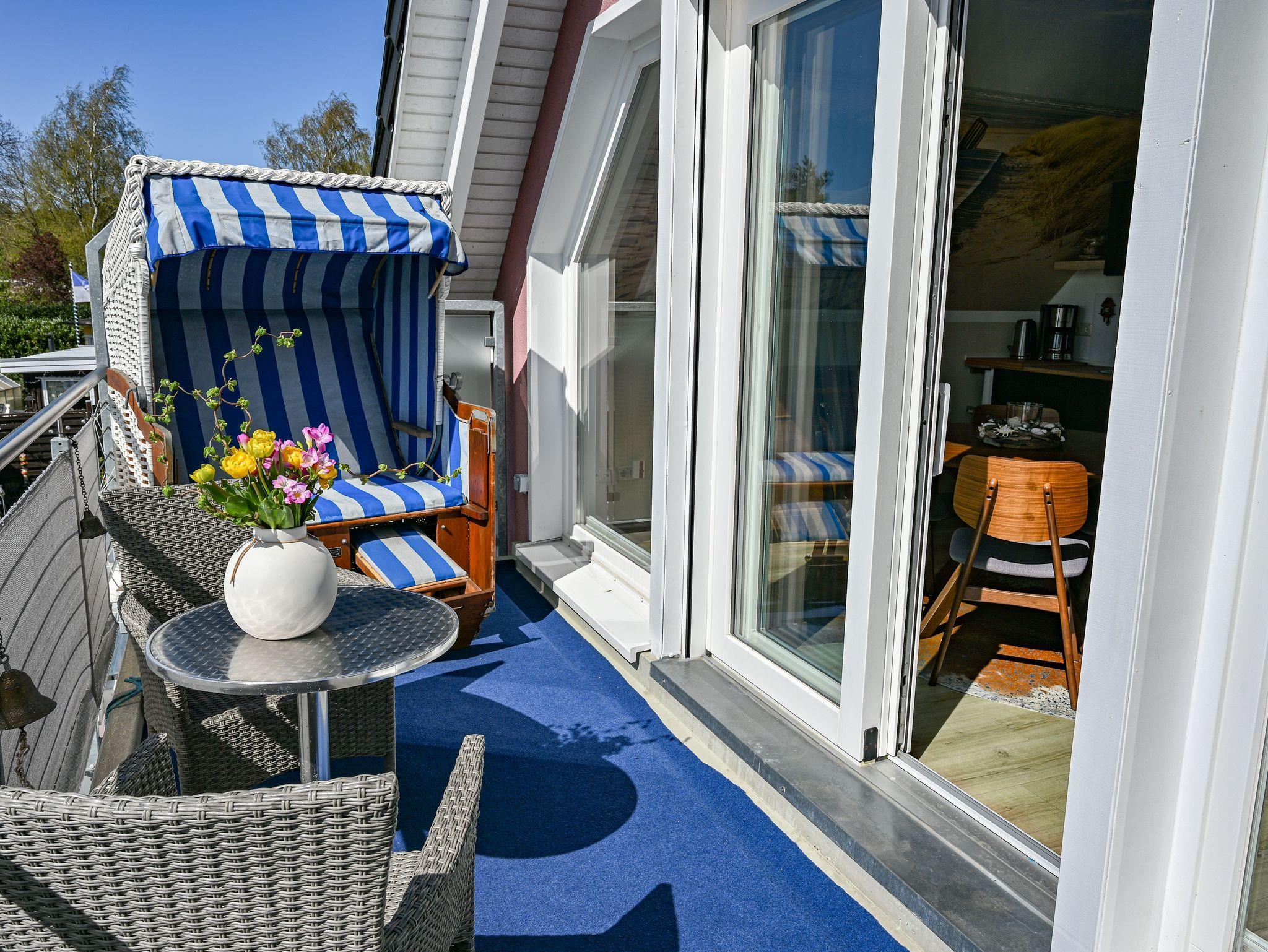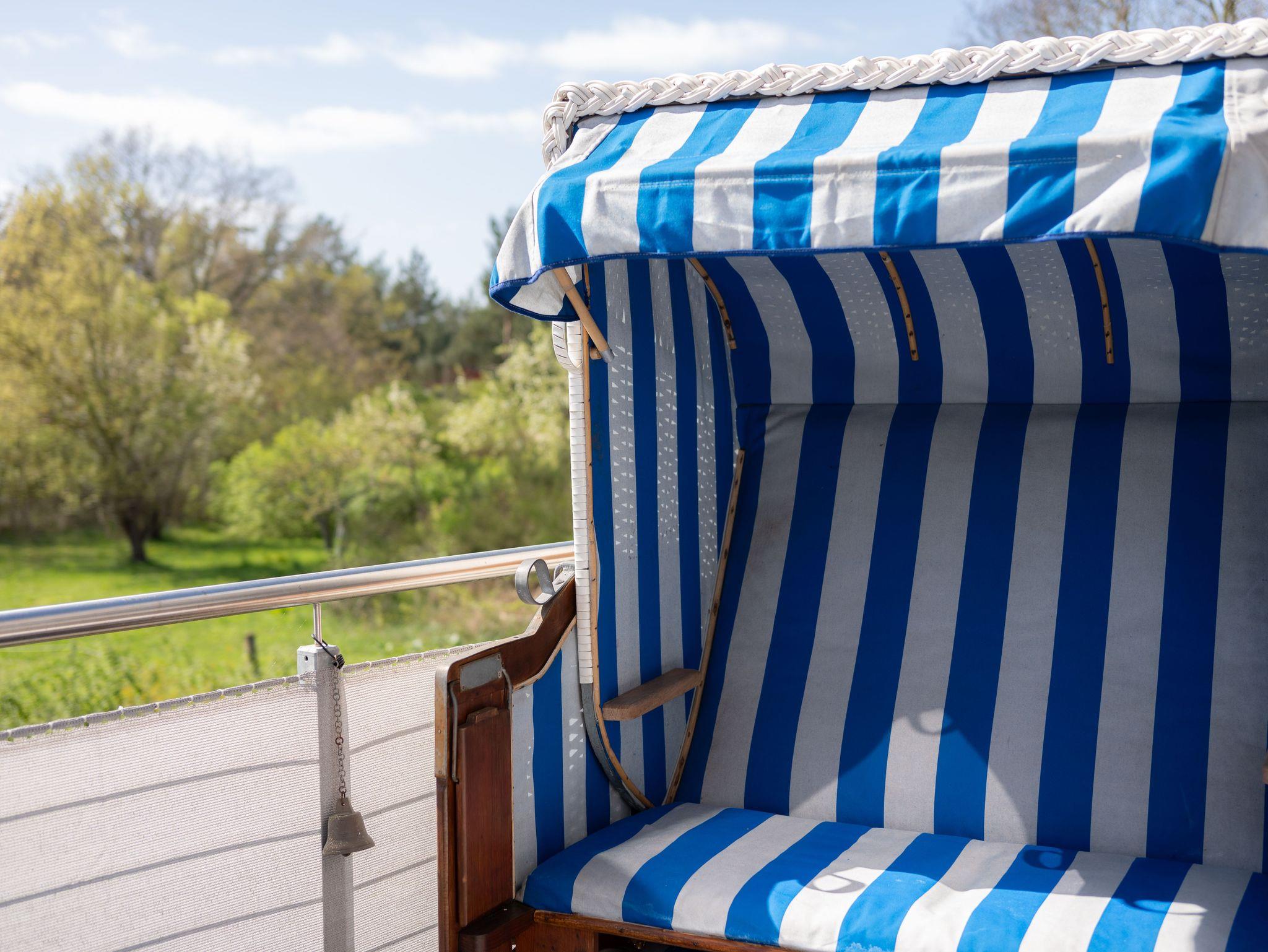 Vom Wohnbereich aus gelangt man auf den Balkon mit Blick ins Grüne und auf die Borner Festwiese. Ein Relaxstuhl, Strandkorb und Sonnenschirm laden hier zum Entspannen ein.