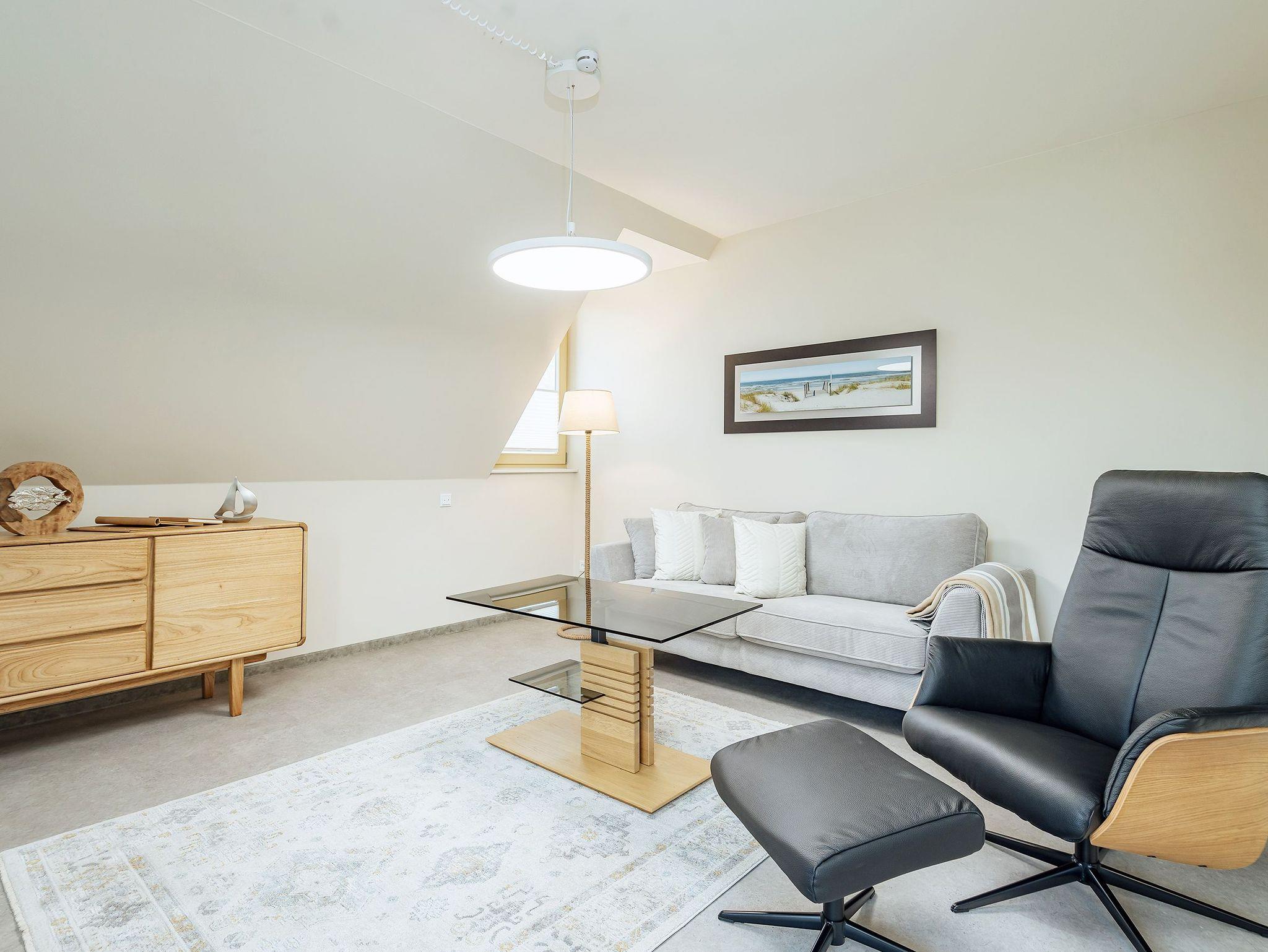 Das Schlafzimmer in ruhiger Nordausrichtung sorgt mit seinem großzügigen Boxspringbett (2,00 x 1,80 m) für erholsame Nächte ? perfekt, um nach einem Tag voller frischer Ostseeluft die Akkus wieder aufzuladen. Der helle, offene Wohn- und Küchenbereich liegt in Westausrichtung und verwöhnt Euch mit viel Licht und einem schönen Balkon, auf dem sich der Feierabend besonders gut genießen lässt ? Sonnenuntergang inklusive, wenn das Wetter mitspielt.