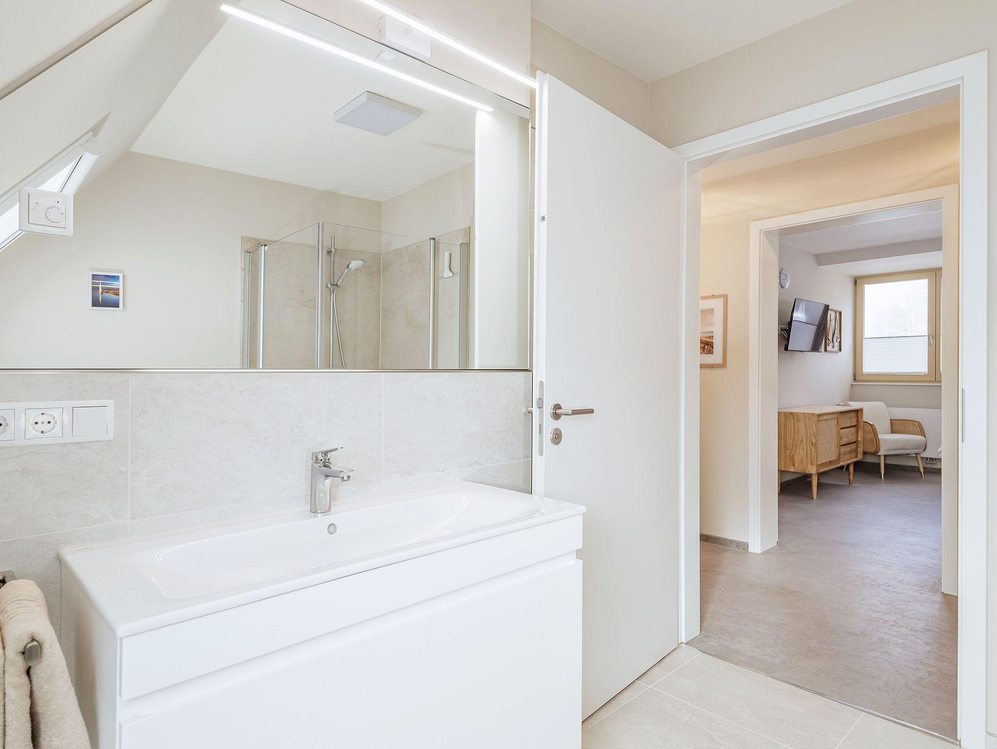 Das Tageslichtbad überzeugt mit großem Waschtisch, Handtuchheizkörper, elektrischer Fußbodenheizung und ebenerdiger Dusche ? hier startet Ihr entspannt in den Tag oder lasst ihn gemütlich ausklingen.