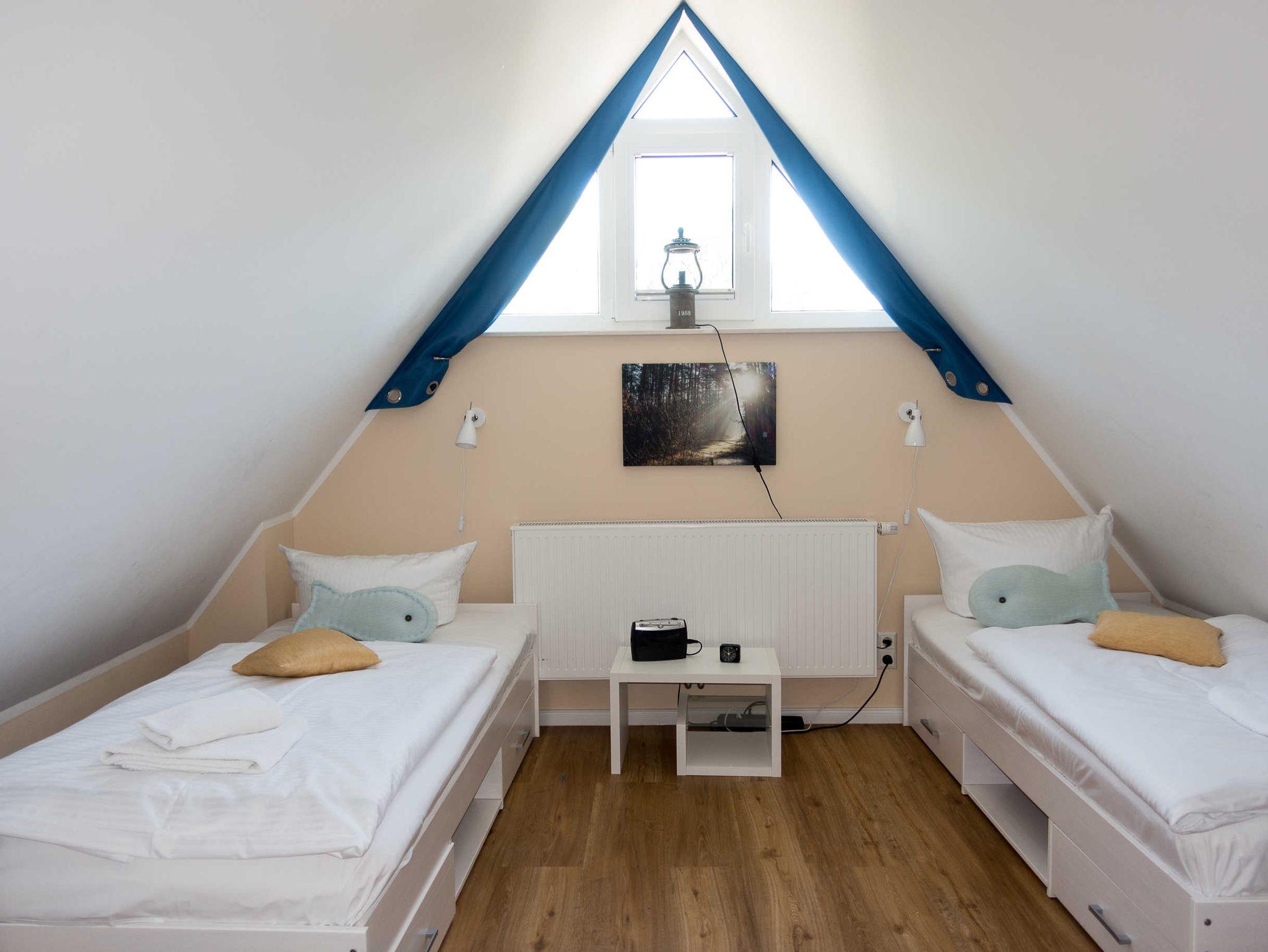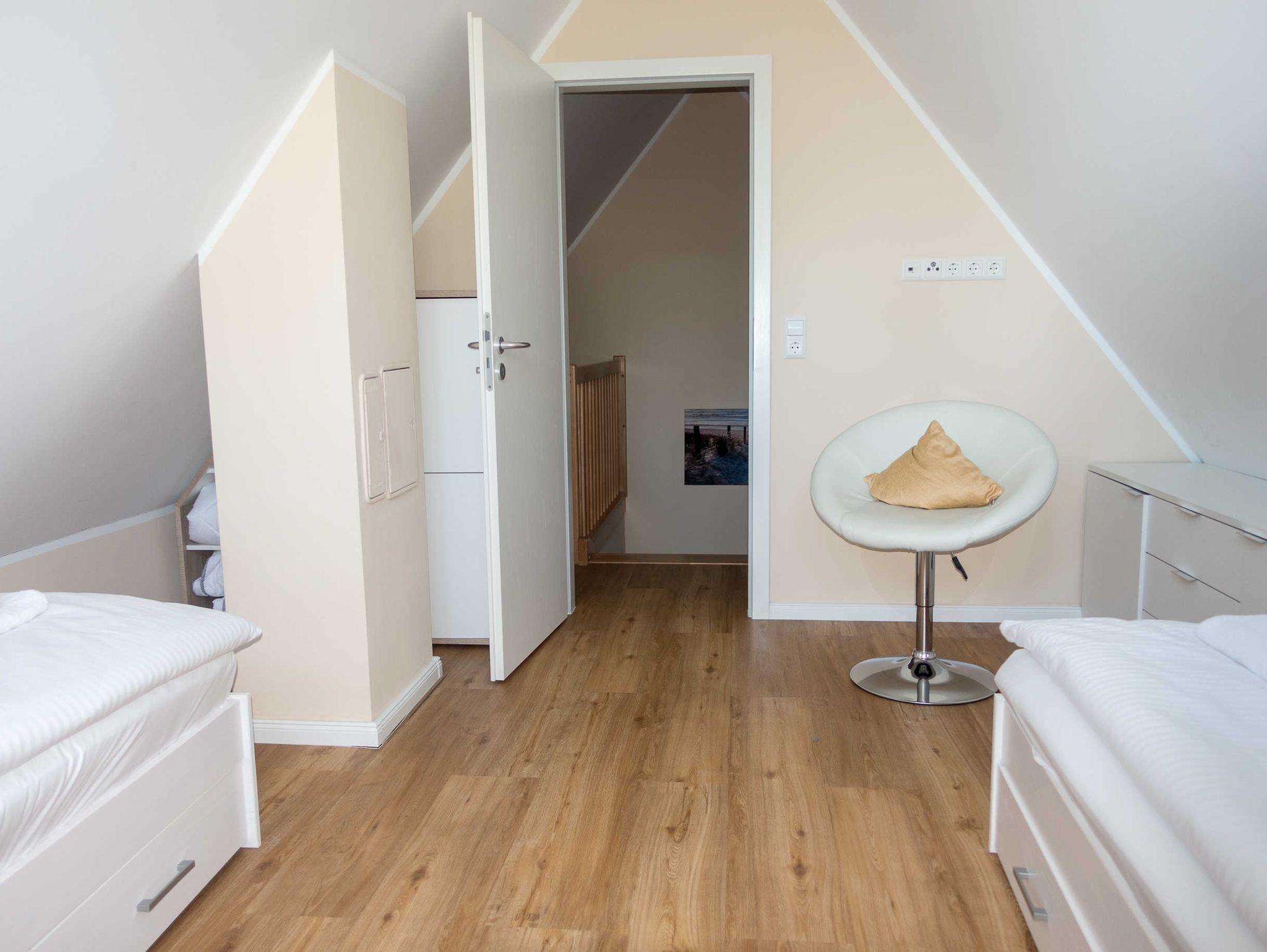 Das Premiumhaus Bodden verbindet Gemütlichkeit und Wohlbefinden. Es verfügt im Obergeschoss über zwei Schlafzimmer mit bequemen Boxspring-Doppelbetten. Zusätzlich hat jedes Schlafzimmer einen Smart-TV. Im geräumigen Dachgeschoss stehen zwei weitere Einzel-Betten zur Verfügung, die als Aufbettung genutzt werden können.