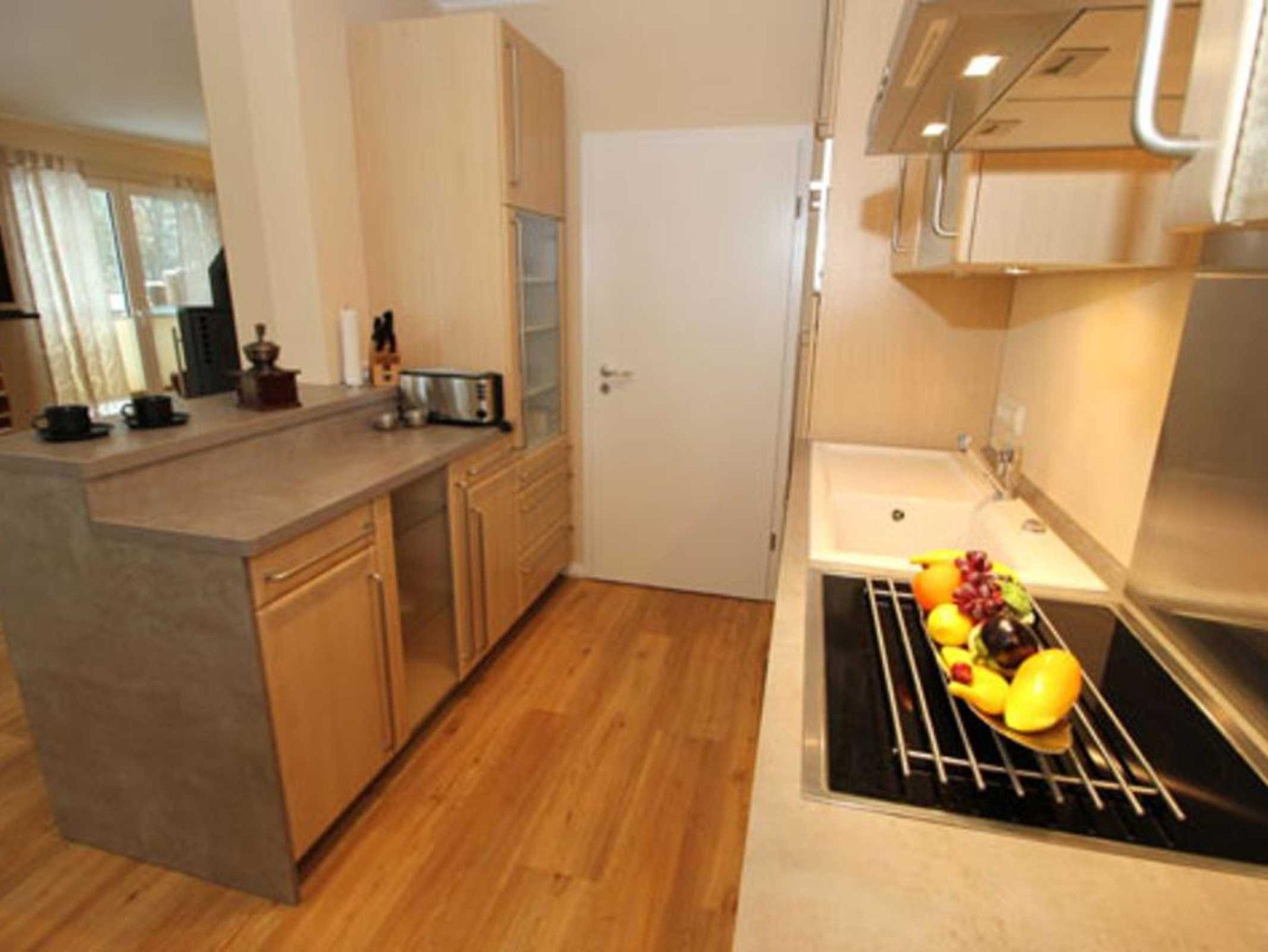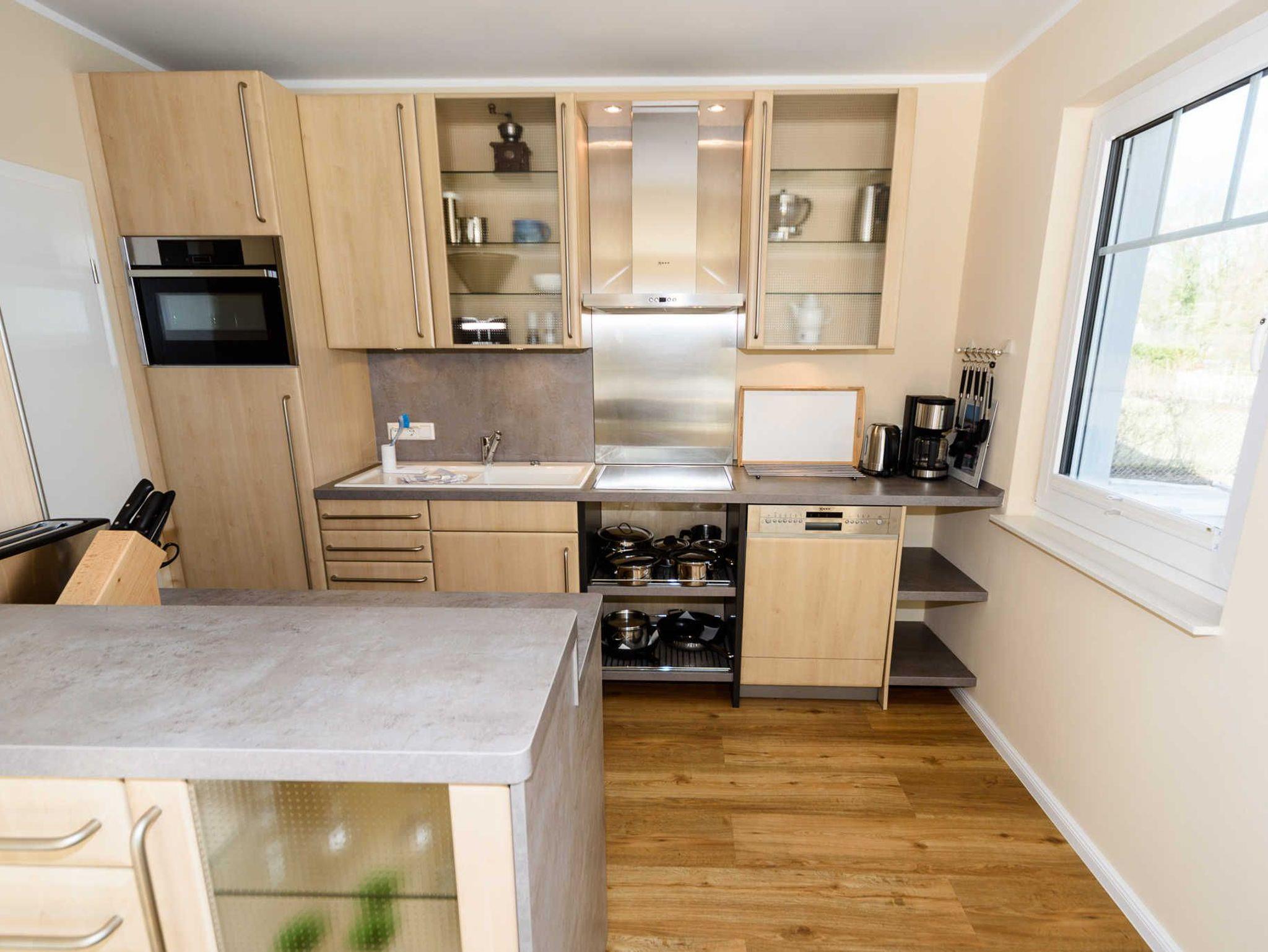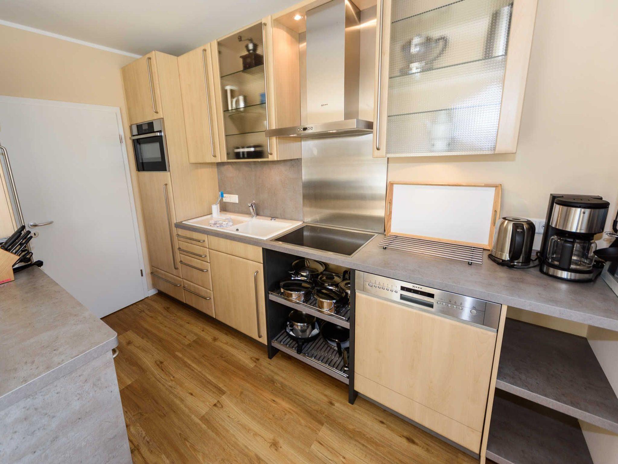 Die offene Küche lädt zum gemütlichen Beisammensein ein. Das Cerankochfeld und der Kombi-Backofen mit Mikrowellenfunktion, die leistungsfähige Ablufthaube, sowie der Geschirrspüler und ein großer Kühlschrank mit Gefrierfach und Null-Grad Zone machen das Kochen zum Vergnügen.