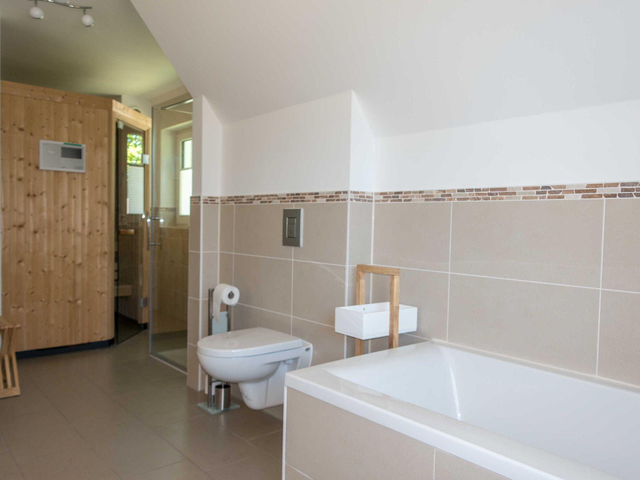 Zwei geräumige, fußbodenbeheizte Badezimmer mit Duschen und einer großen Badewanne laden zum Wellnessgenuss ein. Zusätzlich können sie sich, in der hauseigenen Sauna für 4 Personen, entspannen. Da nicht alle Gäste Saunagänger sind, haben wir uns -im Hinblick auf die faire Verteilung der Kosten- entschlossen, die Saunanutzung als Buchungsoption für ihren Aufenthalt separat anzubieten.