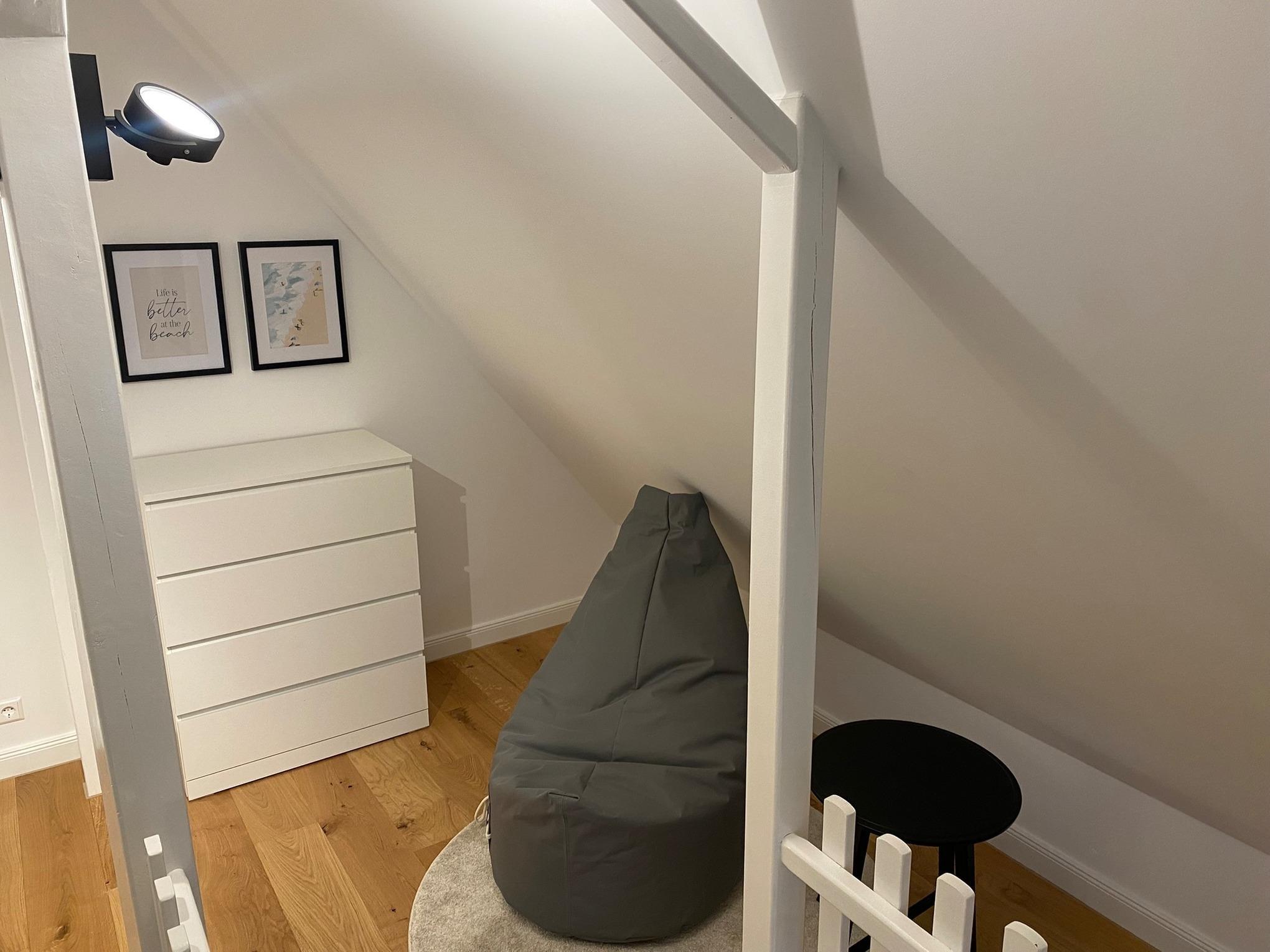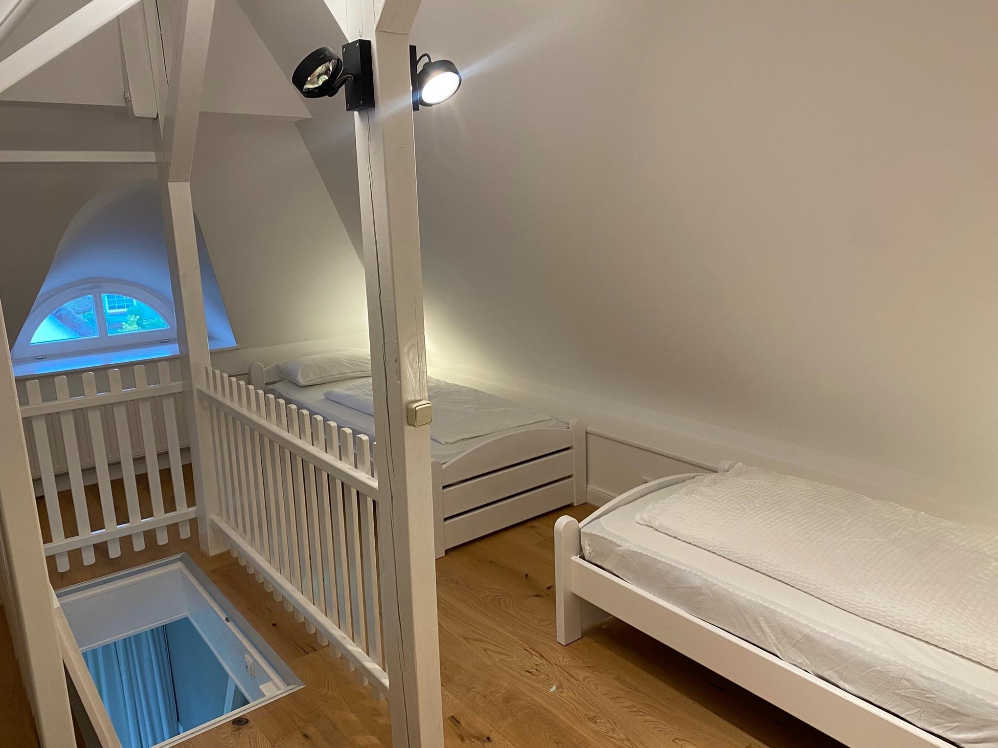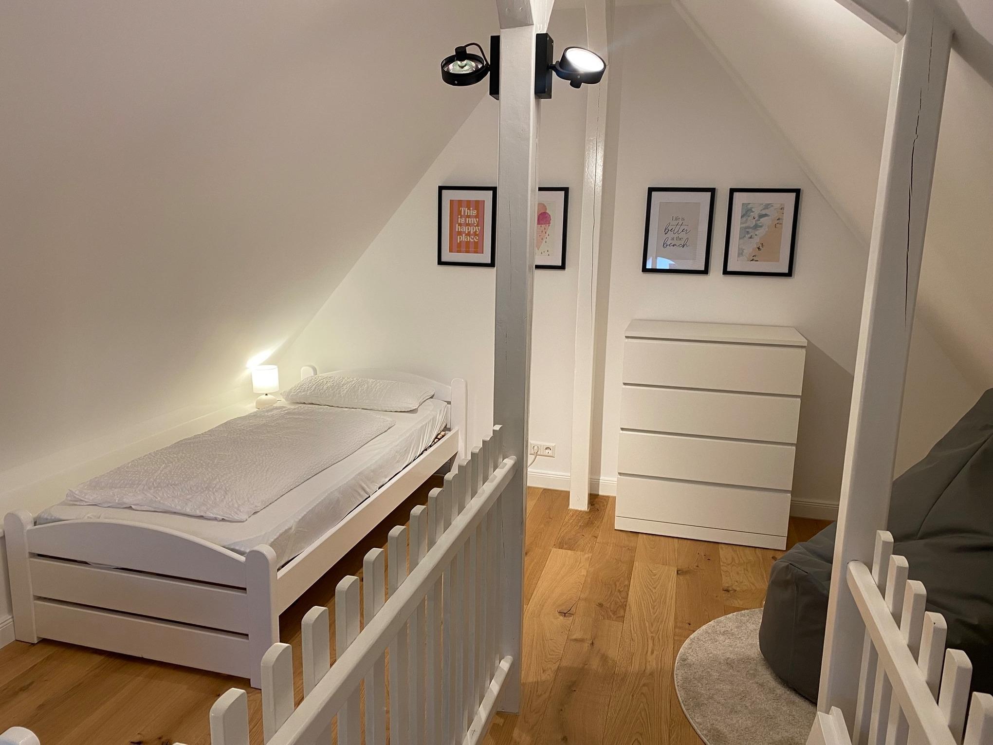 Unsere in 2025 komplett modernisierte Ferienwohnung liegt im 1. Oberschoss und hat einen Balkon. Sie ist ca. 56 qm groß, verfügt über ein separates Schlafzimmer, ein Duschbad sowie eine vollausgestattete Küchenzeile im Wohnbereich. Im Spitzboden befindet sich ein weiteres Schlafzimmer für zwei Kinder (nur über eine Raumspartreppe zu erreichen, daher Mindestalter 6 Jahre).