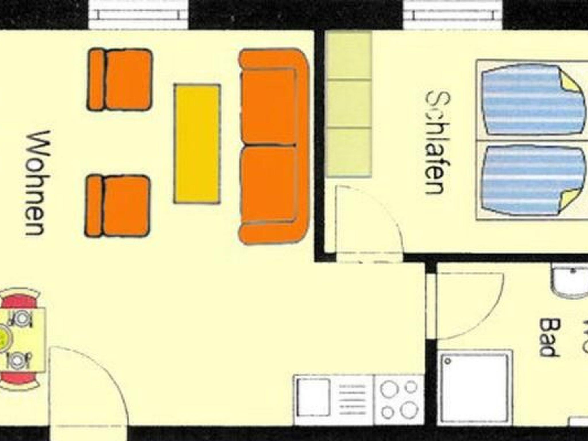 Unsere Ferienwohnung bietet auf ca. 40 m² Wohnfläche reichlich Platz für 2 Personen, zumal besonders der Wohnbereich großzügig angelegt ist. Zur Ferienwohnung gehören 1 Schlafzimmer, das große Wohnzimmer, eine integrierte Küchenzeile und Bad/WC. Die Ferienwohnung ist komfortabel und stilvoll eingerichtet und verfügt im gesamten Wohnbereich über eine Fußbodenheizung. Neben der Couchsitzgruppe gibt es im Wohnzimmer einen zusätzlichen Esstisch. Sat/Farb-TV mit Flachbildschirm, Stereo-Anlage (Radio, CD-Player) und Internet-Zugang gehören ebenfalls zur Ausstattung. Die kleine Küche ist komplett mit Plattenherd, Kühlschrank, Kaffeemaschine, Toaster, Eierkocher ausgestattet. Geschirr ist natürlich ebenfalls vorhanden.