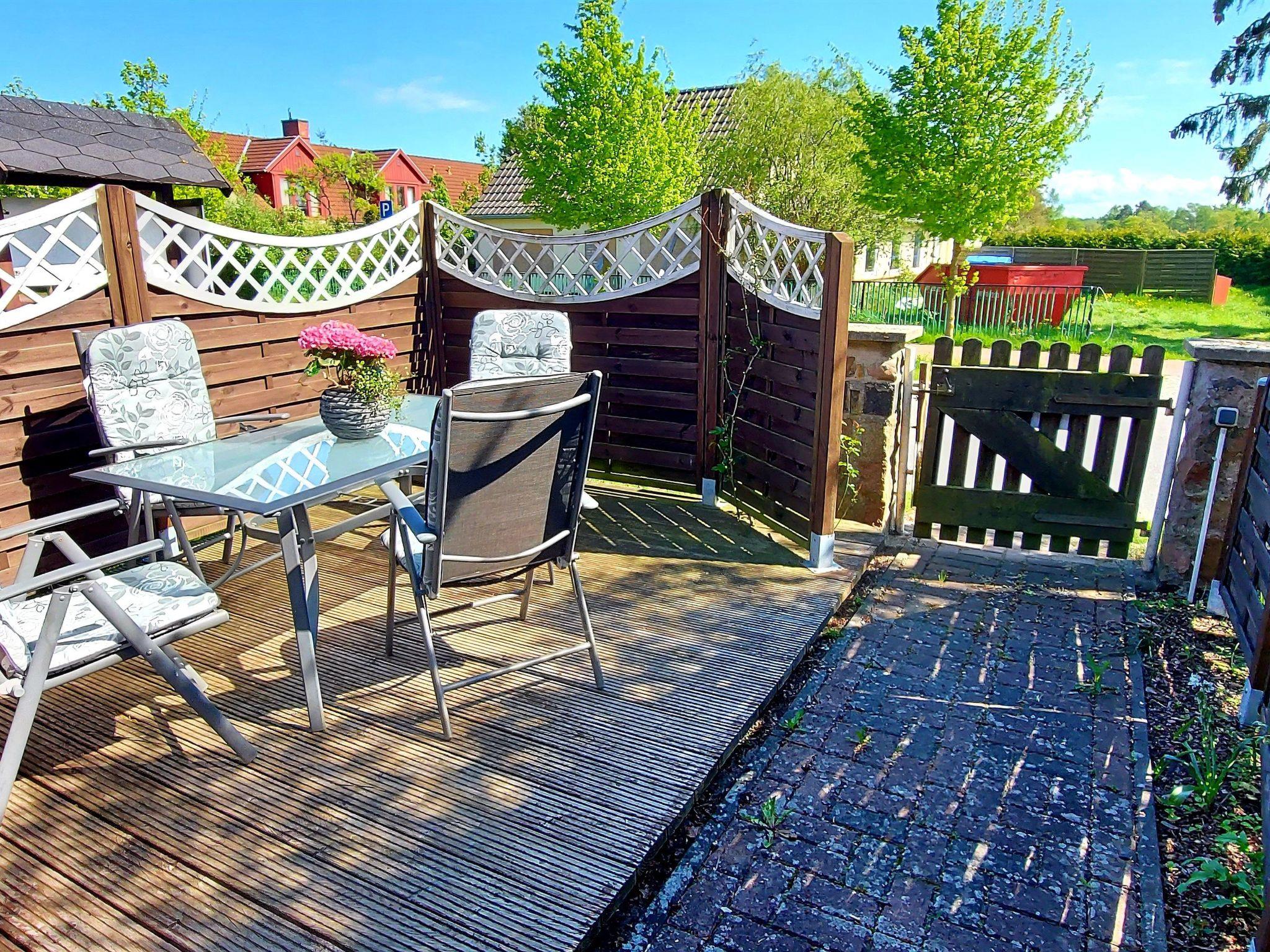 Der Außenbereich der Ferienwohnung, direkt am Haus und zur Straße hin gelegen, verfügt über eine Terrasse. Hier können Gäste gemütliche Abendstunden verbringen oder den Tag bei einer Tasse Kaffee langsam starten. Die Terrasse bietet sich als perfekter Ort an, um die ruhige Umgebung und die frische Ostseeluft zu genießen.
