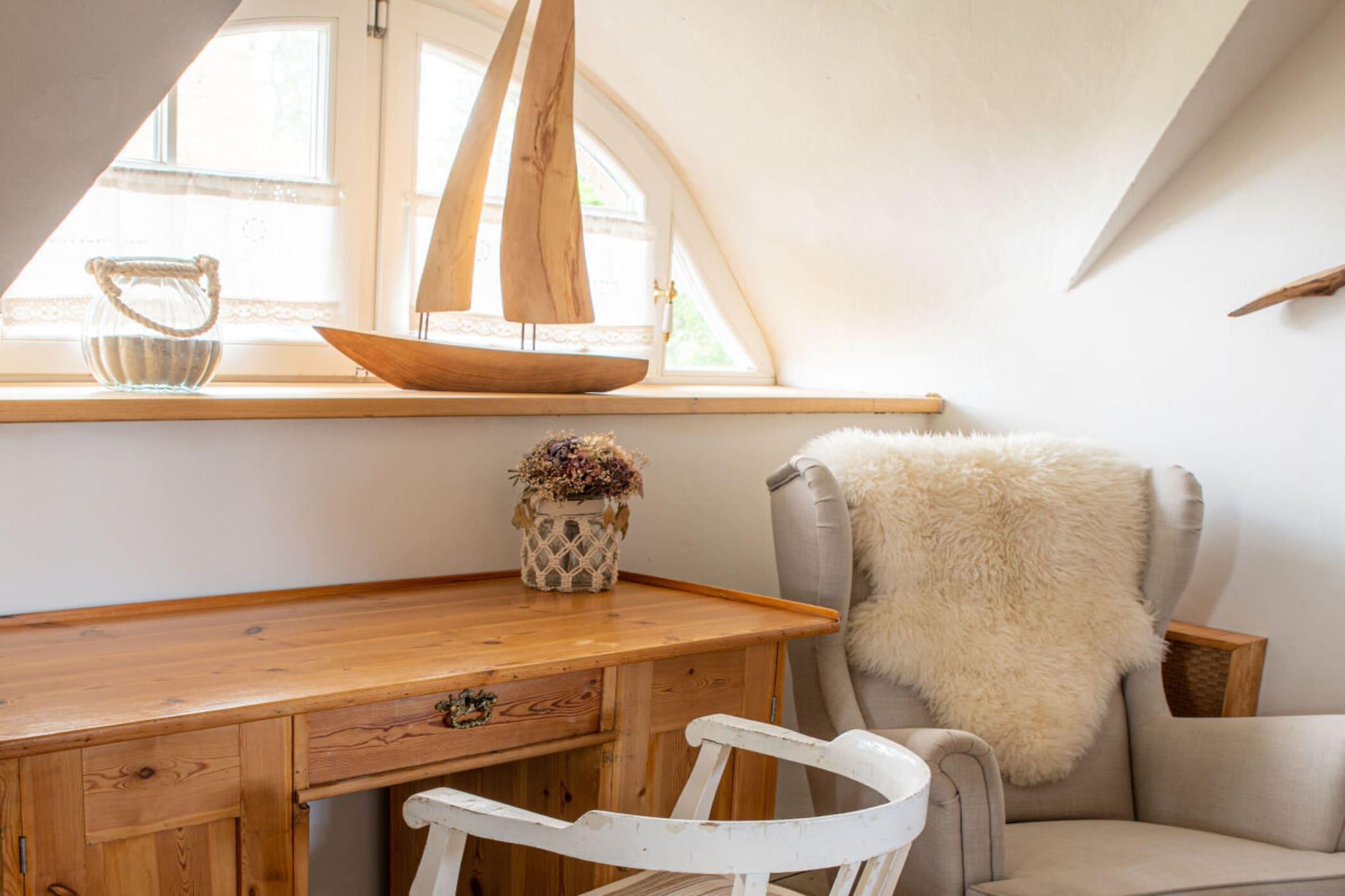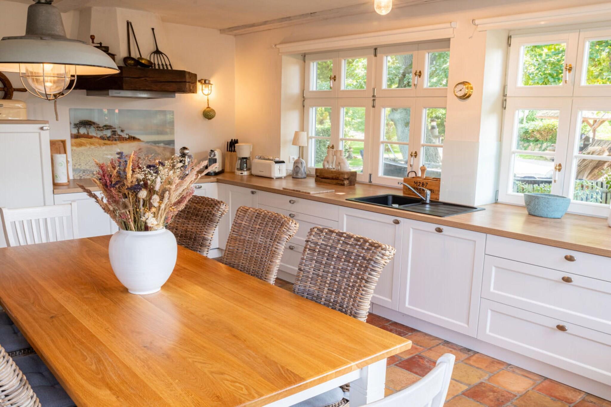 In diesem komfortablen neuen Ferienhaus ist viel Platz für bis zu 8 Personen auf zwei Etagen. Das Haus wurde ausschließlich aus ökologischen Naturbaustoffen in traditioneller darßtypischer Bauweise errichtet und ist im maritimen Ambiente eingerichtet. Das Haus wurde innen komplett mit Lehm verputzt und ist so besonders gesundheitsfördernd, da Lehmputz die Luftfeuchtigkeit ausgleicht und zusätzlich Schadstoffe aus der Luft aufnimmt. Es wartet auf Sie eine komplett ausgestattete große Küche, viele Rückzugsmöglichkeiten, ein Kamin, eine Sauna, hochwertige Geräte und Betten. Außenbereich: 900qm großen Garten inkl eigenen Kräutergarten, Saunahütte, zwei Terrassen und eine große Dachterrasse mit Panoramablick über den Garten auf die Pferdekoppel.