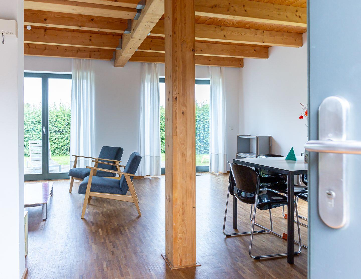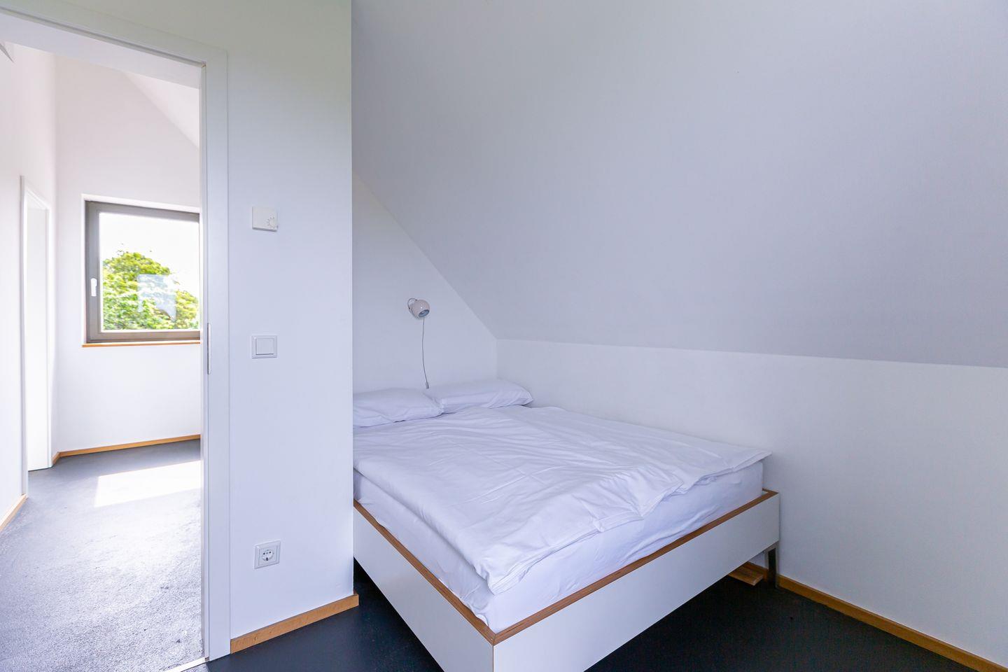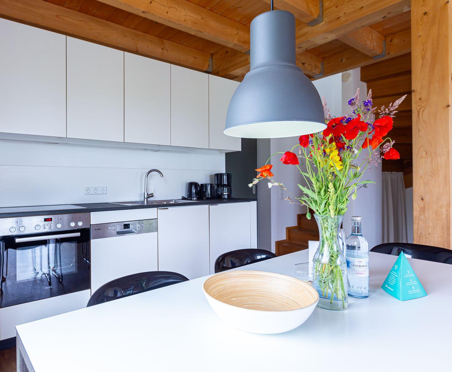 Eine moderne Architektur und ökologische Holzbauweise sind charakteristisch für dieses Landhaus nahe der Ostsee. Im Erdgeschoss erwartet dich ein großzügiger und lichtdurchfluteter Wohnraum mit klarem Design und retroinspirierten Möbeln. Mit der Holzbalkenkonstruktion in der Decke und dem Echtholzparkett wird das Naturmaterial Holz auch im Innenbereich wieder aufgegriffen und sorgt für eine tolle Wohnatmosphäre. Die Küchenzeile und der große Esstisch fügen sich harmonisch in den Wohnbereich ein. Ein begehbare Garderobe befindet sich ebenfalls auf der unteren Etage. Im Obergeschoss erwarten dich zwei cleane Schlafzimmer, die jeweils mit einem Doppelbett (180 cm und 140 cm) ausgestattet sind - handgefertigt vom Tischler. Ein modernes Badezimmer mit Dusche/WC rundet das Urlaubsdomizil perfekt ab.