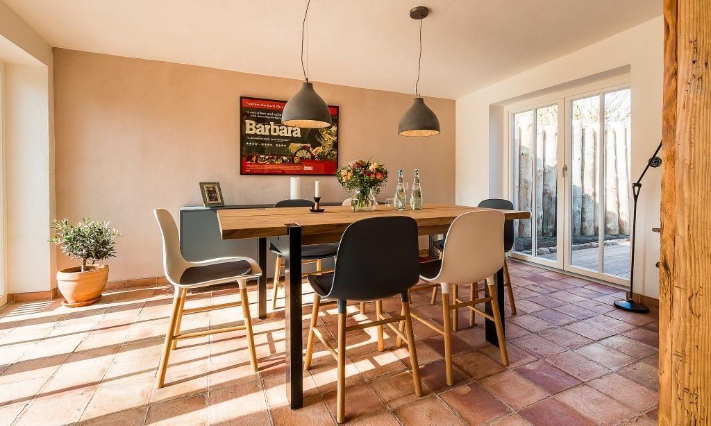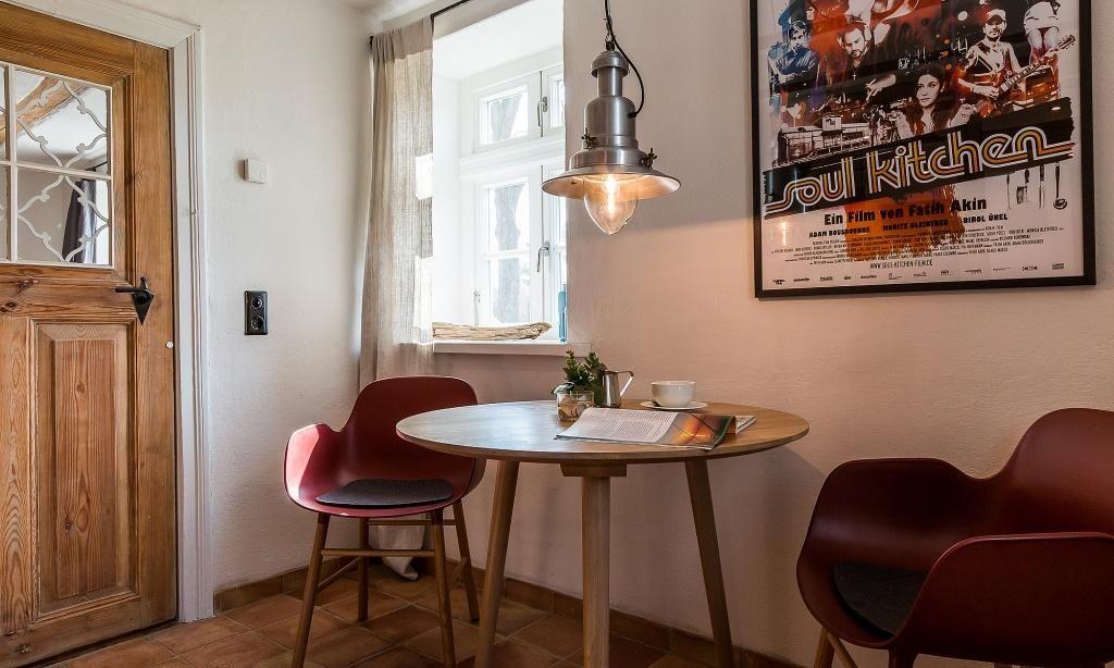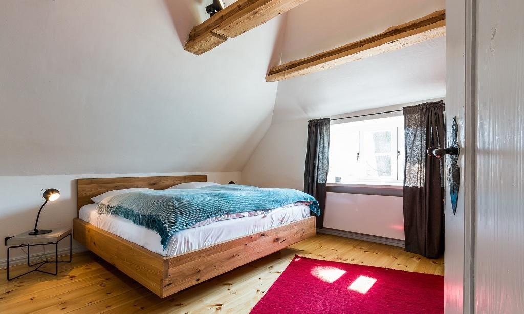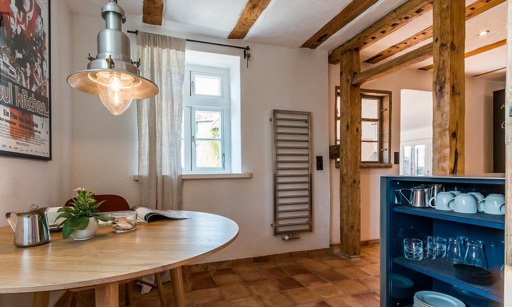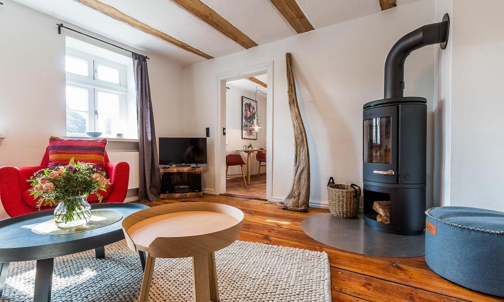 Mit viel Liebe zum Detail wurde diese denkmalgeschützte Büdnerei restauriert. Viele alte Elemente wurden erhalten und versprechen eine kleine Zeitreise, mit den alten Fenstern im Innenbereich, den liebevoll aufbereiteten alten Holztüren und dem ortstypischen Fachwerk. Den historischen Elementen wurden teilweise sehr moderne Ausstattungsdetails gegenüber gestellt, so dass sich ein spannender und doch harmonischer Kontrast von Alt und Neu ergibt. Im Erdgeschoss erwartet dich neben dem geräumigen Eingangsbereich eine hochwertige und voll ausgestattete Küche mit einem kleinen Esstisch. Hier kann nach Herzenslust gekocht und geklönt werden. Eine kleine Stufe führt dich in die lichtdurchflutete Veranda mit dem großen Esstisch, der viel Platz für Spieleabende mit der ganzen Familie bietet. An die Küche grenzt der moderne Wohnraum, der mit seiner bequemen Couch am Kaminofen entspannte Stunden verspricht. Ein wunderschön gestaltetes Schlafzimmer mit einem Doppelbett befindet sich ebenfalls ebenerdig. Auch das stylische Bad ist mit alten und modernen Elementen ausgestattet. Die bodengleiche Dusche und die Fußbodenheizung garantieren einen hohen Standard und absolutes Wohlfühlen. Ins Obergeschoss gelangest du über eine steile Stiege, welche aus Denkmalschutzgründen erhalten blieb. Die Treppe ist für gehbehinderte Gäste nicht geeignet. Bei Kindern wird hier um erhöhte Aufmerksamkeit gebeten. Oben angekommen, befinden sich zwei weitere Schlafzimmer. Urgemütlich und modern sind auch diese mit Doppelbetten und Stauraum ausgestattet. Ein zusätzliches Bad mit Badewanne/WC und Fußbodenheizung rundet diese Etage ab.