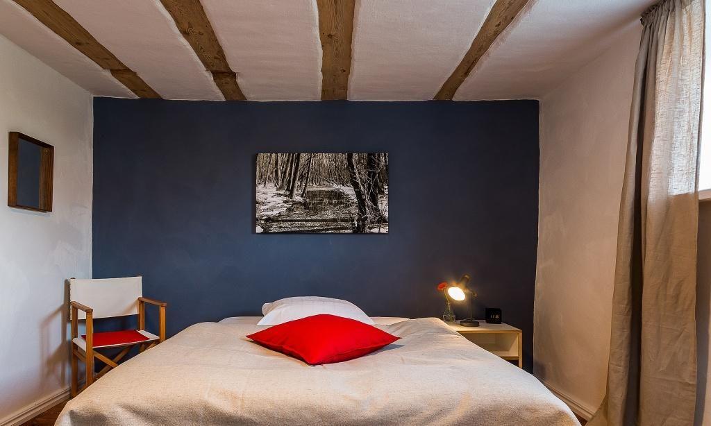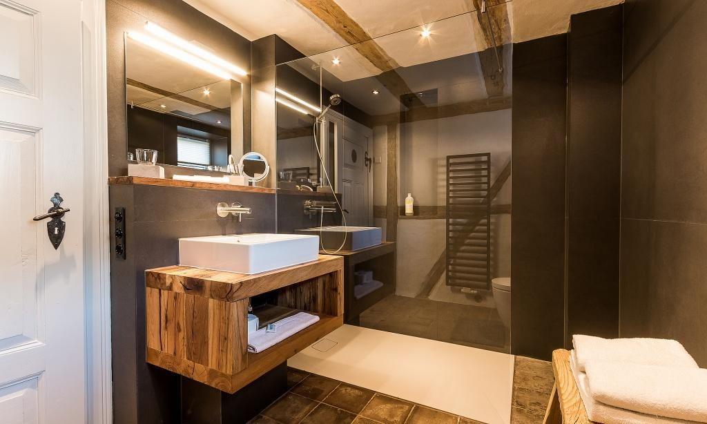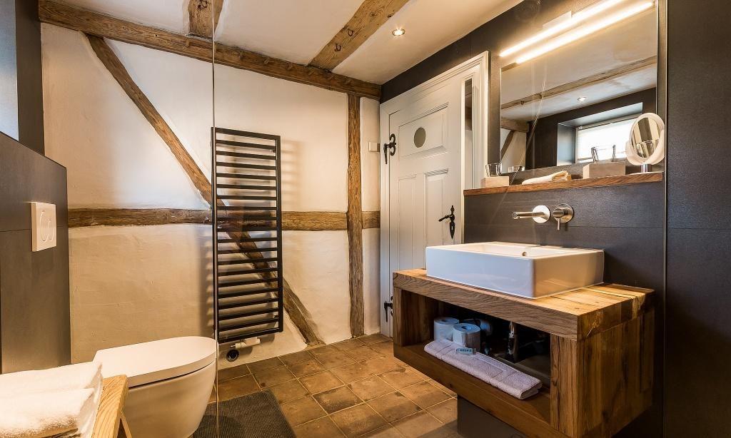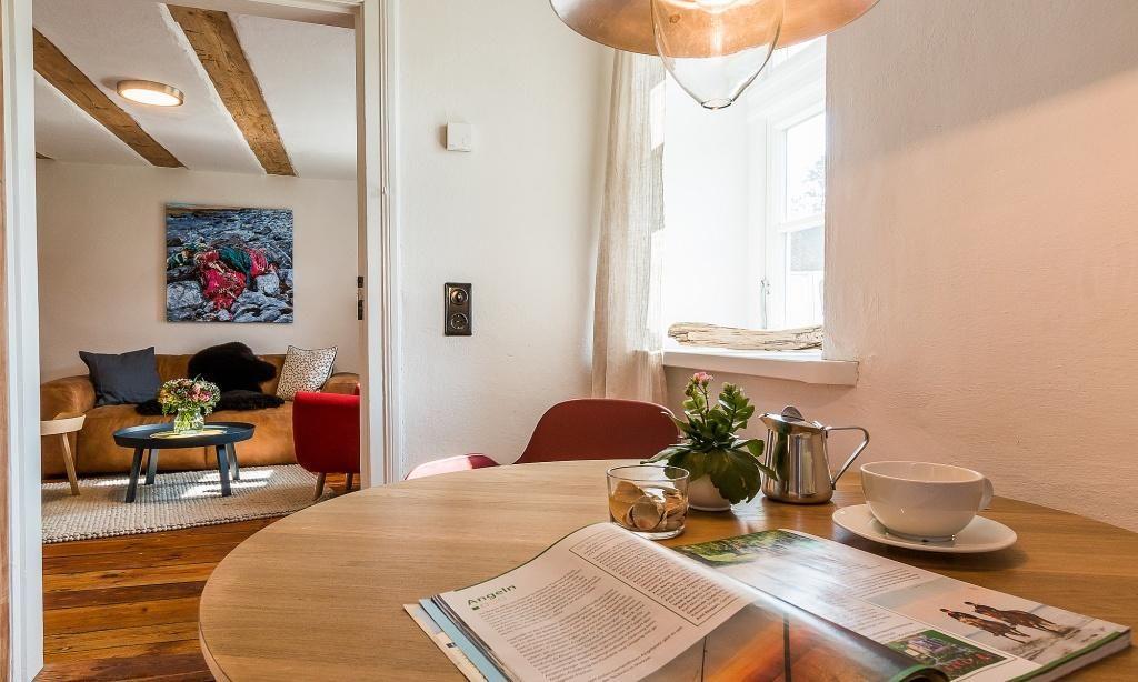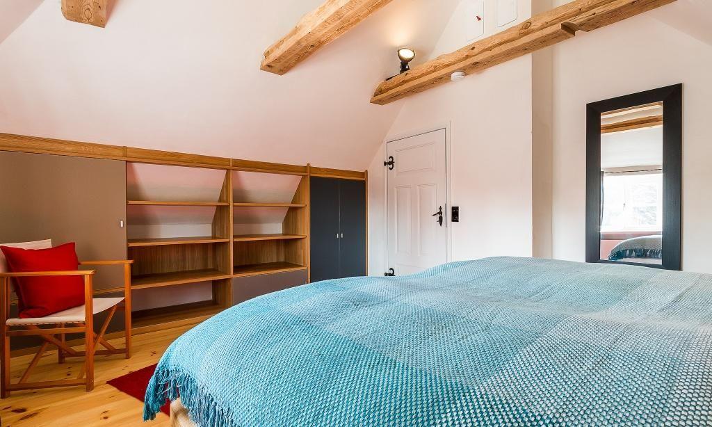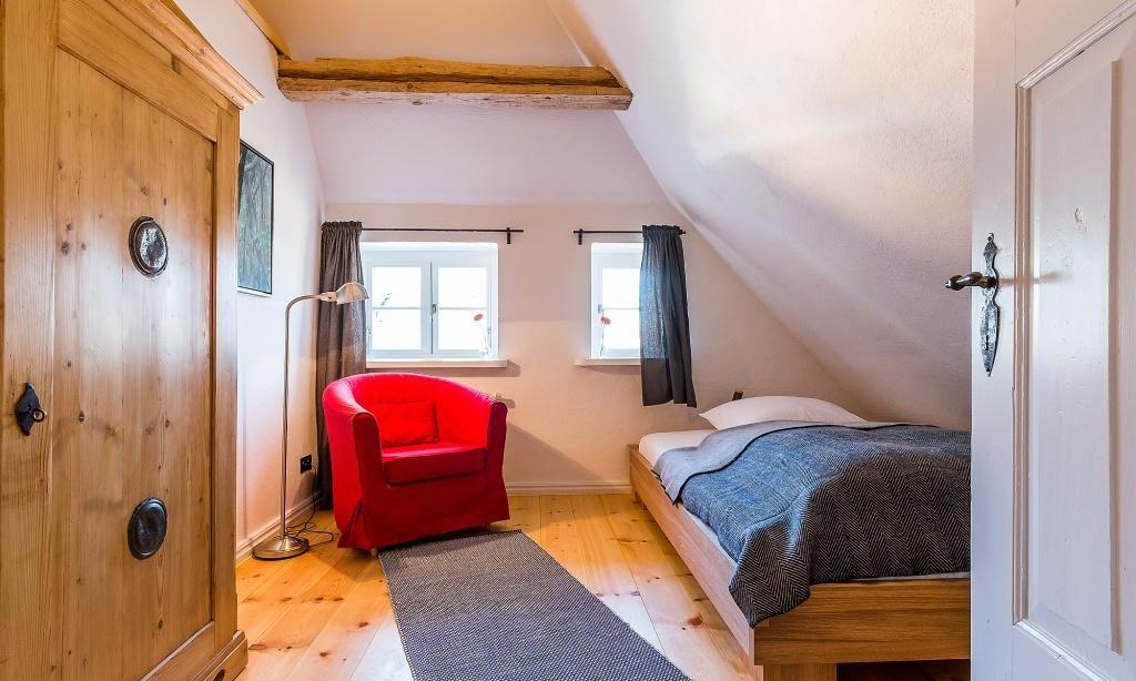 Mit viel Liebe zum Detail wurde diese denkmalgeschützte Büdnerei restauriert. Viele alte Elemente wurden erhalten und versprechen eine kleine Zeitreise, mit den alten Fenstern im Innenbereich, den liebevoll aufbereiteten alten Holztüren und dem ortstypischen Fachwerk. Den historischen Elementen wurden teilweise sehr moderne Ausstattungsdetails gegenüber gestellt, so dass sich ein spannender und doch harmonischer Kontrast von Alt und Neu ergibt. Im Erdgeschoss erwartet dich neben dem geräumigen Eingangsbereich eine hochwertige und voll ausgestattete Küche mit einem kleinen Esstisch. Hier kann nach Herzenslust gekocht und geklönt werden. Eine kleine Stufe führt dich in die lichtdurchflutete Veranda mit dem großen Esstisch, der viel Platz für Spieleabende mit der ganzen Familie bietet. An die Küche grenzt der moderne Wohnraum, der mit seiner bequemen Couch am Kaminofen entspannte Stunden verspricht. Ein wunderschön gestaltetes Schlafzimmer mit einem Doppelbett befindet sich ebenfalls ebenerdig. Auch das stylische Bad ist mit alten und modernen Elementen ausgestattet. Die bodengleiche Dusche und die Fußbodenheizung garantieren einen hohen Standard und absolutes Wohlfühlen. Ins Obergeschoss gelangest du über eine steile Stiege, welche aus Denkmalschutzgründen erhalten blieb. Die Treppe ist für gehbehinderte Gäste nicht geeignet. Bei Kindern wird hier um erhöhte Aufmerksamkeit gebeten. Oben angekommen, befinden sich zwei weitere Schlafzimmer. Urgemütlich und modern sind auch diese mit Doppelbetten und Stauraum ausgestattet. Ein zusätzliches Bad mit Badewanne/WC und Fußbodenheizung rundet diese Etage ab.