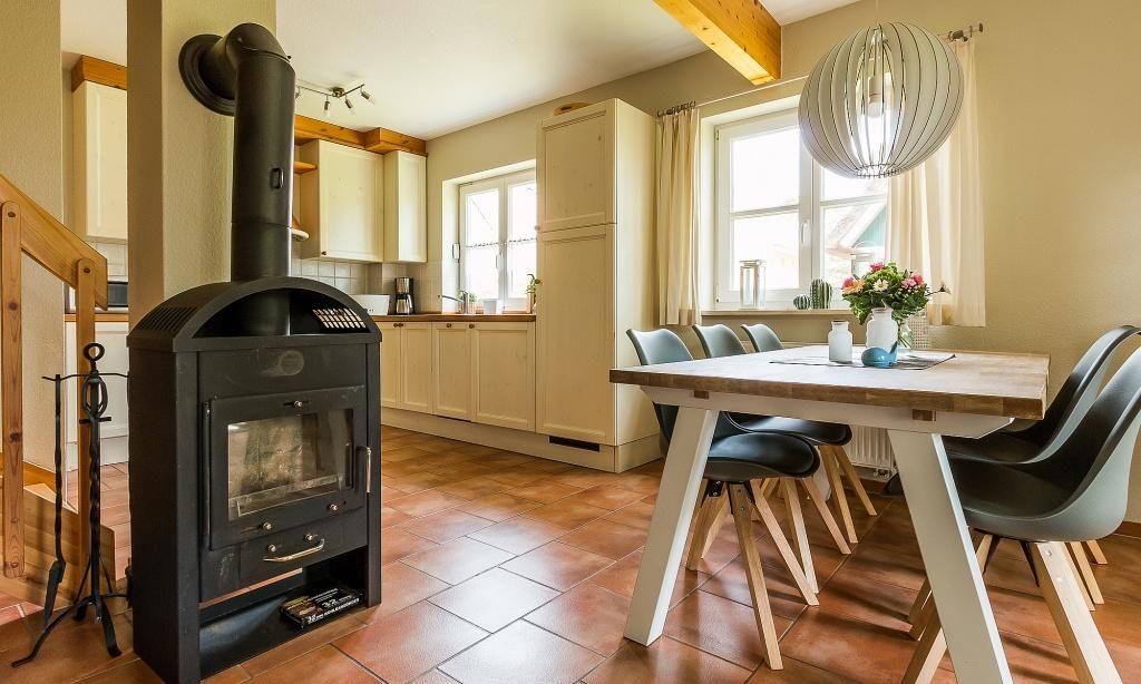 Das Erdgeschoss verfügt über einen Wohnraum mit einer gemütlichen Sitzecke am Kaminofen. Die Küchenzeile mit angrenzendem Essbereich ist direkt in den Wohnbereich integriert und schafft einen offenen Wohncharakter. Ein Bad mit Dusche/WC findet ebenfalls im Erdgeschoss Platz. Im Obergeschoss befinden sich zwei Schlafzimmer, die jeweils mit Doppelbetten ausgestattet sind sowie ein Bad mit Dusche / WC. Zwei weitere Einzelbetten findest du in der offenen Schlafgalerie im Dachgeschoss.