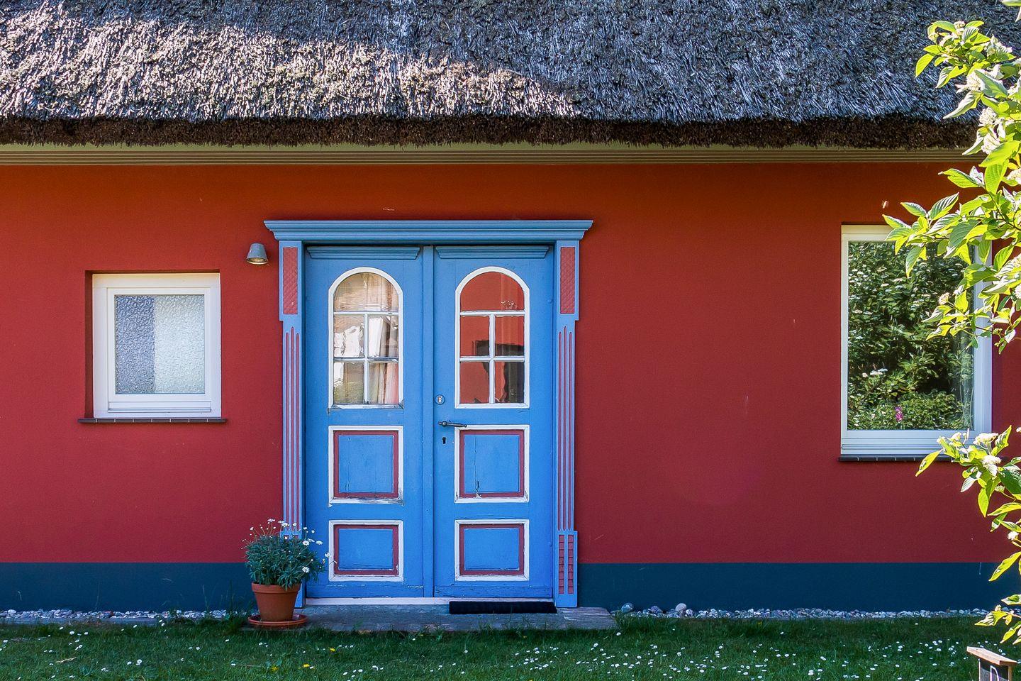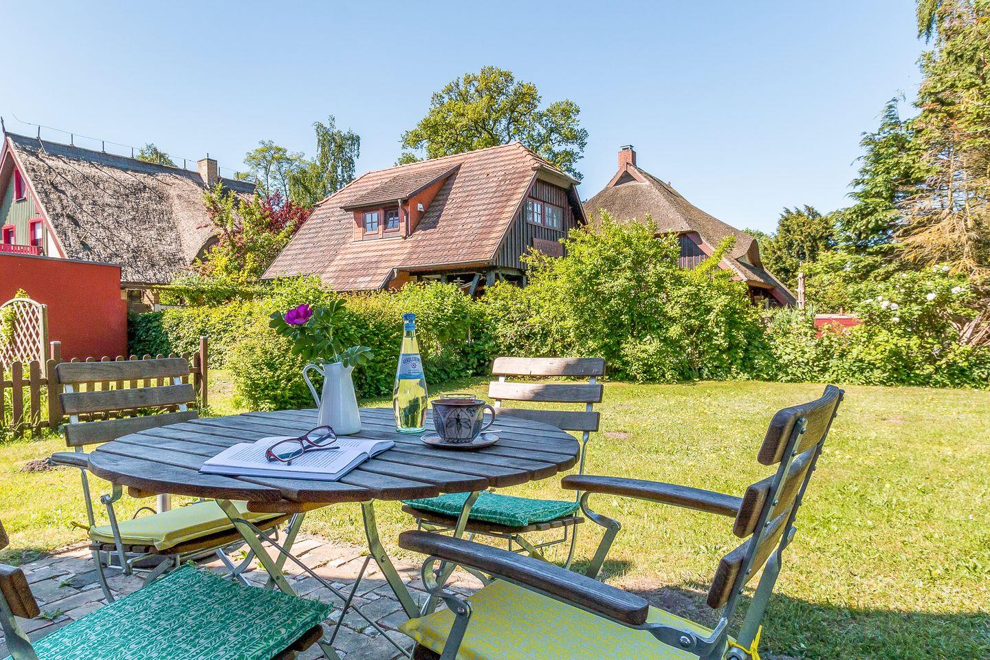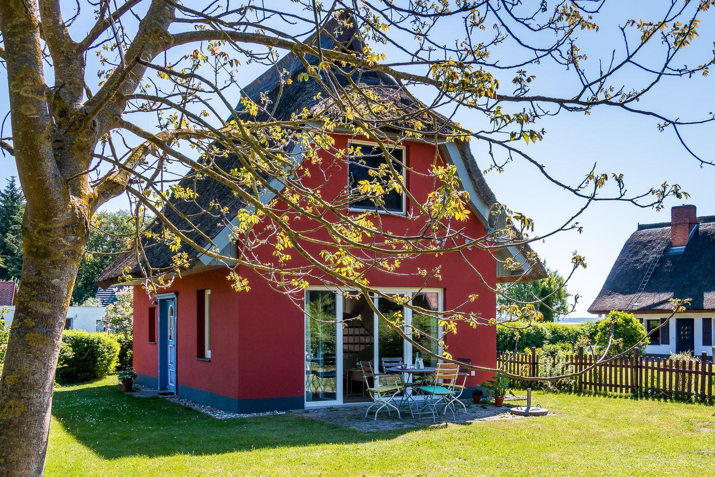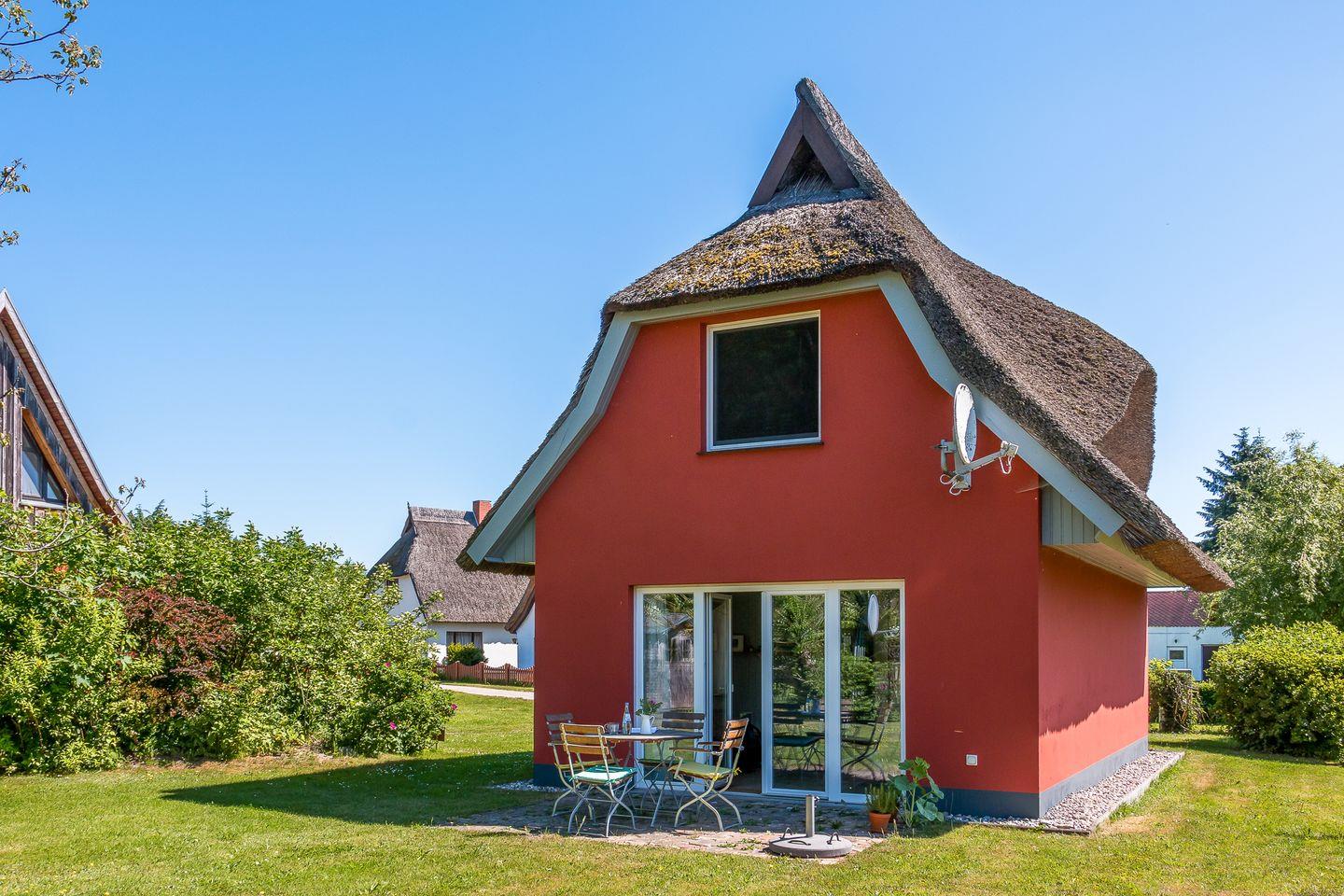Gemütliches Ferienhaus mit Reetdach und Boddenblick in Born am Darß, ideal für erholsame Tage nahe Wasser und Natur.