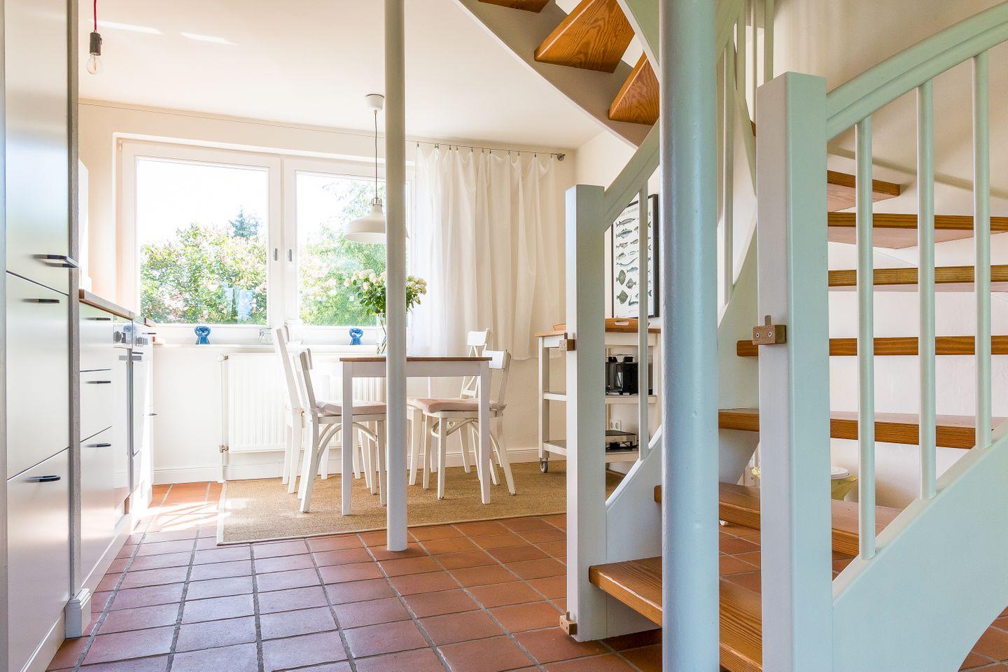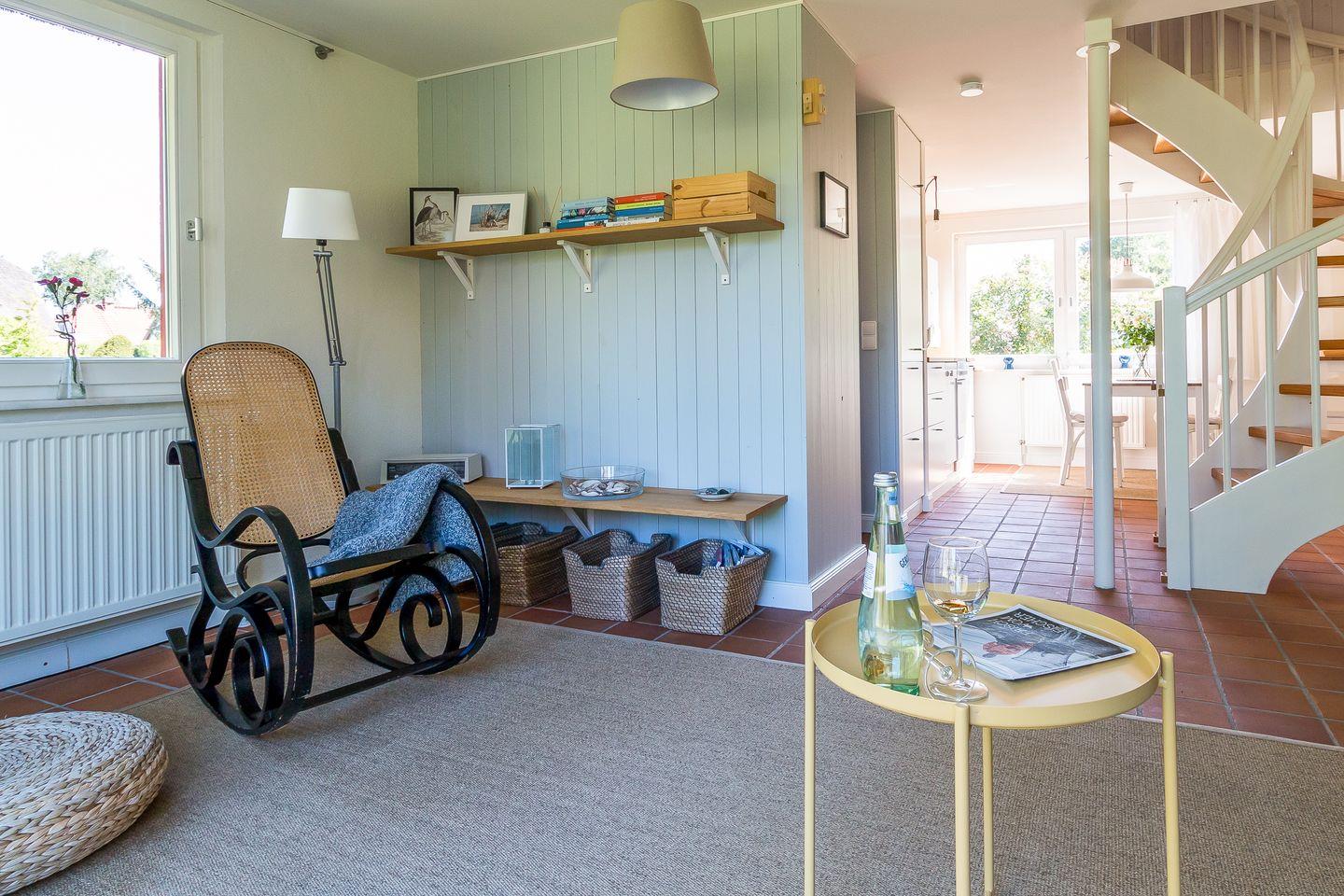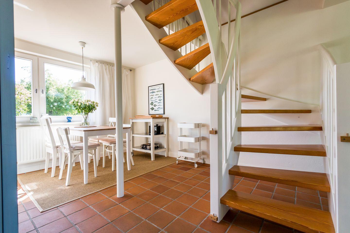 Freue dich auf dieses kleine Ferienhaus, es wurde im Jahr 2017 liebevoll renoviert und komplett neu ausgestattet. Im Erdgeschoss betritt man zunächst einen Windfang mit Garderobe und Gäste-WC. Von dort aus geht es direkt über in den offenen Wohnbereich mit Sofa und Schaukelstuhl. Die Küche und der Esstisch sind ebenfalls im Wohnbereich integriert. Auf der Westseite liegt der Zugang zur Terrasse und zum Garten. Im Dachgeschoss befindet sich ein Schlafzimmer mit einem Doppelbett. Im Vorraum baulich abgeschirmt befindet sich zudem eine halboffene Schlafkoje. Das Bad mit Badewanne und WC fügt sich harmonisch ins Obergeschoss ein.