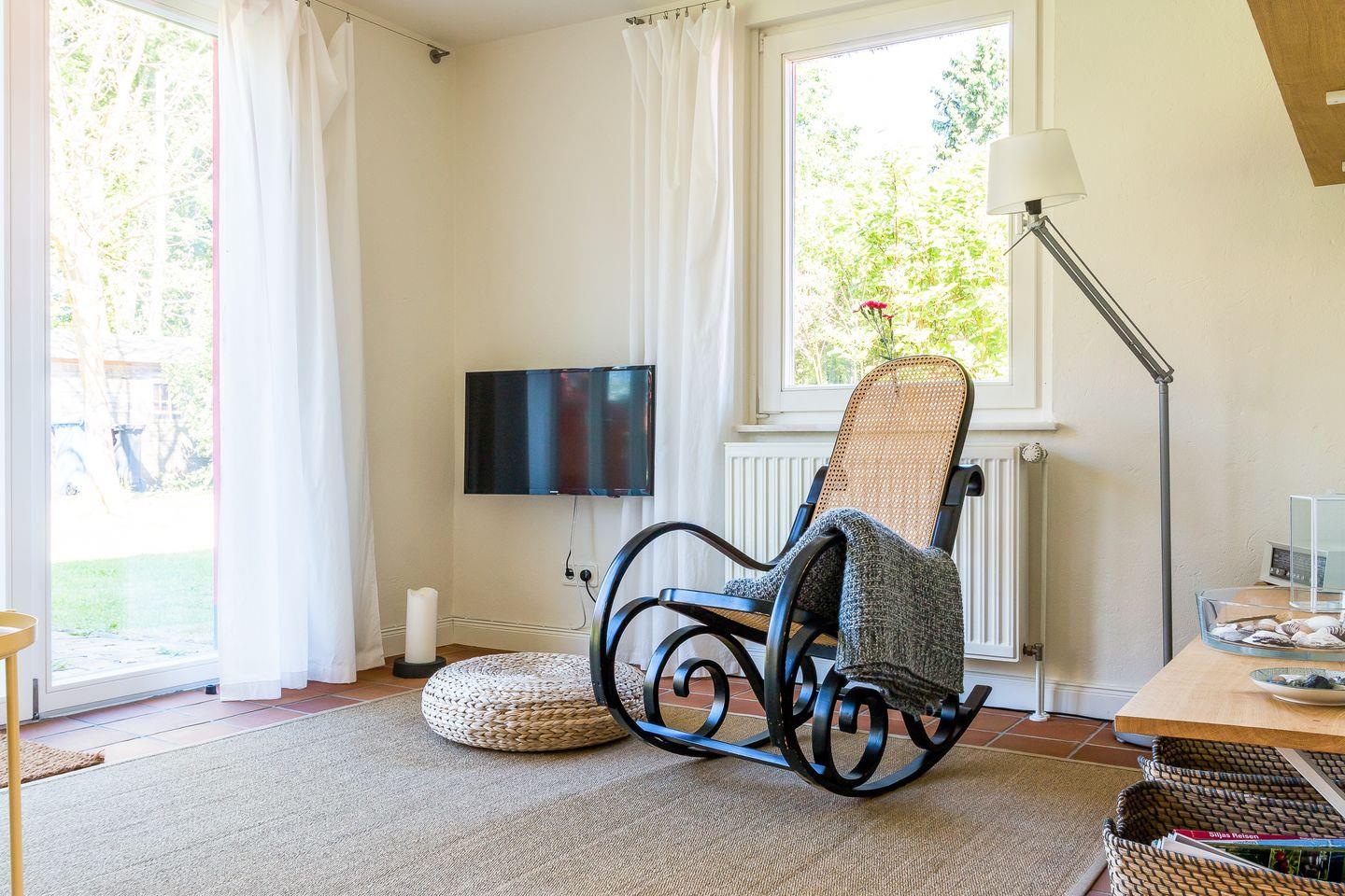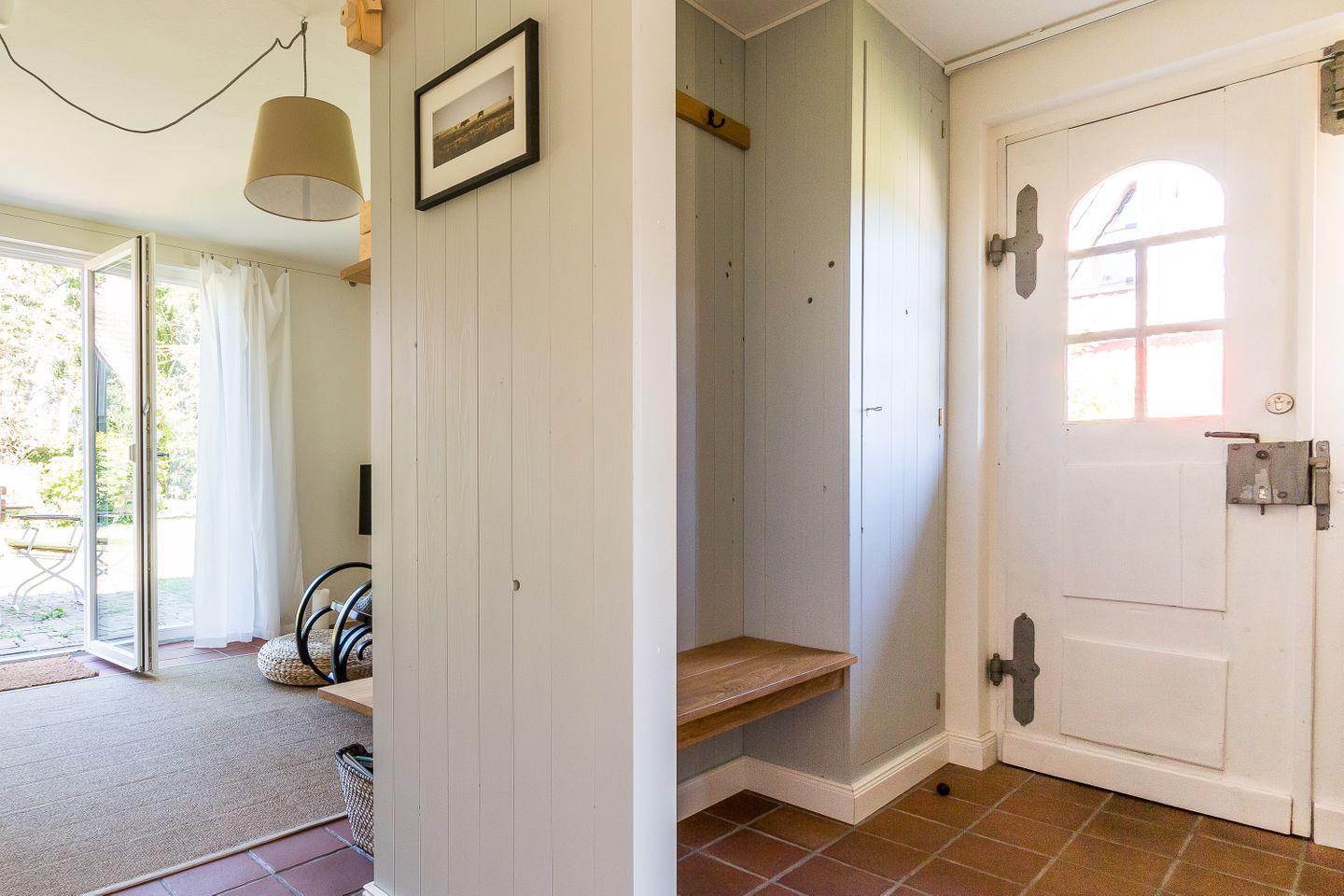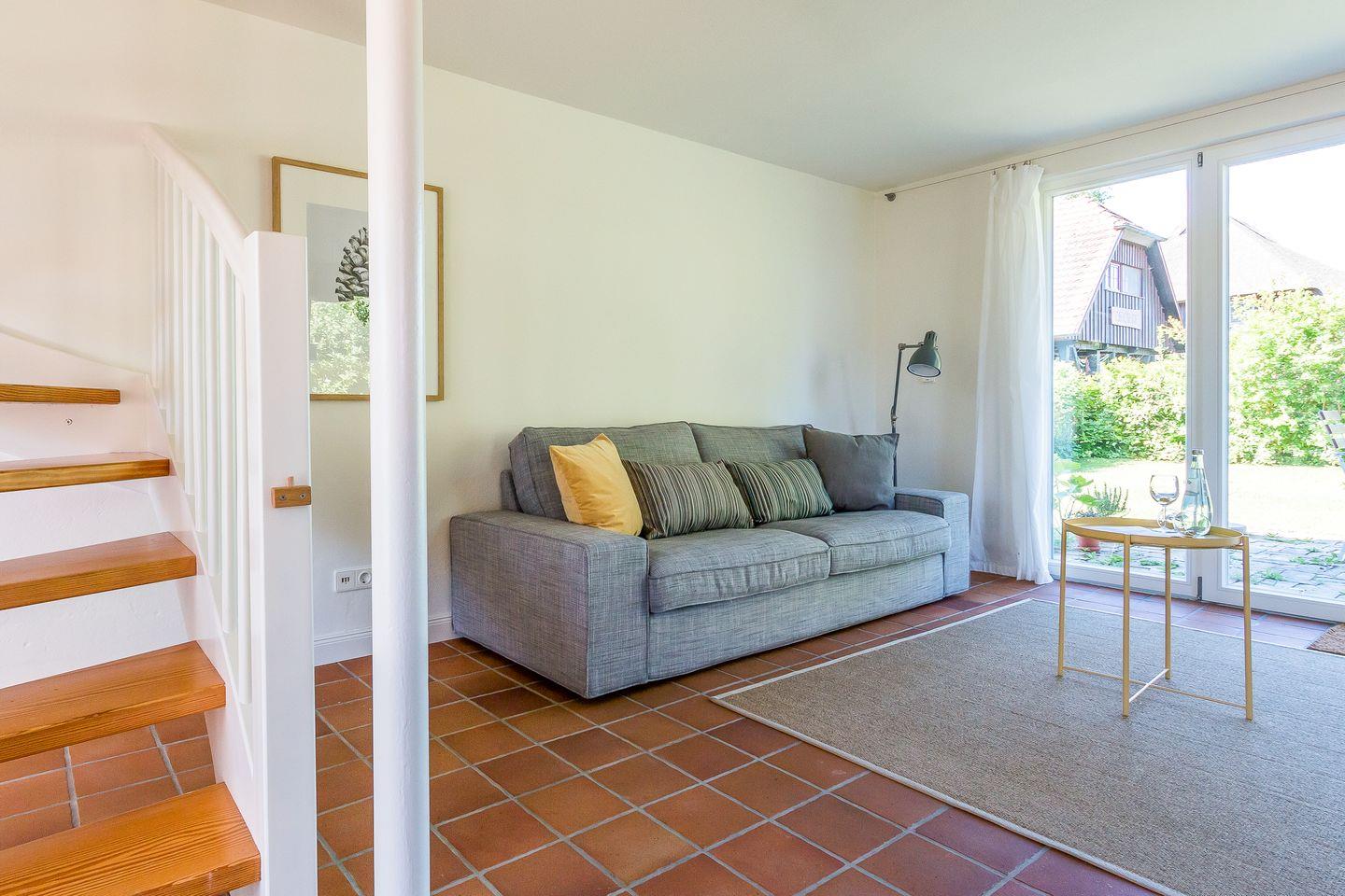 Freue dich auf dieses kleine Ferienhaus, es wurde im Jahr 2017 liebevoll renoviert und komplett neu ausgestattet. Im Erdgeschoss betritt man zunächst einen Windfang mit Garderobe und Gäste-WC. Von dort aus geht es direkt über in den offenen Wohnbereich mit Sofa und Schaukelstuhl. Die Küche und der Esstisch sind ebenfalls im Wohnbereich integriert. Auf der Westseite liegt der Zugang zur Terrasse und zum Garten. Im Dachgeschoss befindet sich ein Schlafzimmer mit einem Doppelbett. Im Vorraum baulich abgeschirmt befindet sich zudem eine halboffene Schlafkoje. Das Bad mit Badewanne und WC fügt sich harmonisch ins Obergeschoss ein.
