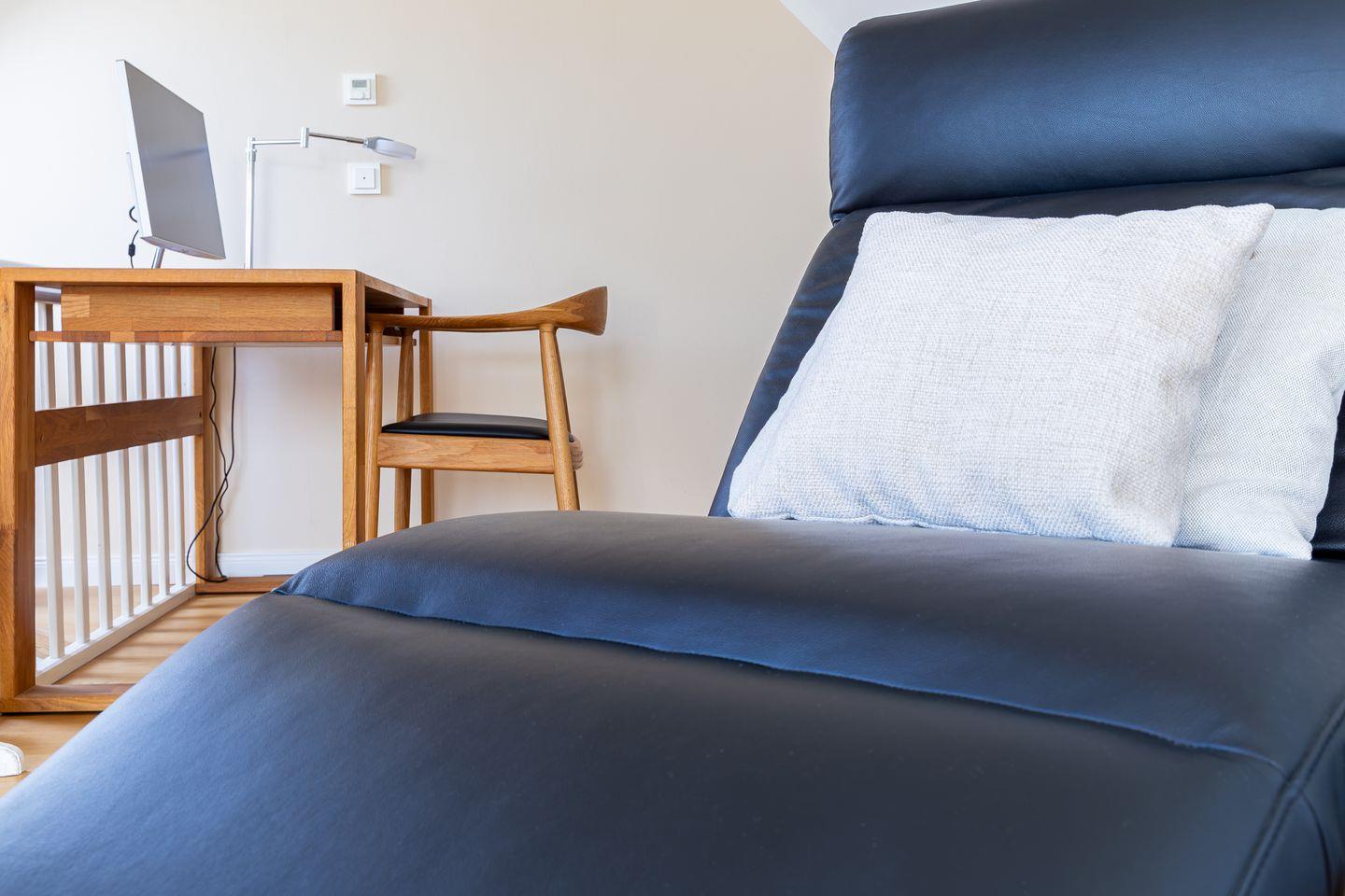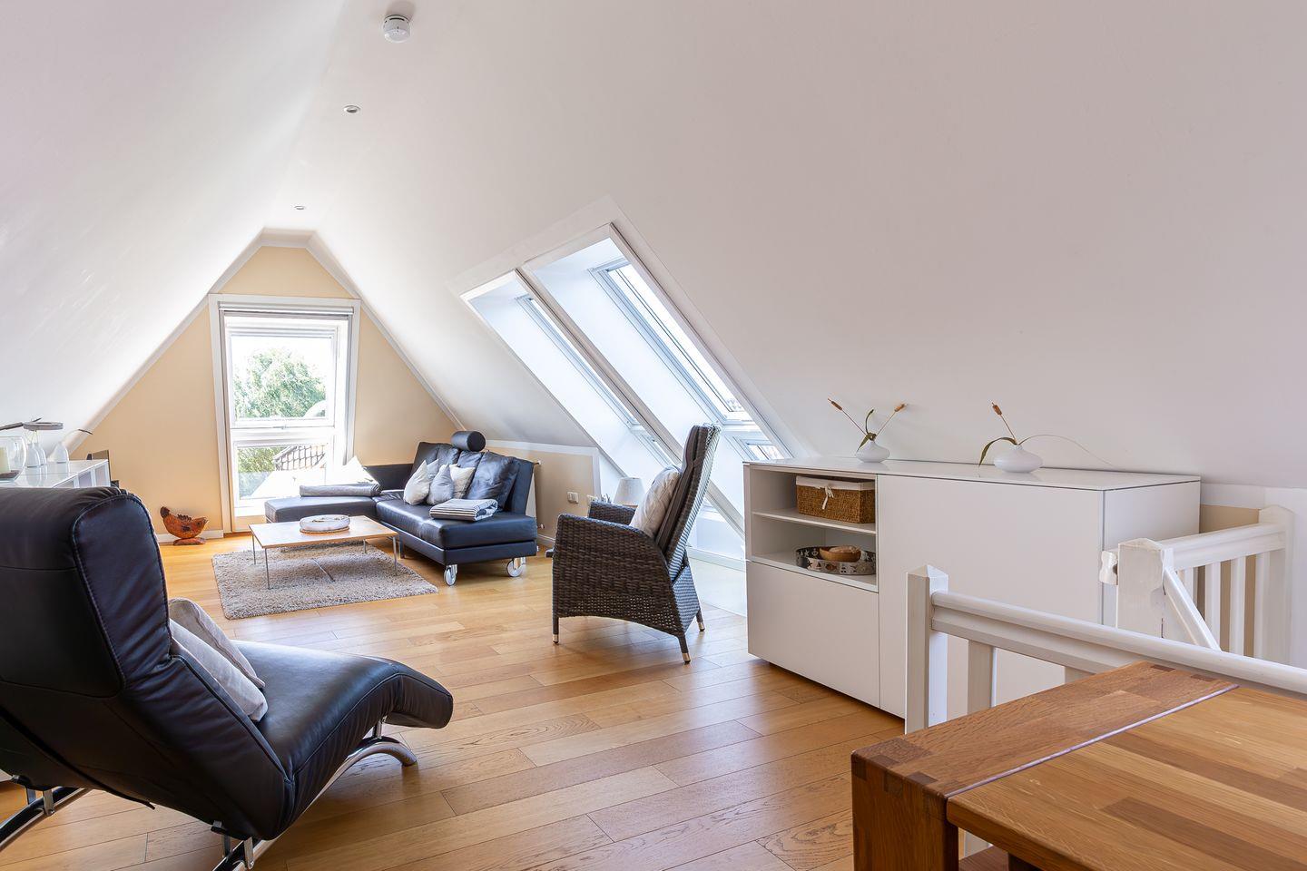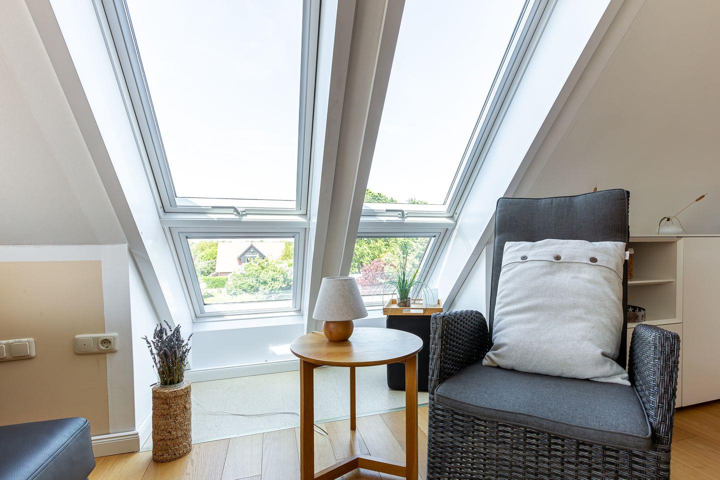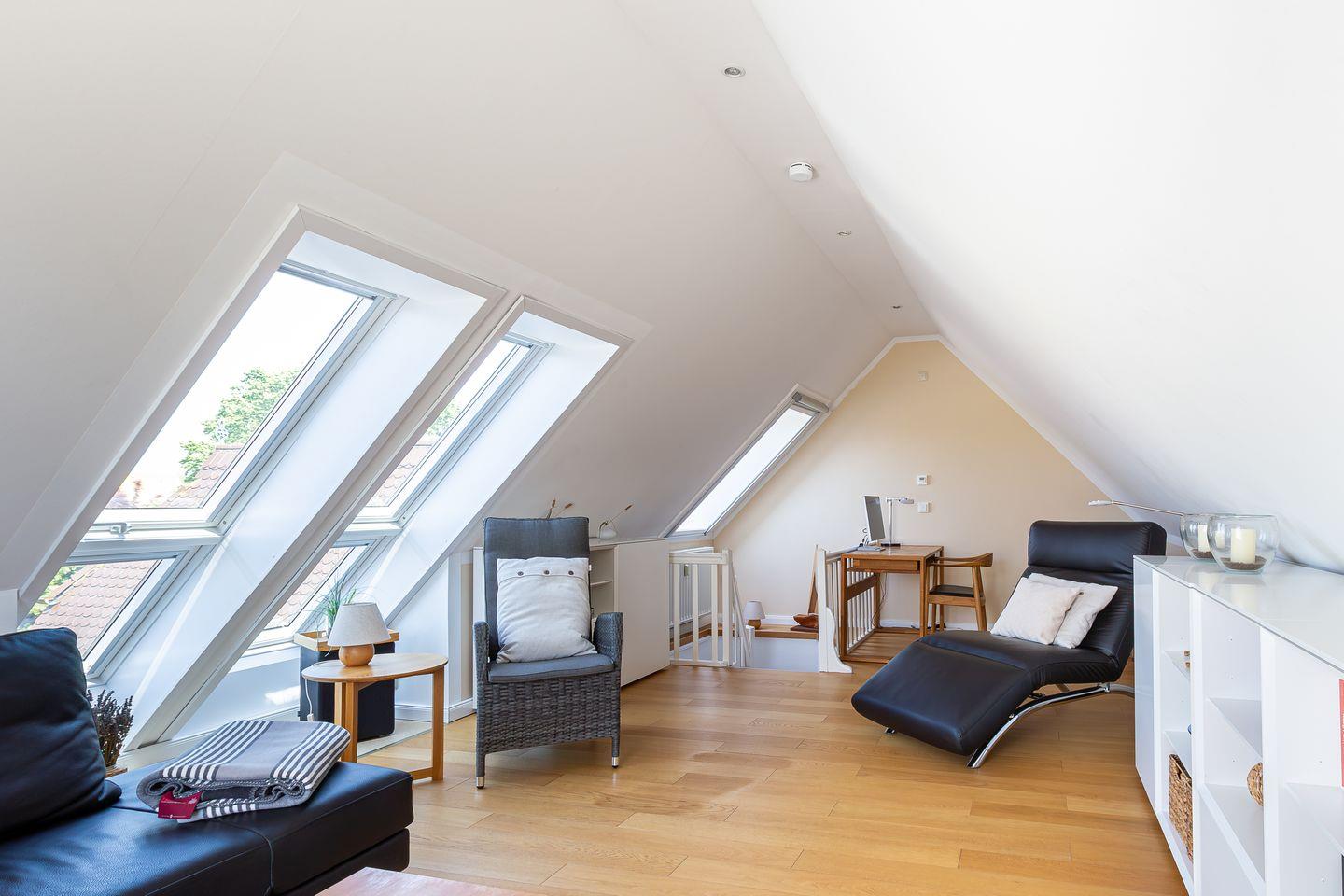 Eine steile Treppe führt dich ins Dachgeschoss. Hier gelangst du direkt in die lichtdurchflutete, offene Galerie mit traumhaftem Blick auf den Bodden. Das geölte Echtholzparkett und das hochwertige Mobiliar sorgen für eine echte Wohlfühl-Atmosphäre. Ein Designer-Sofa mit Récamiere lädt wunderbar zum Relaxen mit Blick auf Bodden und den zweiten SMART-Fernseher ein. Mit der hochwertigen Stereoanlage von Yamaha / Denon macht auch Musikhören richtig Spaß. Ein Schreibtisch mit einem 27 Zoll QHD Design-Monitor in Verbindung mit schnellem Glasfaser-Internet bietet Dir die perfekte Möglichkeit zur Workation oder Internet-Surfen mit Deinem eigenen Laptop.