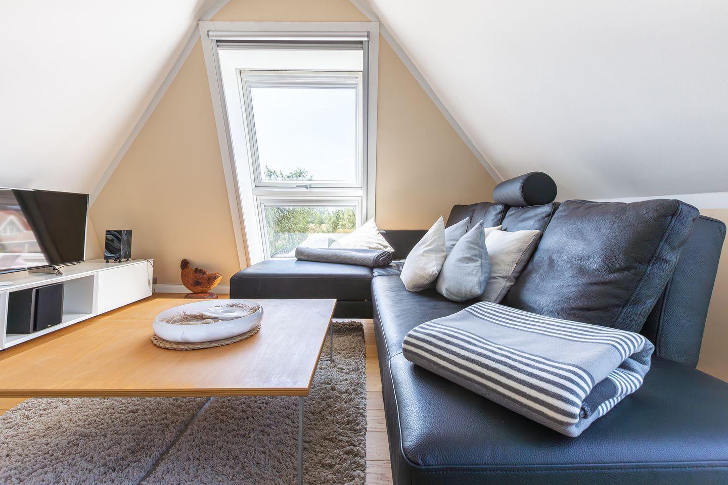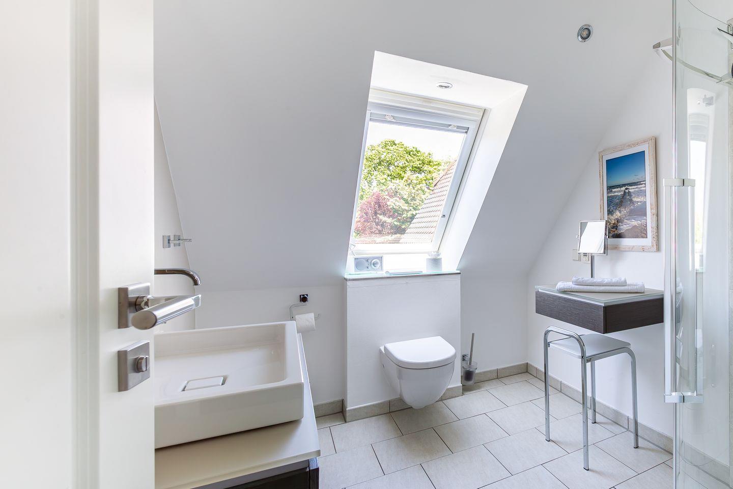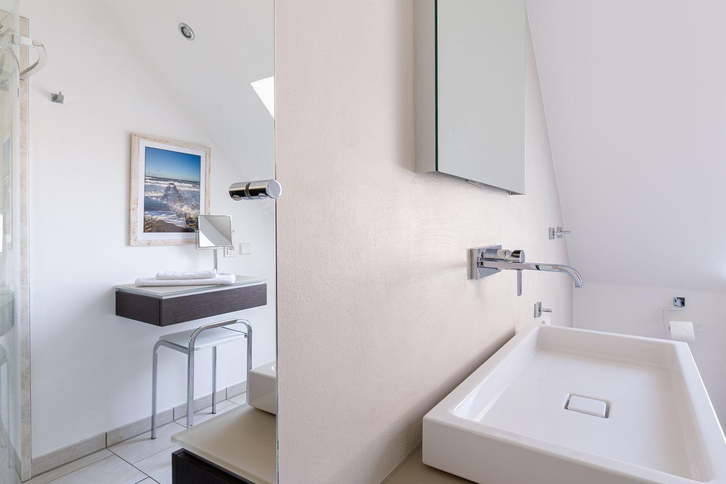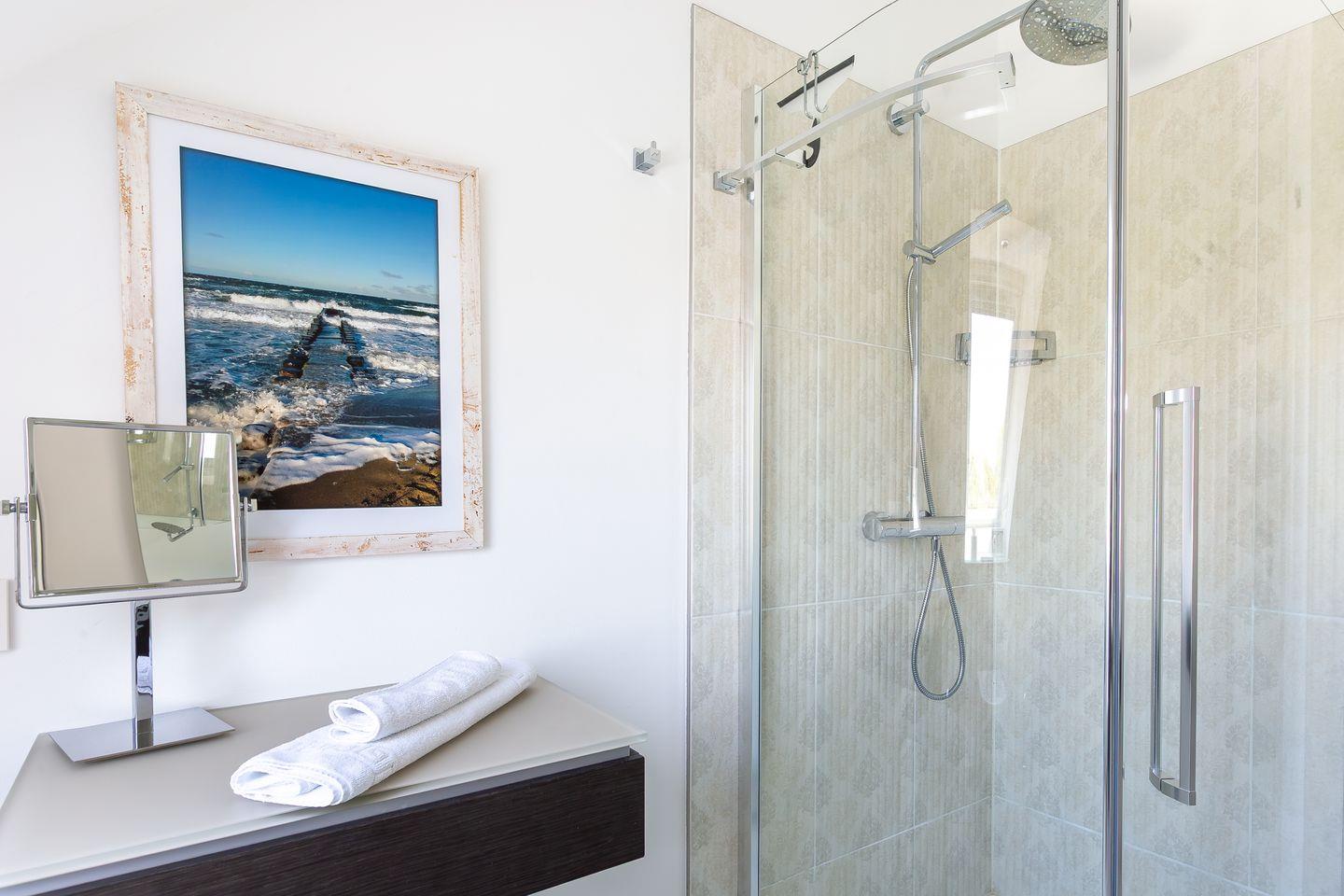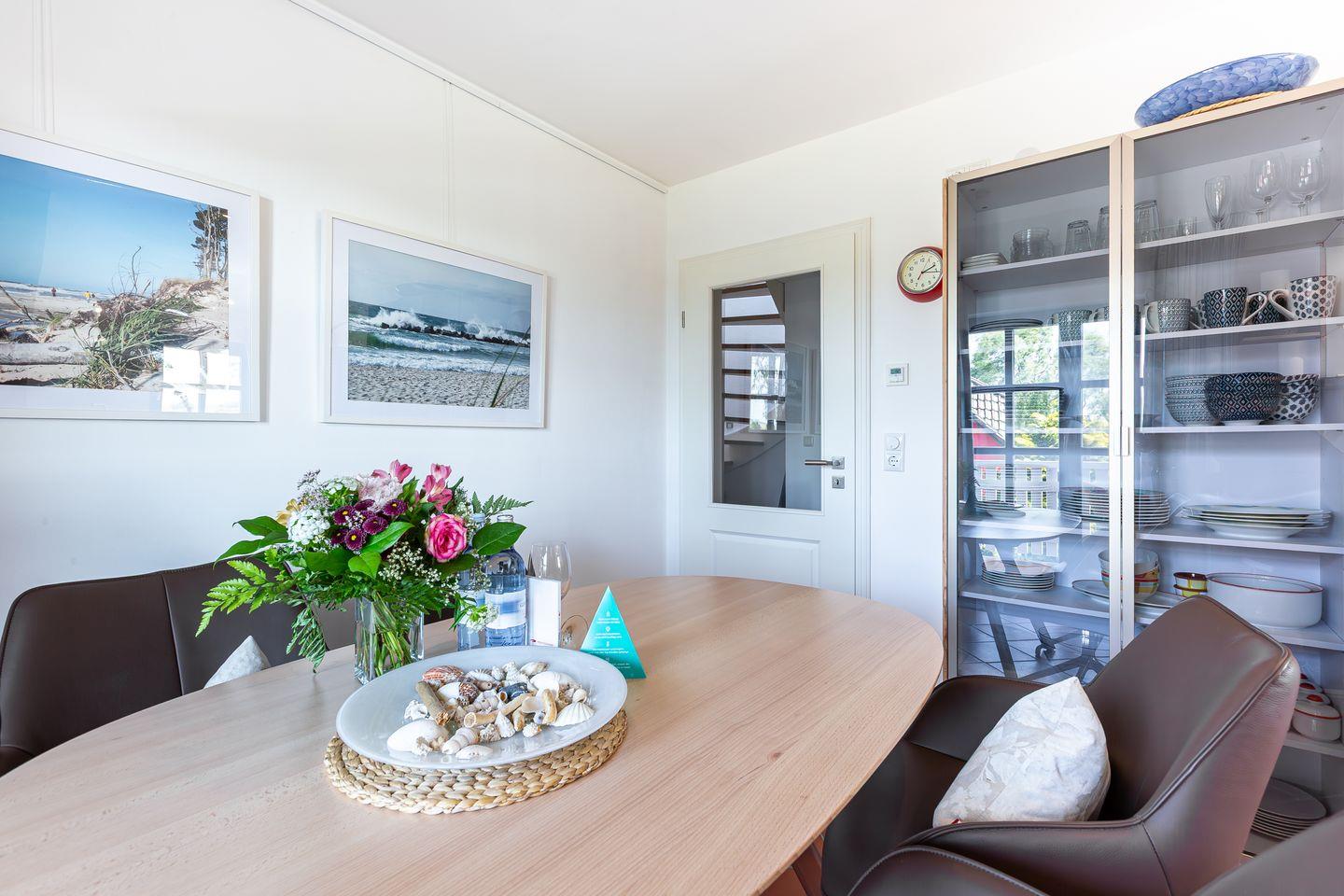 Eine steile Treppe führt dich ins Dachgeschoss. Hier gelangst du direkt in die lichtdurchflutete, offene Galerie mit traumhaftem Blick auf den Bodden. Das geölte Echtholzparkett und das hochwertige Mobiliar sorgen für eine echte Wohlfühl-Atmosphäre. Ein Designer-Sofa mit Récamiere lädt wunderbar zum Relaxen mit Blick auf Bodden und den zweiten SMART-Fernseher ein. Mit der hochwertigen Stereoanlage von Yamaha / Denon macht auch Musikhören richtig Spaß. Ein Schreibtisch mit einem 27 Zoll QHD Design-Monitor in Verbindung mit schnellem Glasfaser-Internet bietet Dir die perfekte Möglichkeit zur Workation oder Internet-Surfen mit Deinem eigenen Laptop.