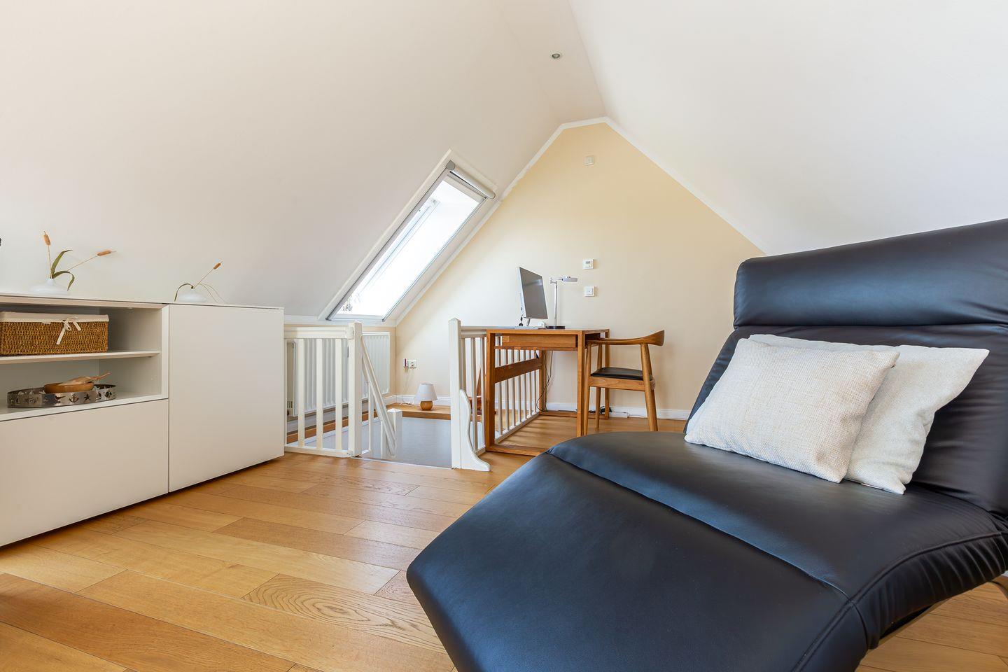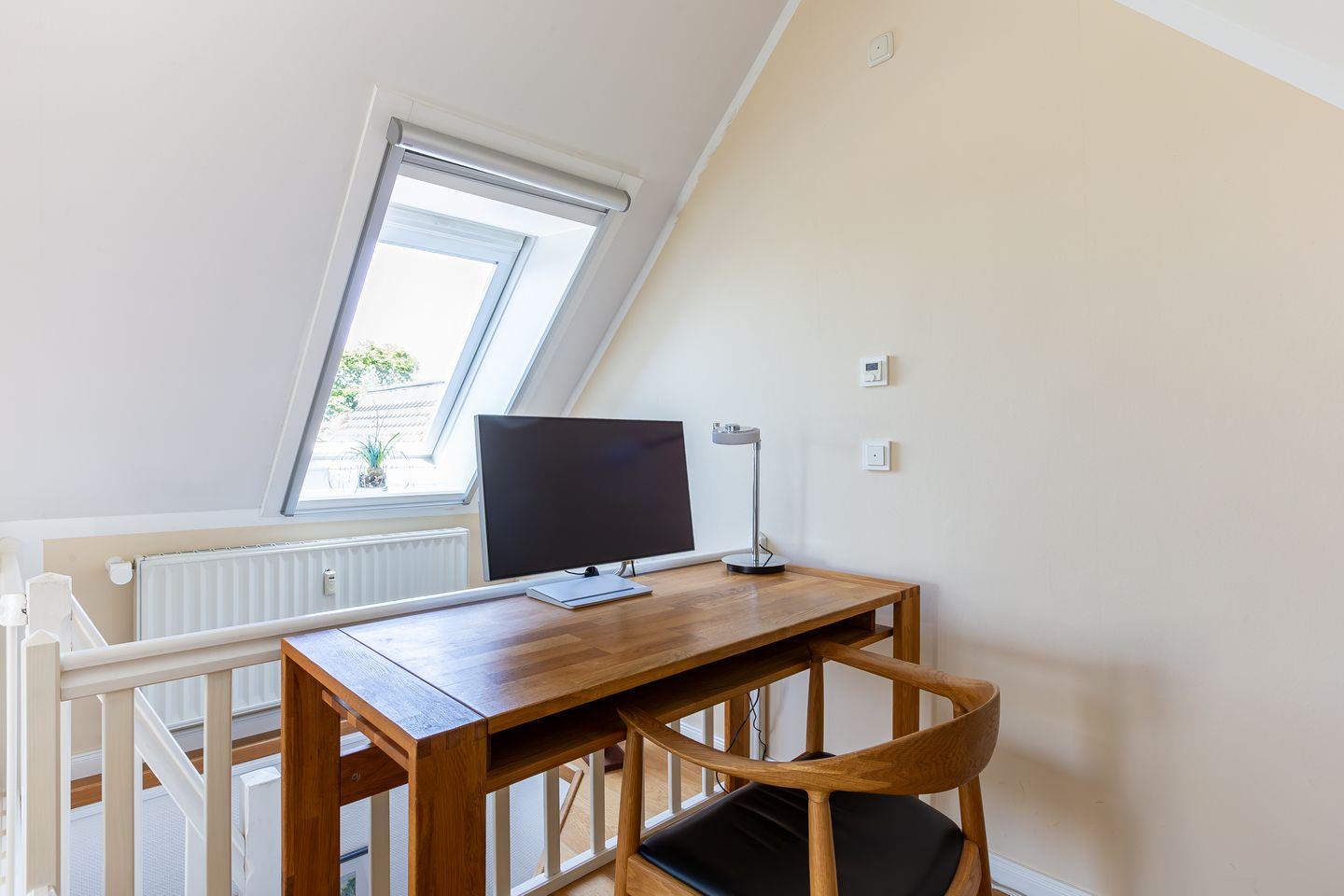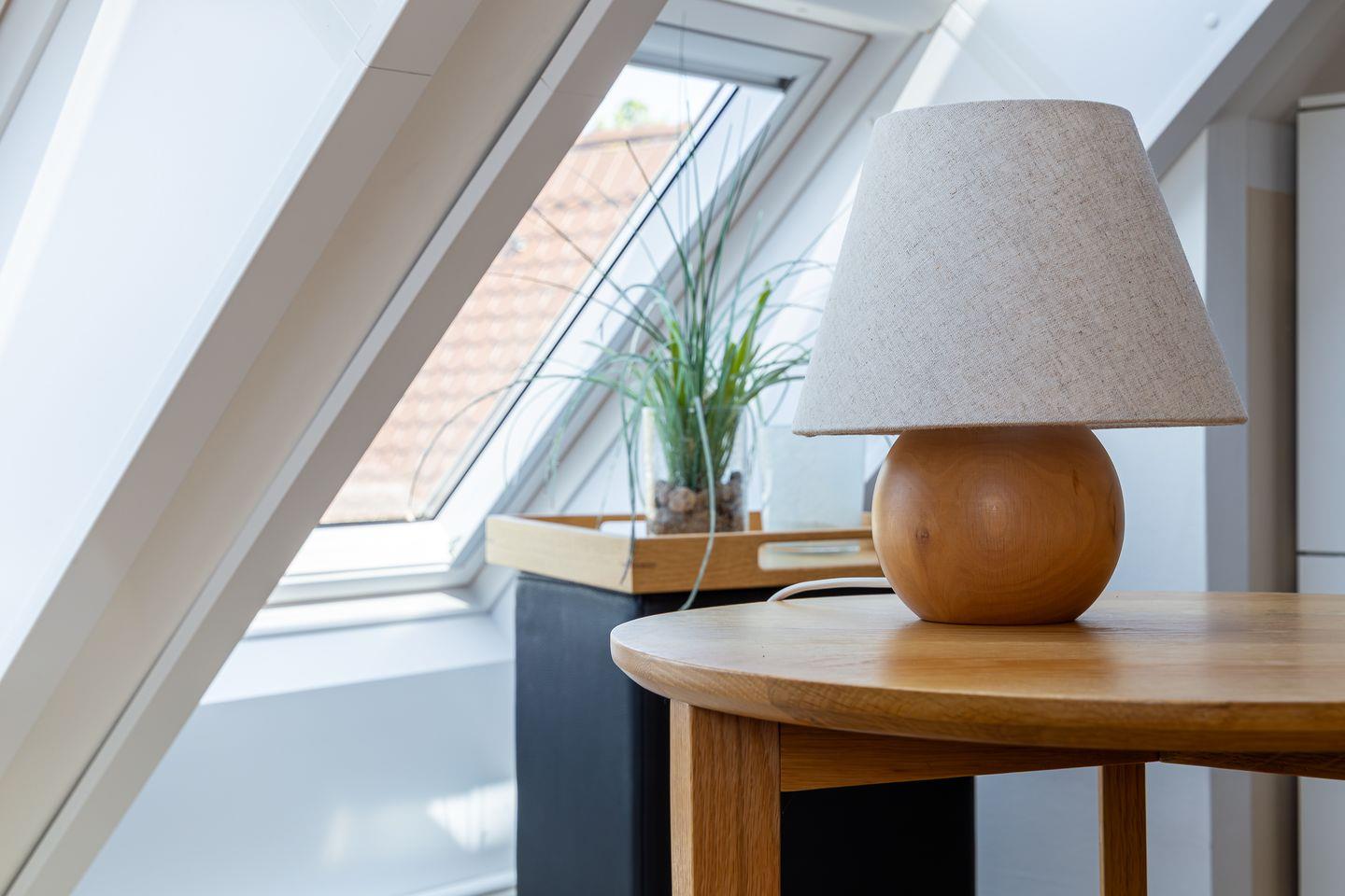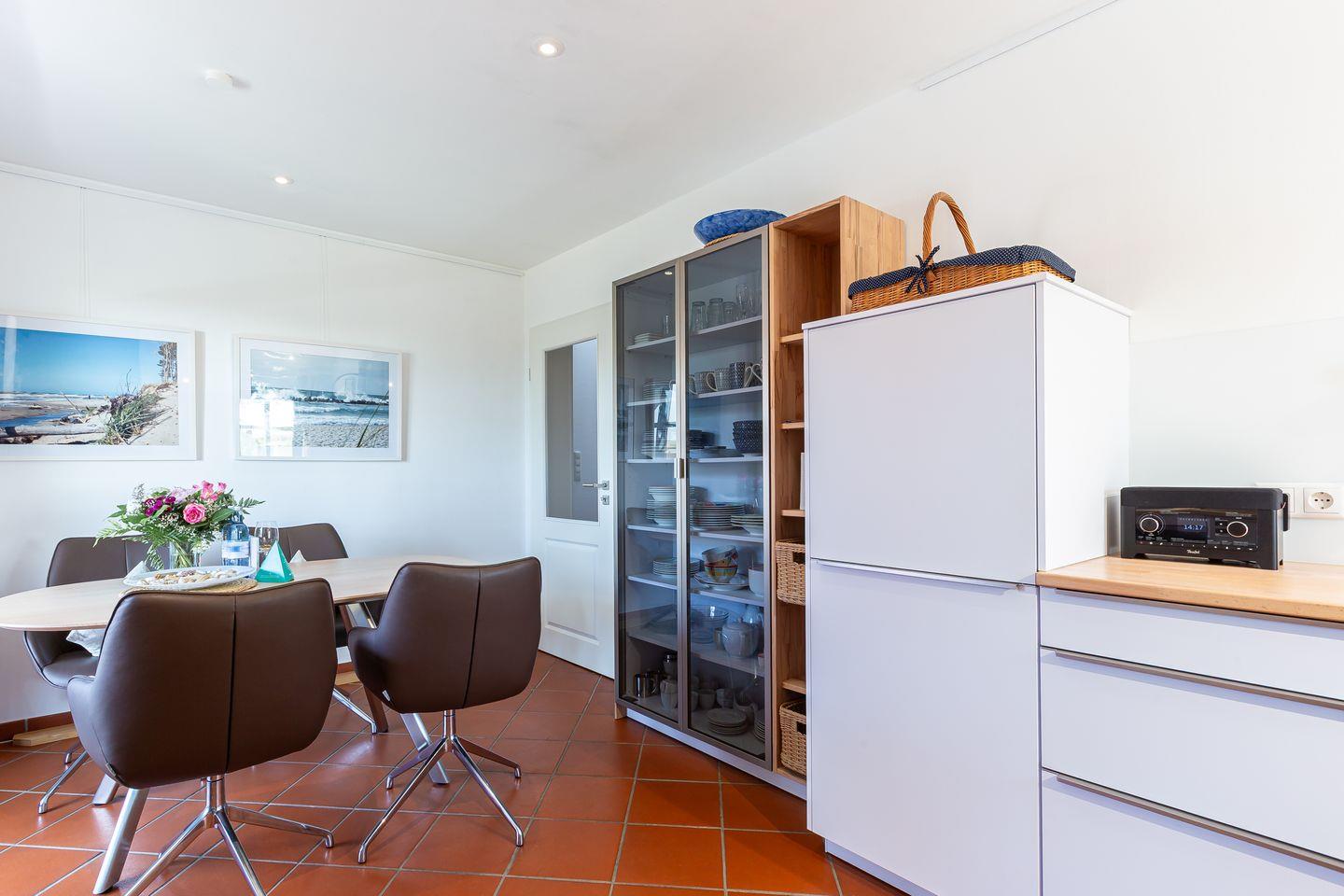 Eine steile Treppe führt dich ins Dachgeschoss. Hier gelangst du direkt in die lichtdurchflutete, offene Galerie mit traumhaftem Blick auf den Bodden. Das geölte Echtholzparkett und das hochwertige Mobiliar sorgen für eine echte Wohlfühl-Atmosphäre. Ein Designer-Sofa mit Récamiere lädt wunderbar zum Relaxen mit Blick auf Bodden und den zweiten SMART-Fernseher ein. Mit der hochwertigen Stereoanlage von Yamaha / Denon macht auch Musikhören richtig Spaß. Ein Schreibtisch mit einem 27 Zoll QHD Design-Monitor in Verbindung mit schnellem Glasfaser-Internet bietet Dir die perfekte Möglichkeit zur Workation oder Internet-Surfen mit Deinem eigenen Laptop.