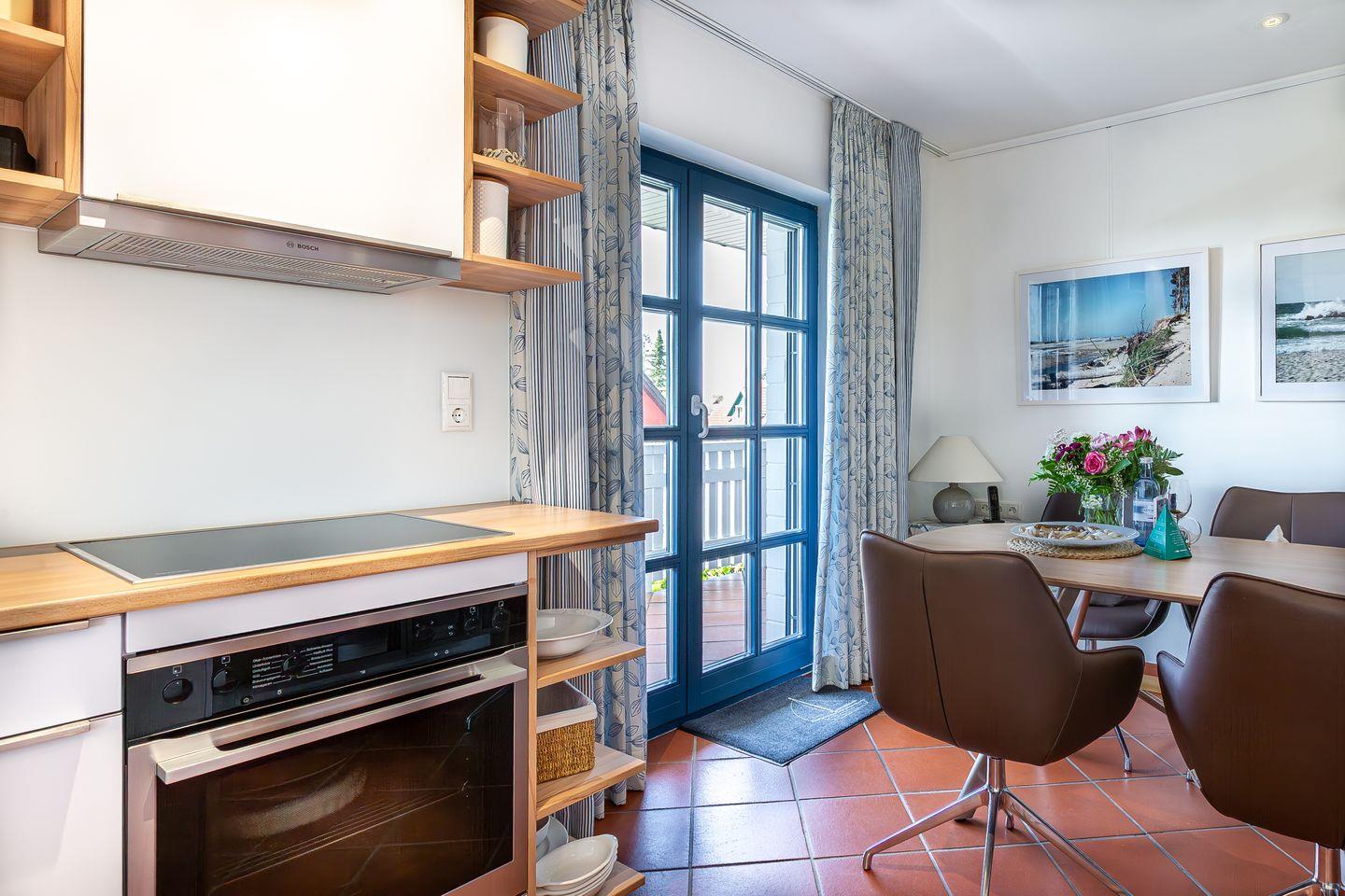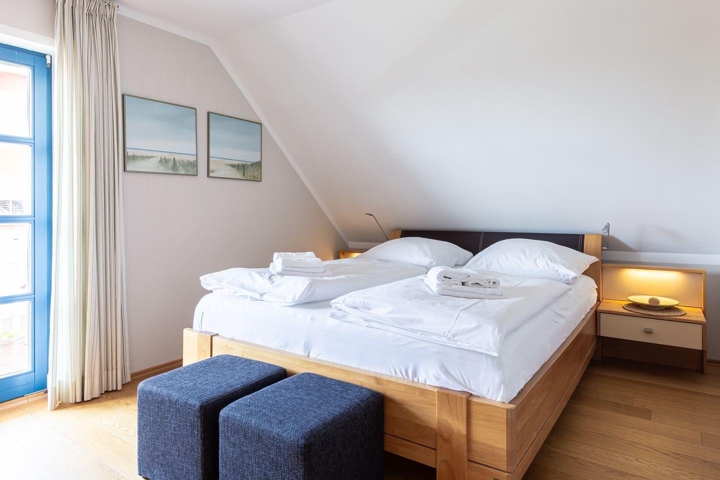 Die exklusive Maisonette-Ferienwohnung befindet sich im 1. Obergeschoss eines Mehrfamilienhauses auf einem 1300 m2 großem wunderschönen Grundstück. In der ersten Ebene findest Du eine Design-Wohnküche mit Top-Küchengeräten. Die helle und mit viel Massivholz gestaltete Küche strahlt eine besondere Atmosphäre aus. Die vollständige Küchenausstattung lässt das Herz jedes Hobbykoches höher schlagen, wie beispielsweise diverse Koch-Utensilien, Rührmixer, Stabmixer, Waage, Salatschleuder, Kaffeemaschine, Wasserkocher, Toaster, Milchschäumer und Nespresso-Maschine. Ein Teufel Premium Digitalradio mit 1000+ Radiosender über DAB+, Internet oder Musik verlustfrei vom Smartphone sorgt für die richtige Unterhaltung beim Kochen und langen Abenden. Der schöne Essbereich mit dem Massivholztisch und ein großen Südwestbalkon laden zu geselligen Kochabenden mit einzigartigem Boddenblick beim Sonnenuntergang ein. Ebenfalls einen eigenen Balkonzugang bietet Dir das Schlafzimmer mit komfortablen Doppelbett, großem Kleiderschrank und SMART-Fernseher. Die Ausstattung mit geöltem Echtholzparkett und entsprechende Bezüge lassen auch Hausstaub-Allergiker tief und fest schlummern. Ein hochwertiges, sonnenbelichtetes Bad mit Regendusche vervollständigt die erste Ebene. Ein Fön, ein Warmluftbürste und eine Sitzgelegenheit mit Schminkspiegel sind selbstverständlich vorhanden.