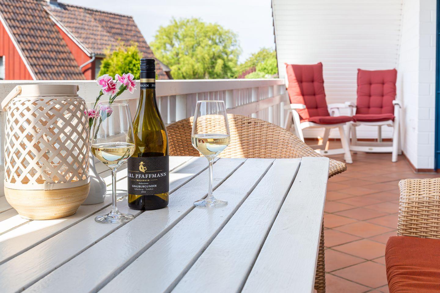 Die Ferienwohnung bietet dir zusätzlich zum großen Balkon einen eigenen kleinen Garten mit Blick auf das Naturschutzgebiet und den Bodden, Liegewiese, Terrasse, Gartenmöbeln und Webergrill. Somit steht dir auch im Außenbereich ein erholsamer Ort zur Verfügung, an dem du abschalten und einfach nur die Seele baumeln lassen kannst. Zur Ferienwohnung gehören ein eigener PKW-Carport sowie ein abschließbarer Fahrradstellplatz. Solltest du deine eigene Bettwäsche mitbringen wollen, beachte bitte das Sondermaß der Matratze von 180 x 200 cm.