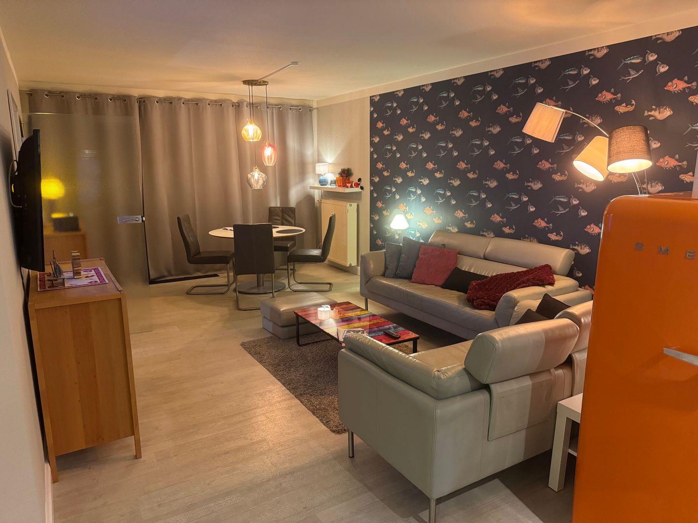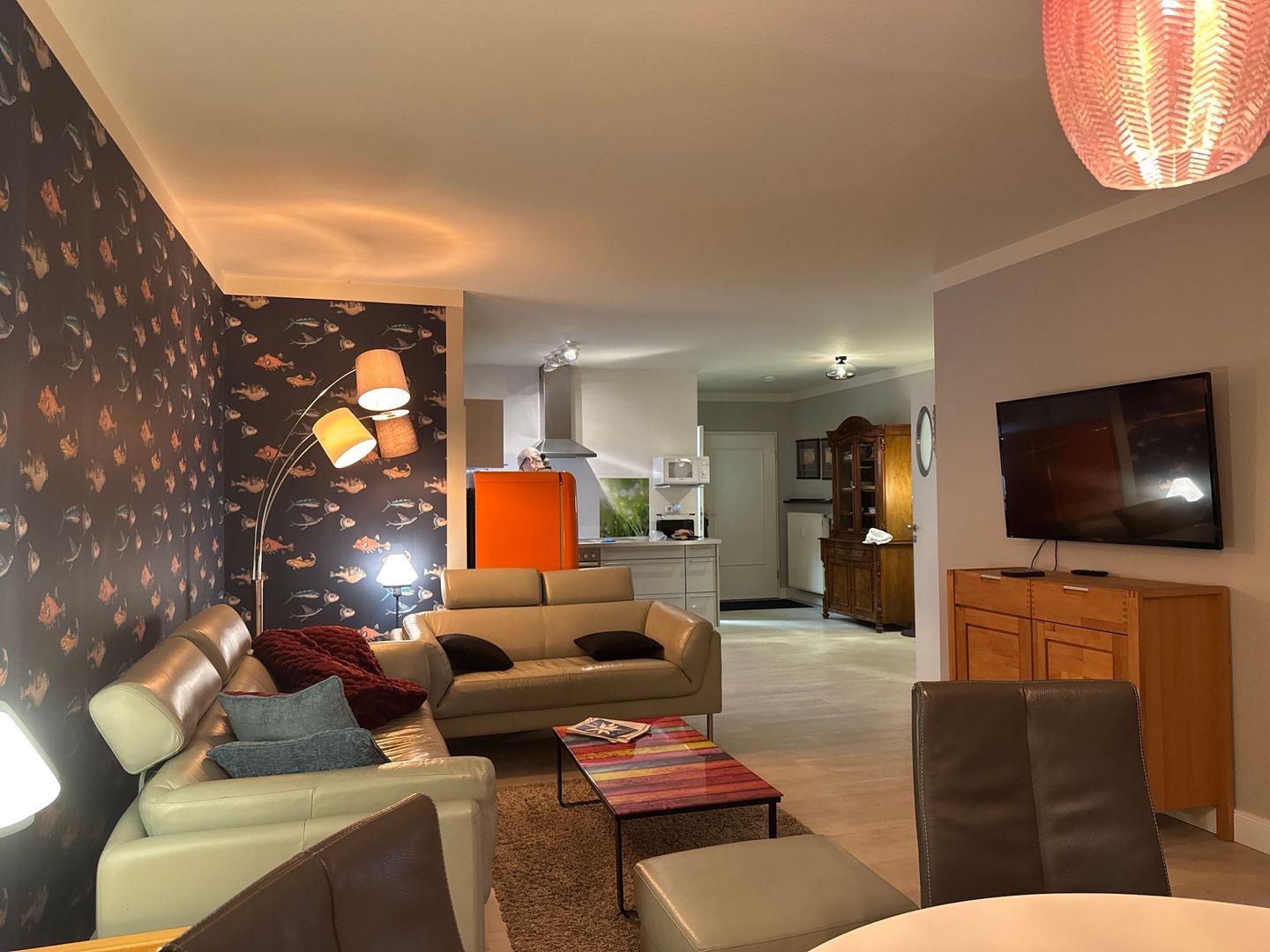 Die Gute Stube besteht insgesamt aus zwei Zimmern und stellt Ihnen dabei eine Schlafmöglichkeit für zwei Personen zur Verfügung. Besonders hervorzuheben ist der offene Grundriss: Die moderne Küche ist offen in das Wohnzimmer integriert und verbindet Koch- und Wohnbereich zu einem kommunikativen Zentrum der Unterkunft. Die Küche selbst ist vollständig ausgestattet und bietet alles, was Sie für die Zubereitung Ihrer Mahlzeiten benötigen: Ein Cerankochfeld, ein Backofen mit Elektroanschluss, Kühlschrank mit Gefrierfach, Kaffeemaschine, Wasserkocher, Spülmaschine, Geschirr, Besteck sowie verschiedenes Kochzubehör und Geschirrhandtücher stehen bereit. Am gemütlichen Esstisch lässt es sich gemeinsam speisen oder schöne Abende planen.