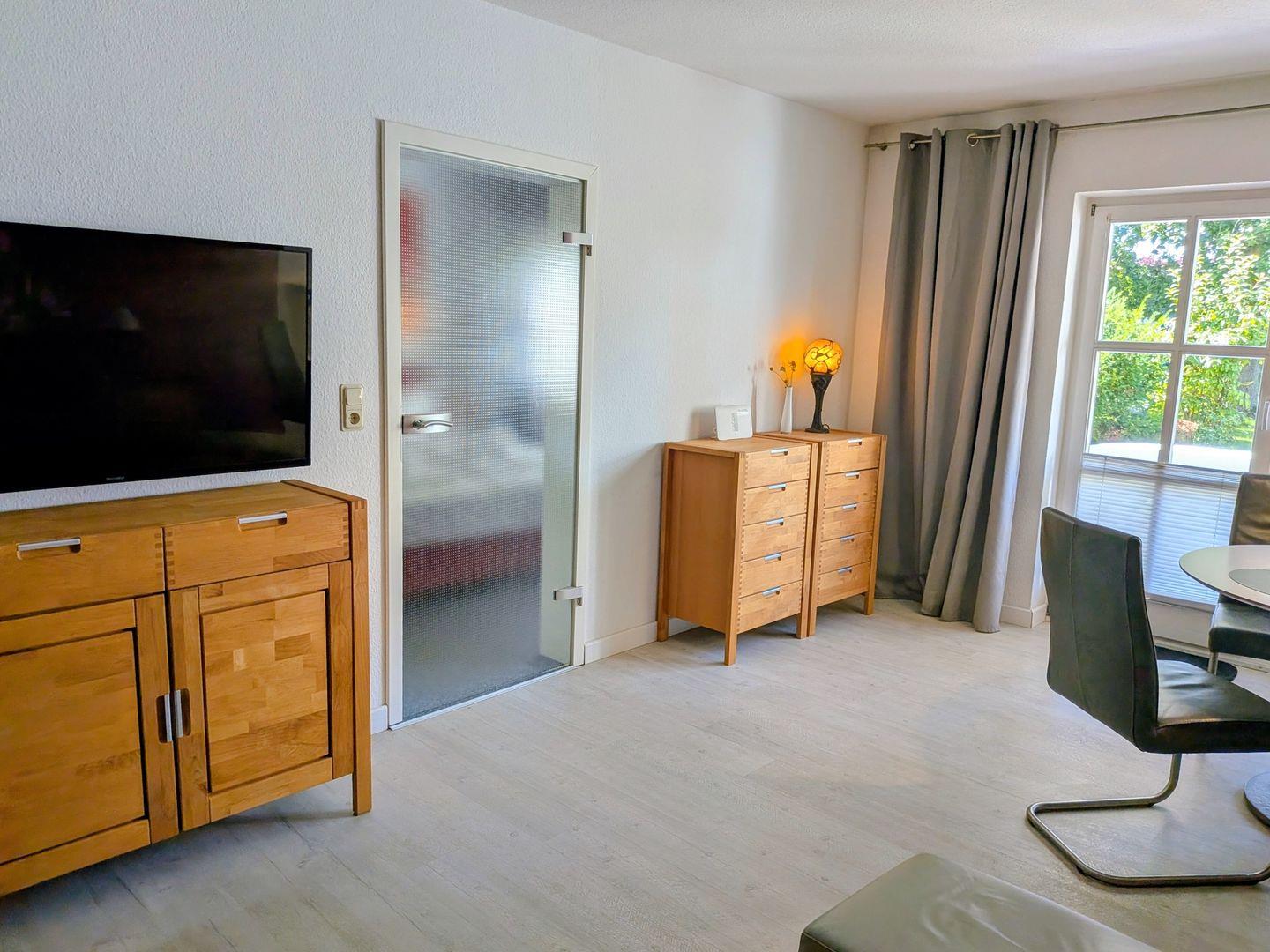 Im Wohnbereich sorgen ein bequemes Sofa sowie ein Satelliten-TV für entspannte Stunden. Internetzugang via WLAN steht zur Verfügung, sodass Sie auch im Urlaub mit der digitalen Welt verbunden bleiben können. Der Schlafbereich ist funktional und gleichzeitig gemütlich eingerichtet und bietet mit Fenster, Kommode, Spiegel und Sichtschutz an allen Fenstern Privatsphäre und Komfort.