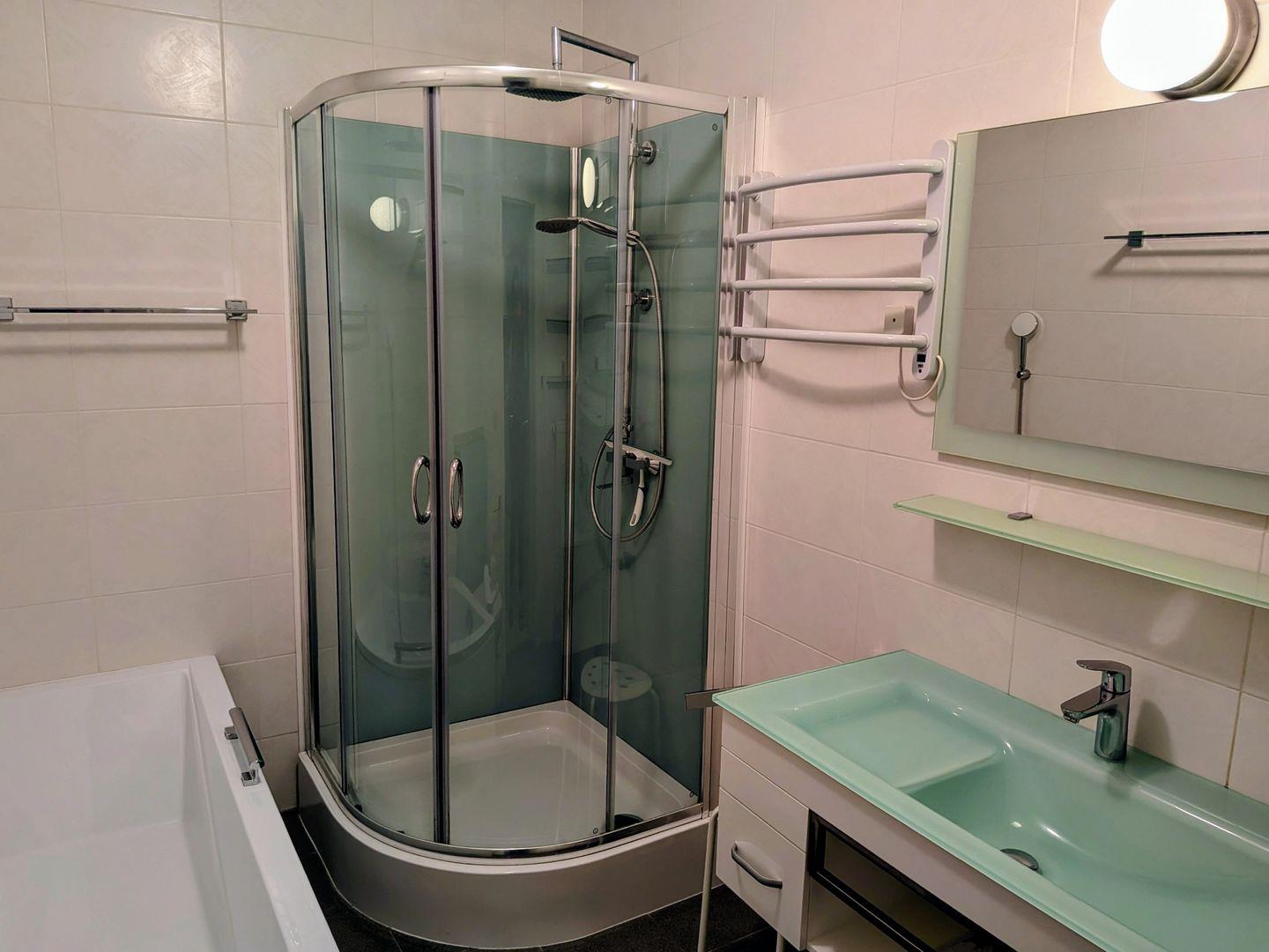 Das Badezimmer umfasst eine Dusche mit Wanne und ist modern gestaltet. Neben den sanitären Einrichtungen wie WC und Waschbecken sorgen Waschmaschine (zur Eigennutzung), Staubsauger und weitere Ausstattungsmerkmale für einen angenehmen Aufenthalt. Die Unterkunft ist als Nichtraucherobjekt ausgewiesen.