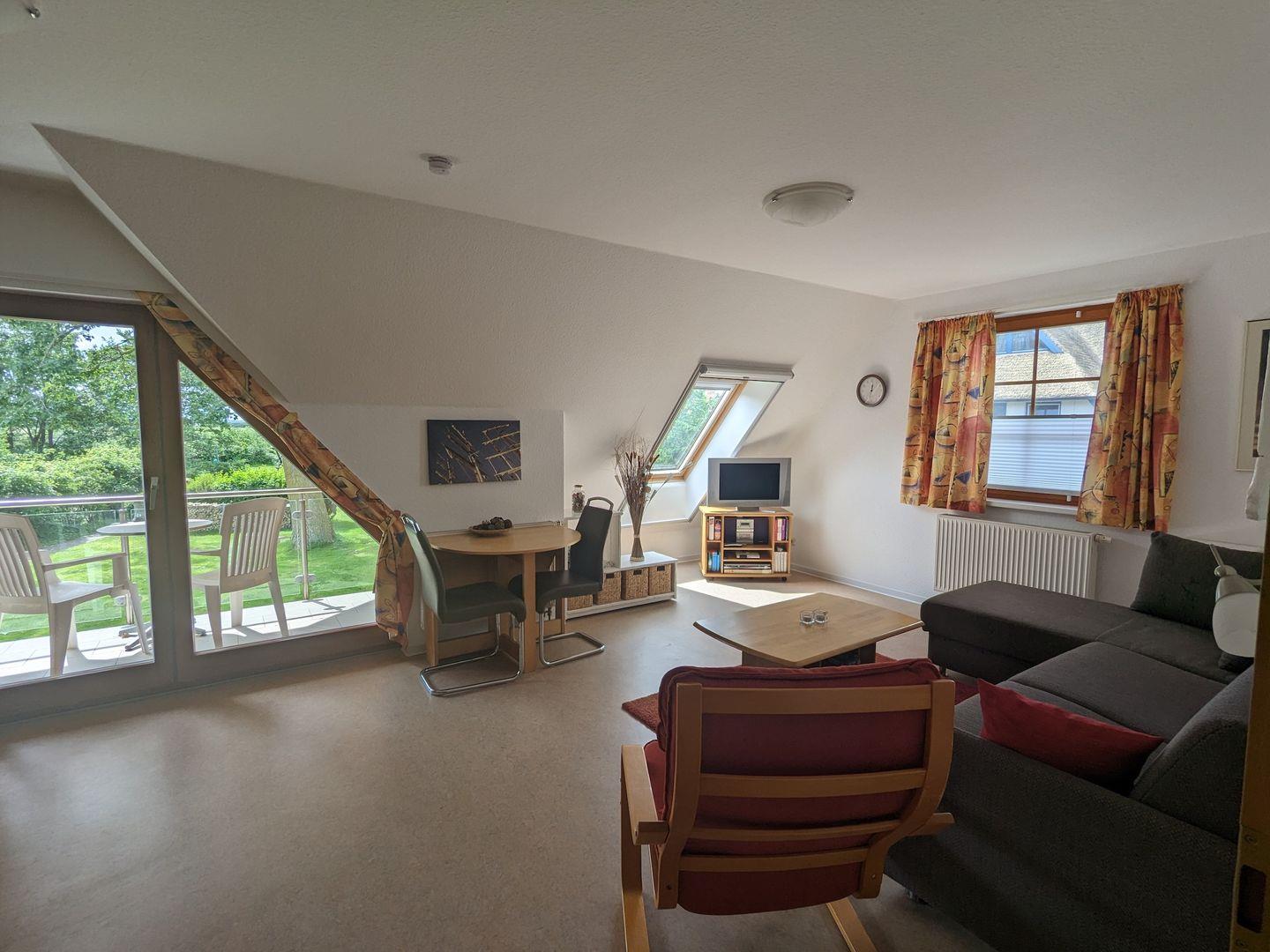 Das helle und freundliche Wohnzimmer ist der perfekte Ort, um nach einem erlebnisreichen Tag zu entspannen. Genießen Sie gemütliche Stunden auf dem Sofa oder erfreuen Sie sich an den Unterhaltungsmöglichkeiten dank der zwei Satelliten-TVs und der HiFi-Anlage. Die große Fensterfront sorgt für reichlich Tageslicht und bietet einen herrlichen Blick auf die umliegende Natur.
