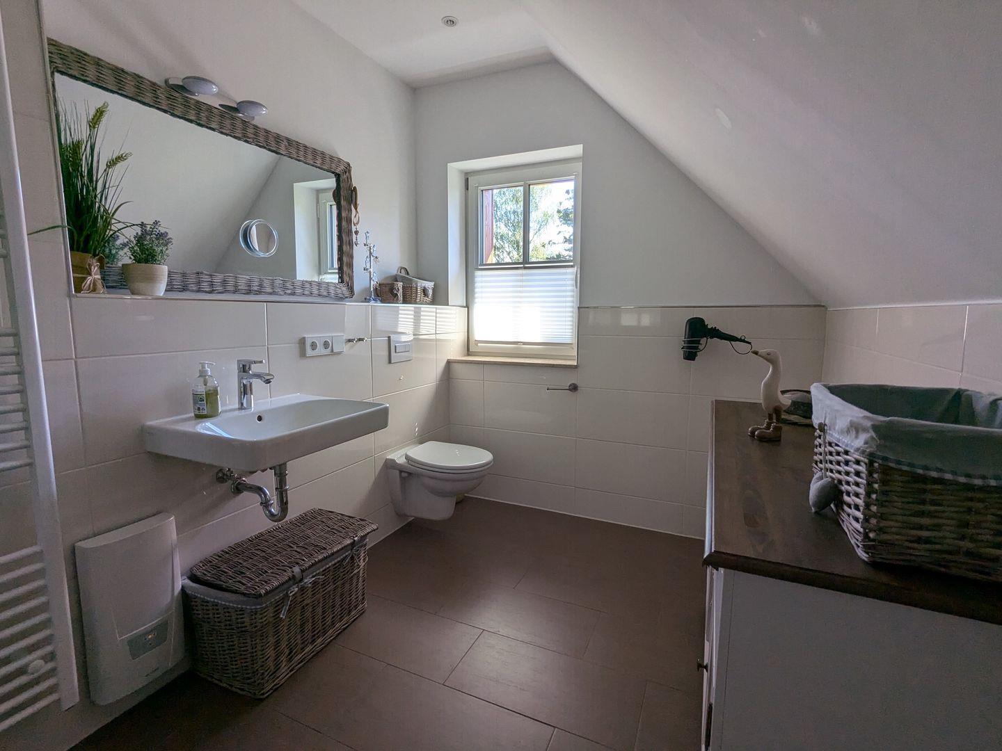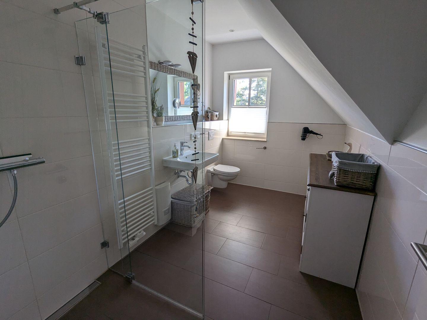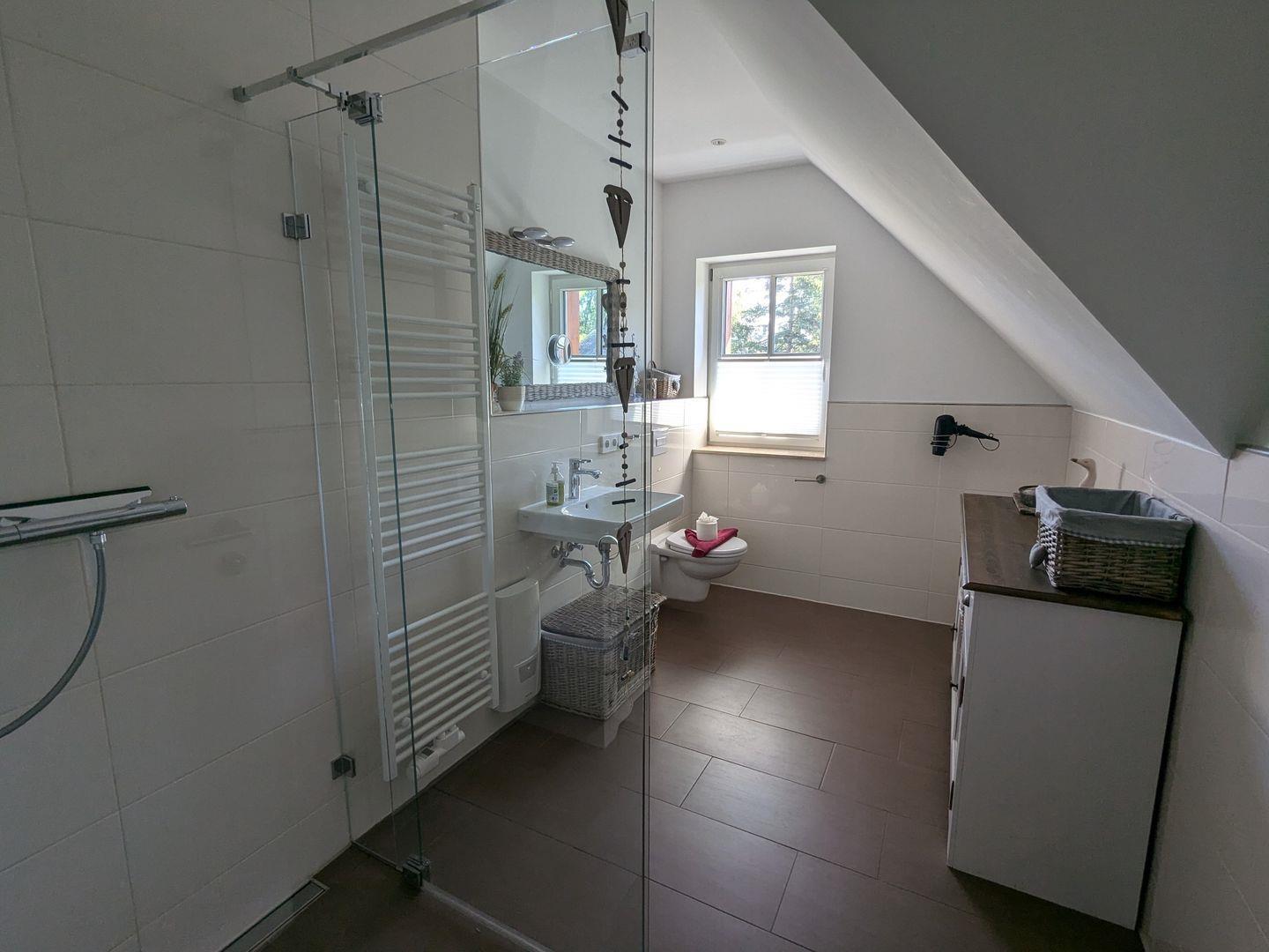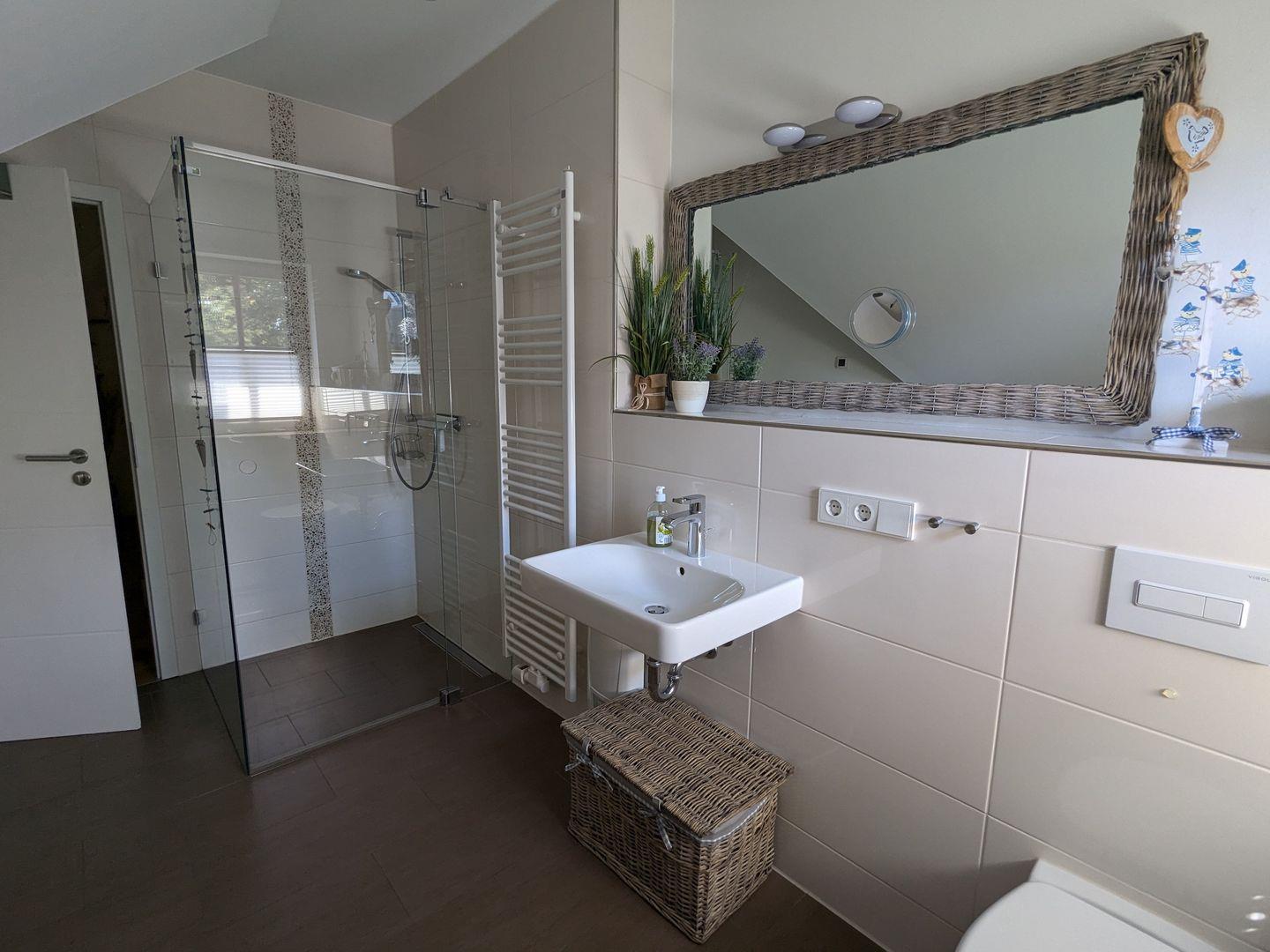 Das Badezimmer ist modern ausgestattet und verfügt über eine bodengleiche Dusche, ein WC sowie ein Waschbecken. Ferienwohnung „Am Wald“ bietet Ihnen außerdem die Annehmlichkeit eines zusätzlichen Gäste-WCs im EG.
