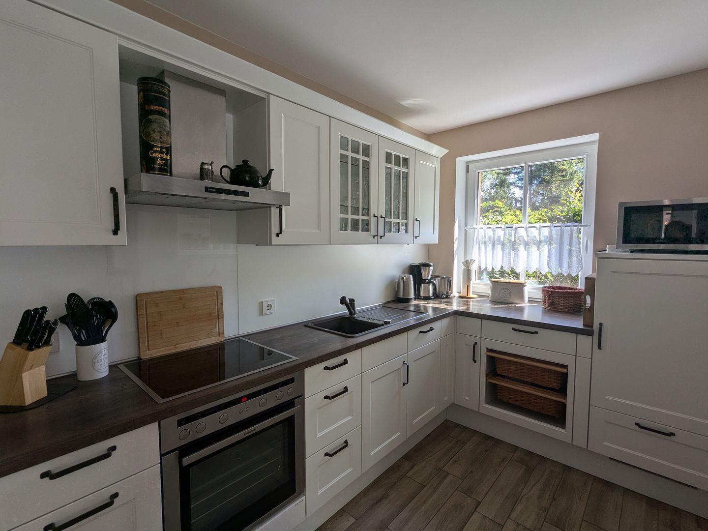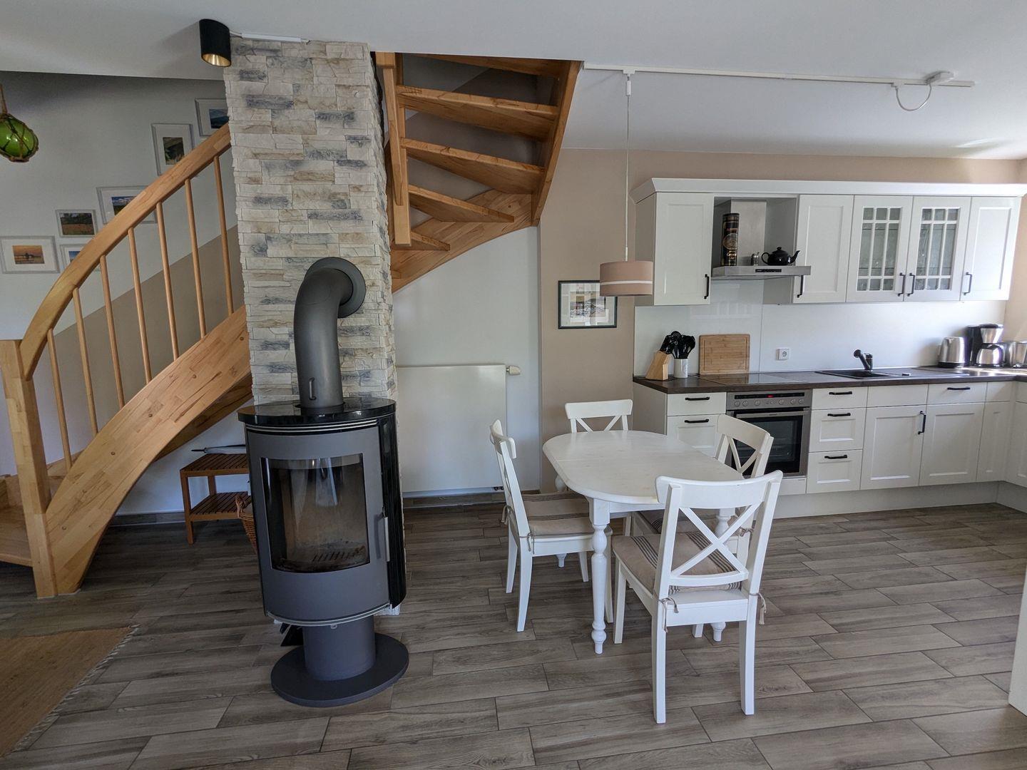 Das Ferienhaus bietet Ihnen ein gemütliches Schlafzimmer, das Platz für zwei Personen bietet und mit liebevollen Details und hochwertiger Ausstattung zum Entspannen einlädt. Der offene Wohnbereich ist der perfekte Ort, um gesellige Abende zu verbringen. Die moderne Küche ist mit allen notwendigen Geräten ausgestattet, einschließlich eines Cerankochfeldes, Backofens, Kühlschranks und Geschirrspüler, sodass Sie ganz einfach Ihre Lieblingsgerichte zubereiten können. Genießen Sie Ihre Mahlzeiten im einladenden Essbereich oder auf der Terrasse, die mit Gartenmöbeln zum Verweilen einlädt und den Blick auf die bezaubernde Umgebung freigibt.