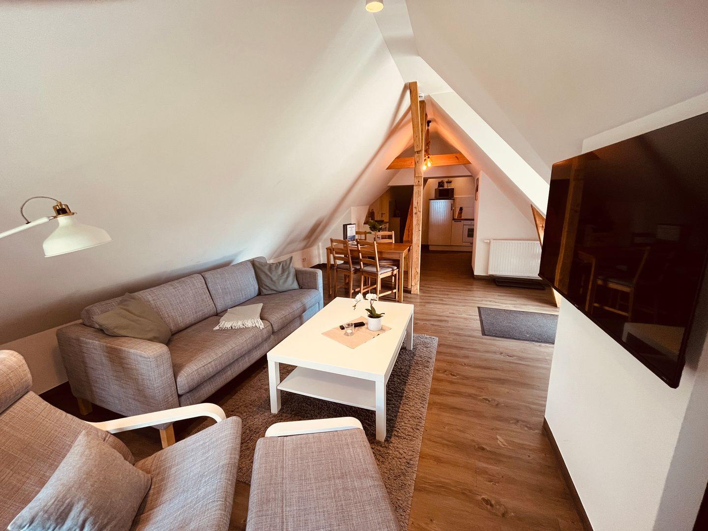 m² groß, besteht aus einem Wohnzimmer mit Flatscreen-Fernseher, einer
