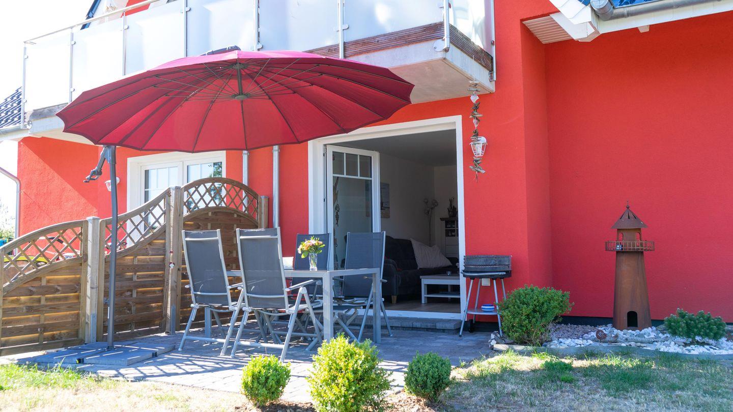 der Sauna- Nutzung in der FeWo) Die Terrasse ist mit Gartenmöbeln, Sonnenschirm