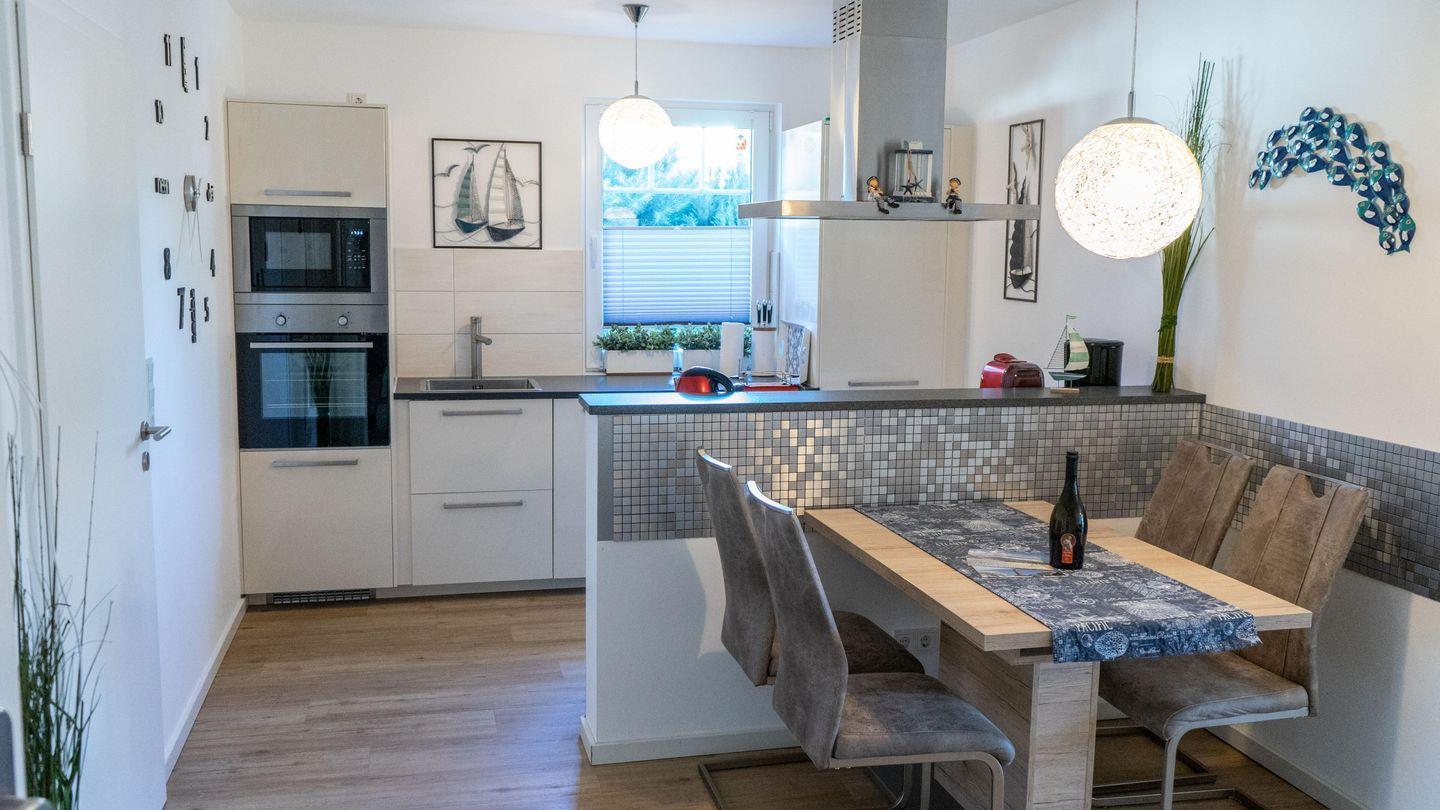 ausgestatteten Küche mit Herd, Backofen, Kaffeemaschine und Essecke, einem