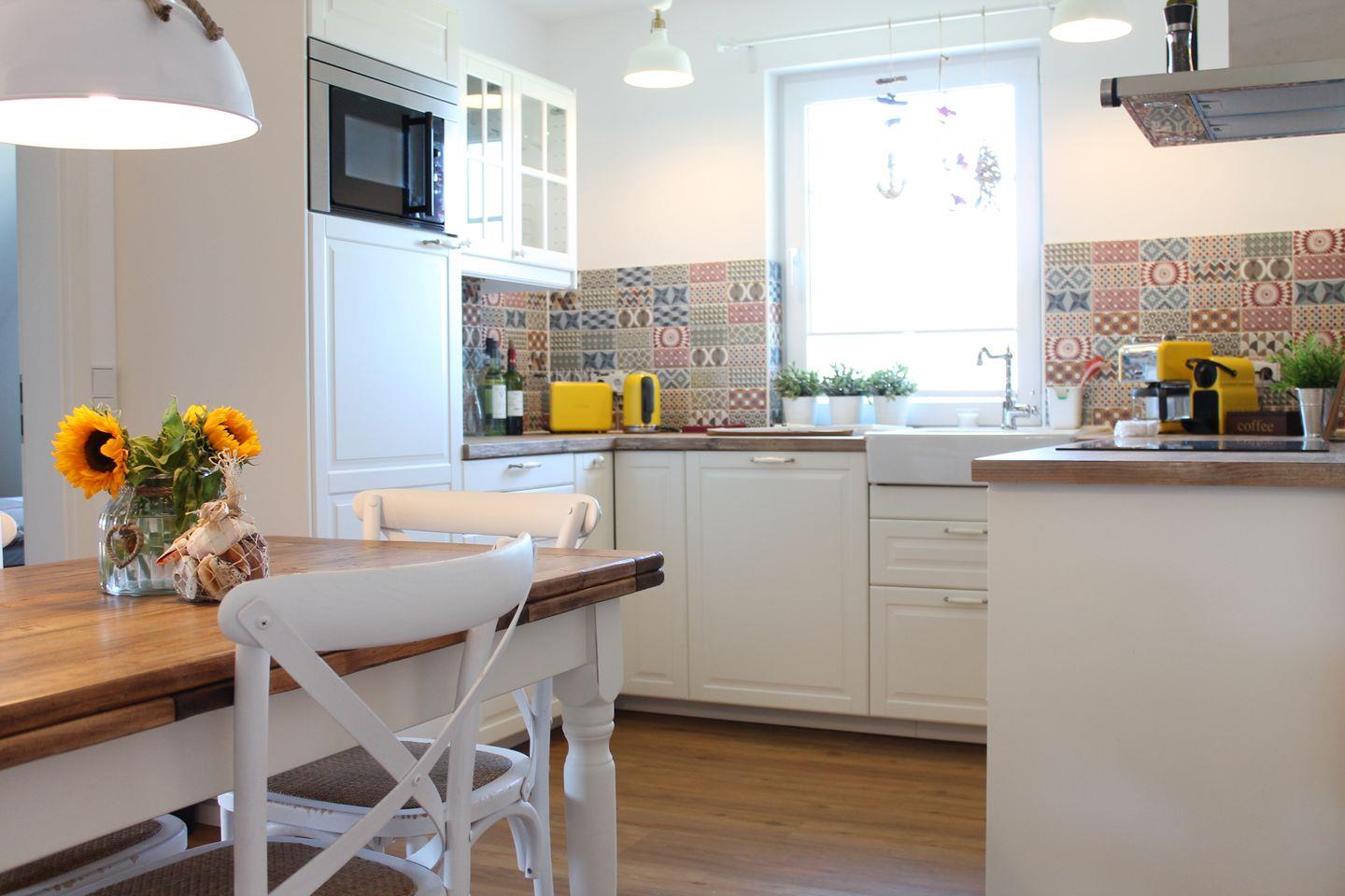angrenzenden voll ausgestatteten Küche mit Herd, Backofen, Kaffeemaschine,