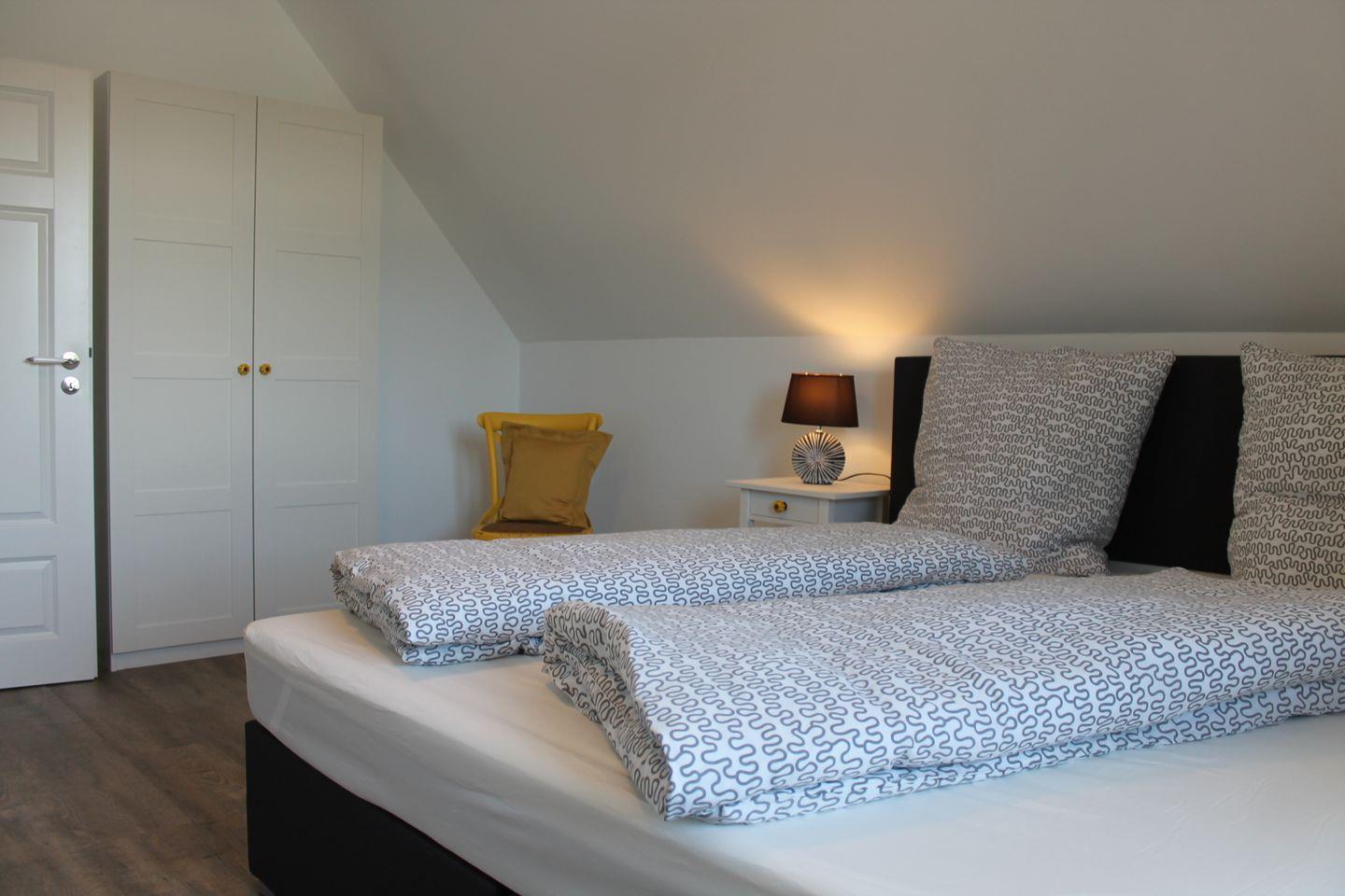 Doppelbett (je 180 x 200 cm, Matrazen sind durchgängig) und ein Schlafzimmer
