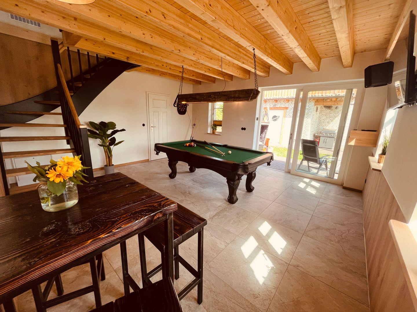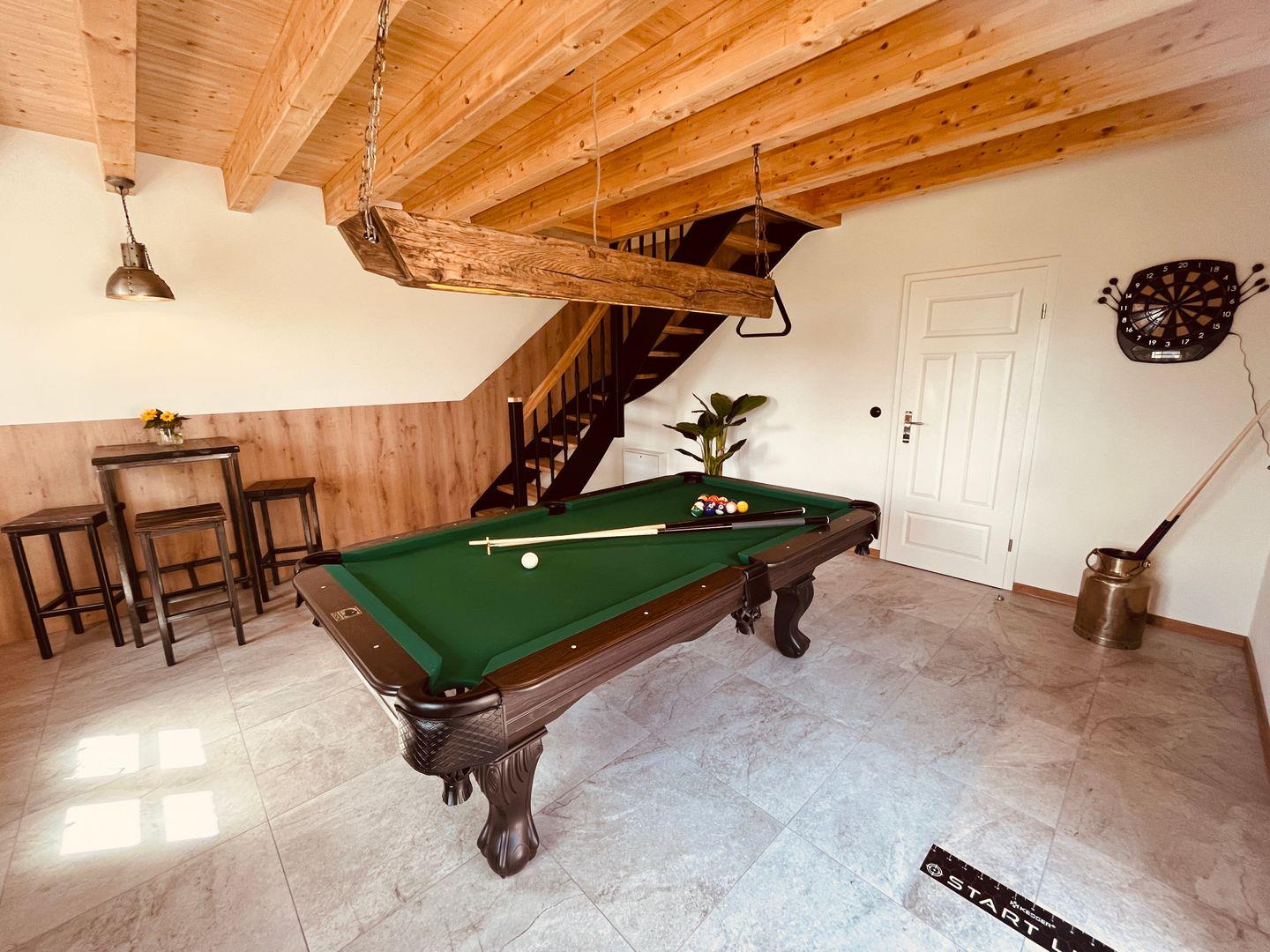 Relaxbereich und einem Billardtisch, Dartscheibe, TV und zusätzlichem Bad
