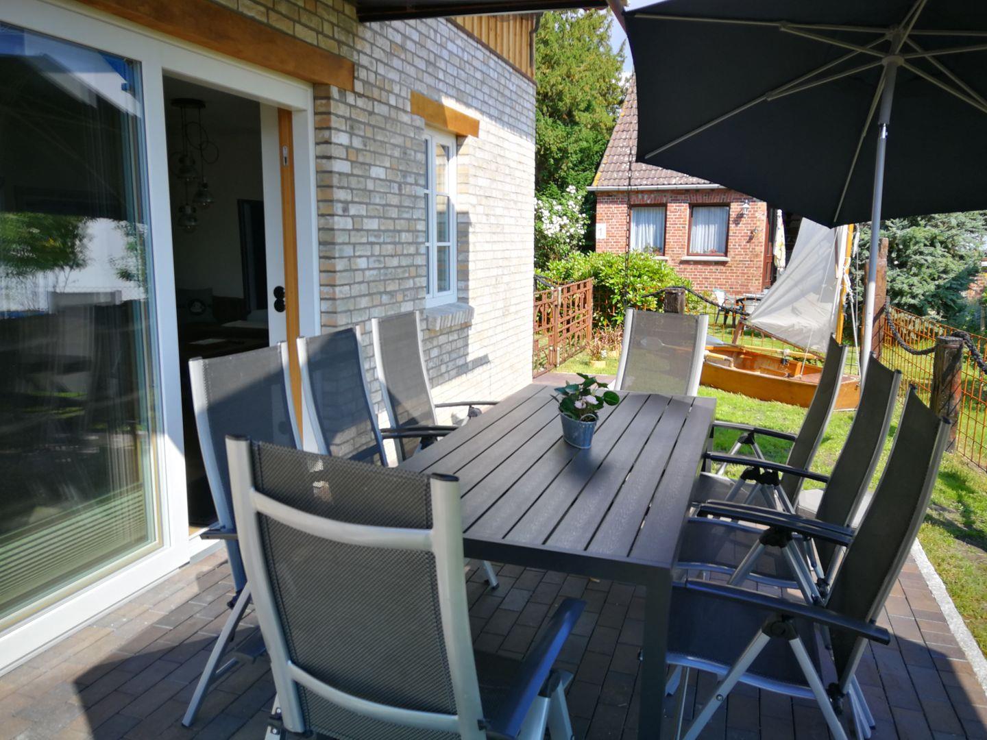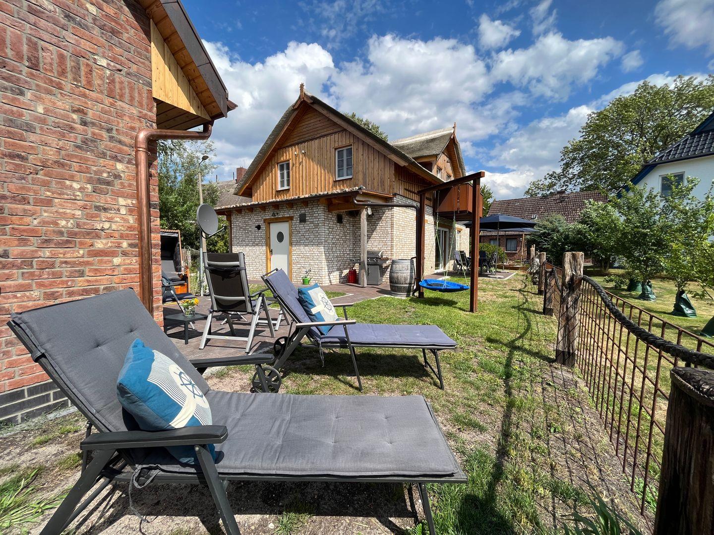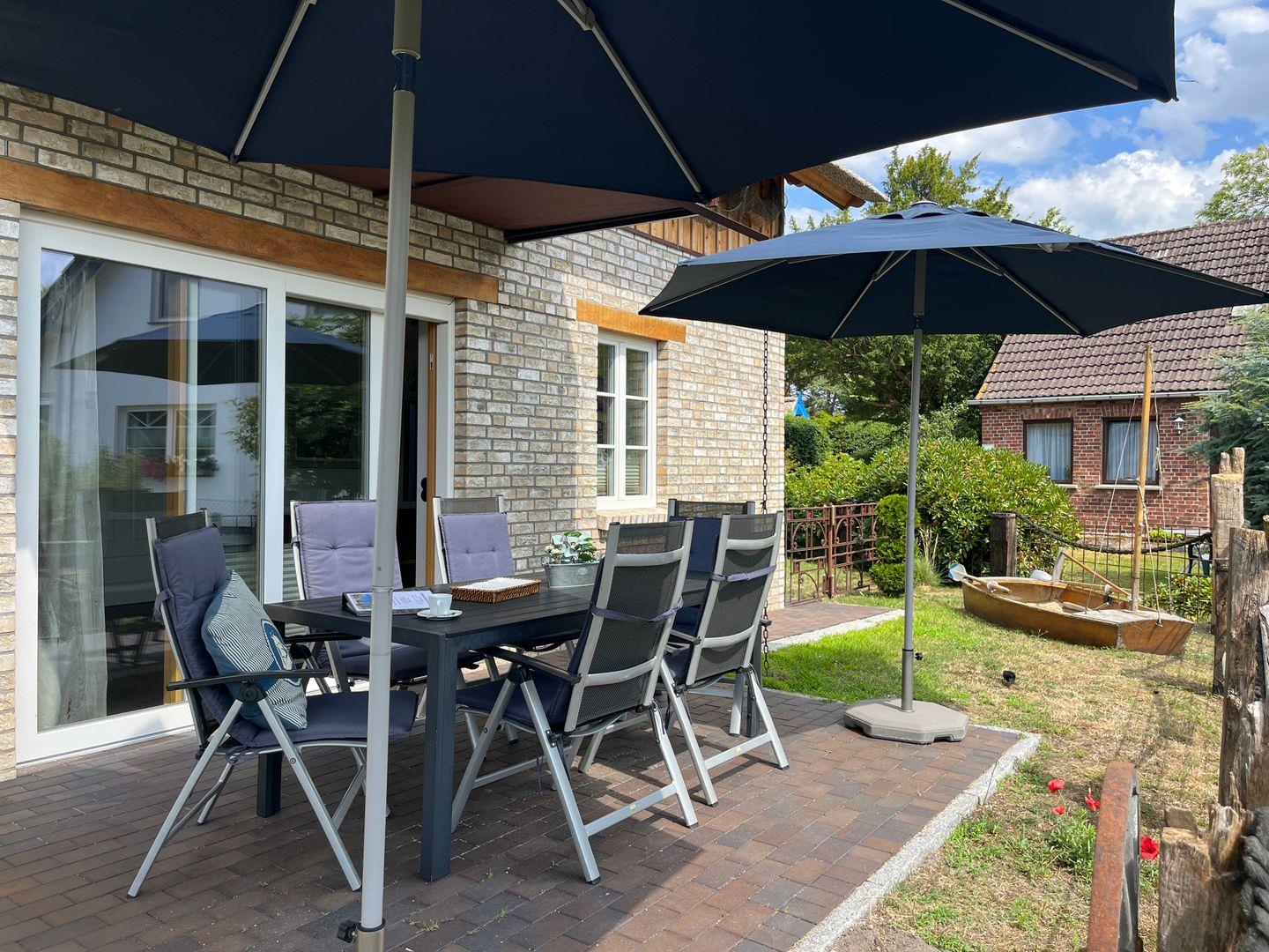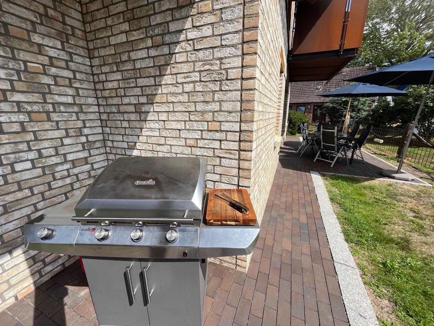 Sonnenschirm zum Verweilen ein. Im Garten befindet sich ein Grillbereich
