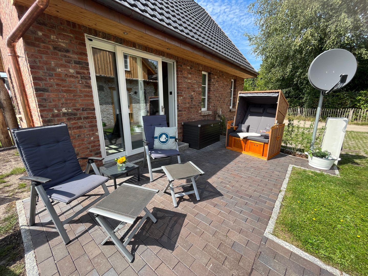 Fernseher. Die Terrasse und der Balkon laden mit Gartenmöbeln, Liegen und