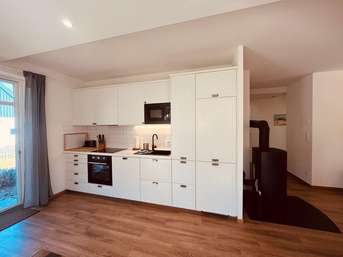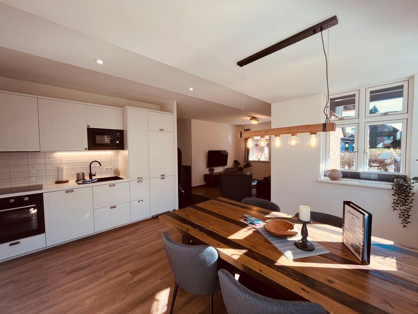 angrenzenden voll ausgestatteten Küche mit Herd, Backofen, Kaffeemaschine etc.