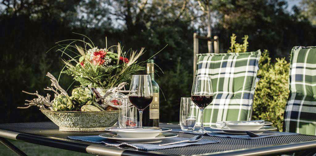 Terasse ist mit Gartenmöbeln und Sonnenschirm, Grillecke und 2 Liegen