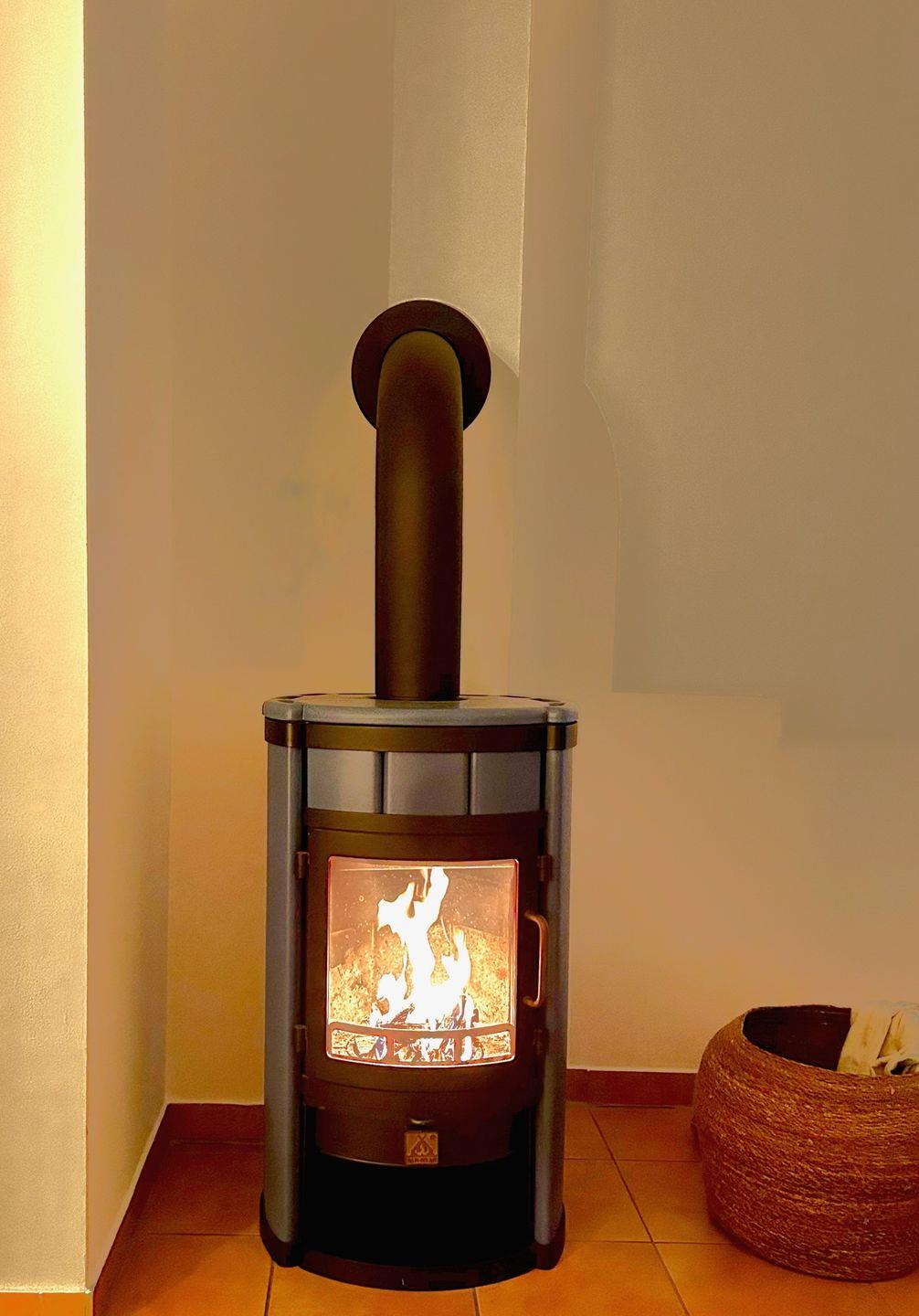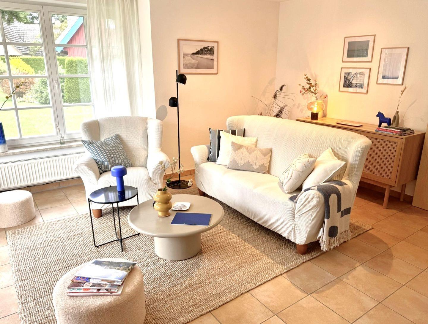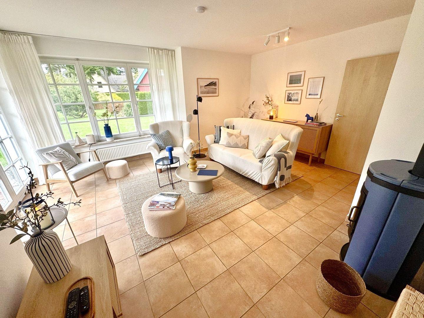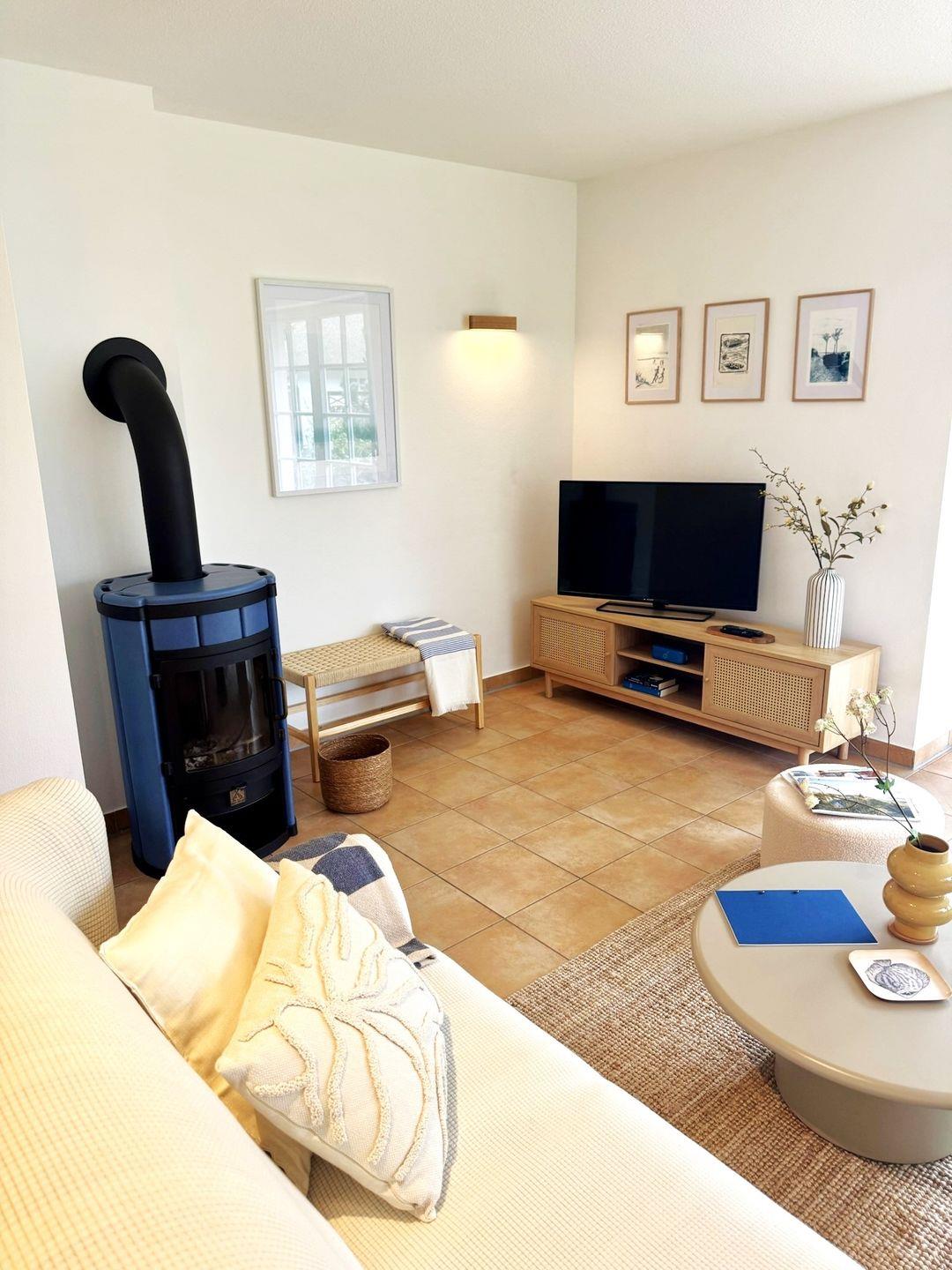 Der helle Wohnbereich bildet das Herzstück der Wohnung. Eine gemütliche Sofaecke und bequeme Sessel laden zum Entspannen ein, während der Kaminofen besonders an kühleren Tagen für eine warme und behagliche Atmosphäre sorgt. Für Unterhaltung stehen ein Satelliten-TV mit Amazon-Fire-TV-Stick sowie schnelles Glasfaser-WLAN zur Verfügung – ideal für Streaming oder Homeoffice.