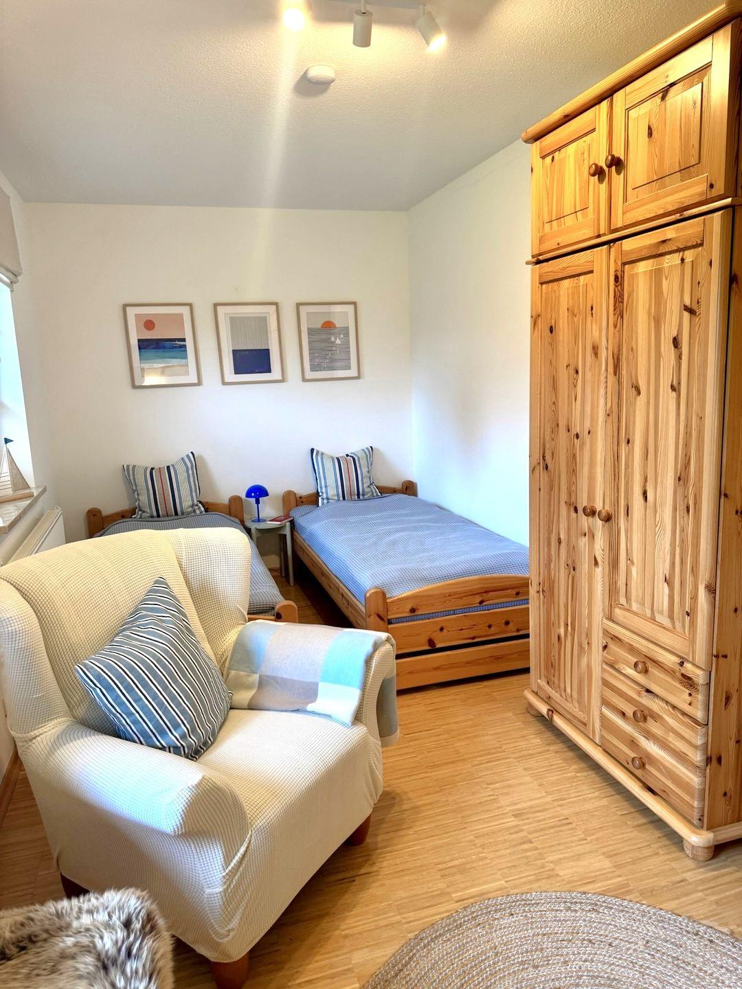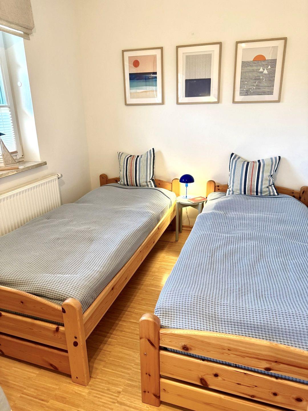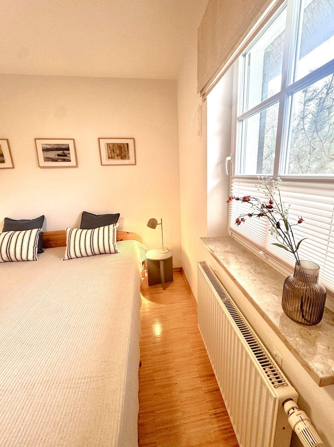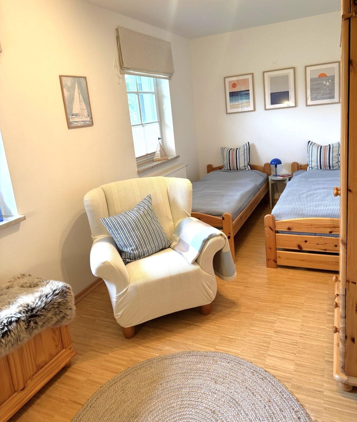 Die ebenerdige und rollstuhlfreundliche Wohnung überzeugt mit einer durchdachten Raumaufteilung und viel Platz zum Wohlfühlen. Zwei separate Schlafzimmer mit hochwertigem Stäbchenparkett bieten angenehme Rückzugsorte. Eines der Schlafzimmer ist mit zwei Einzelbetten und einem großzügigen Schreibtisch ausgestattet und eignet sich damit auch hervorragend für Gäste, die Arbeit und Urlaub miteinander verbinden möchten.