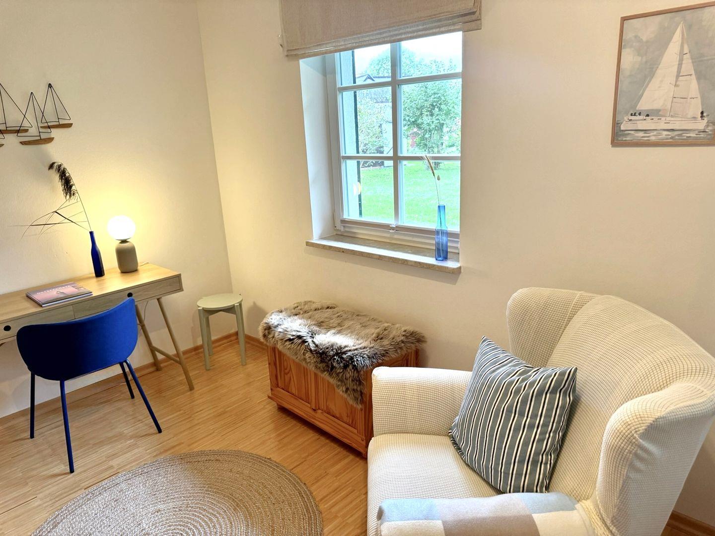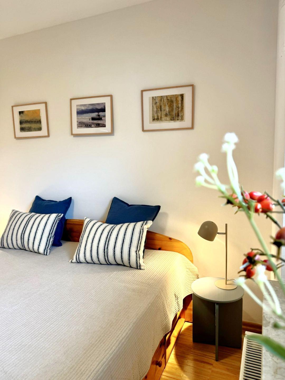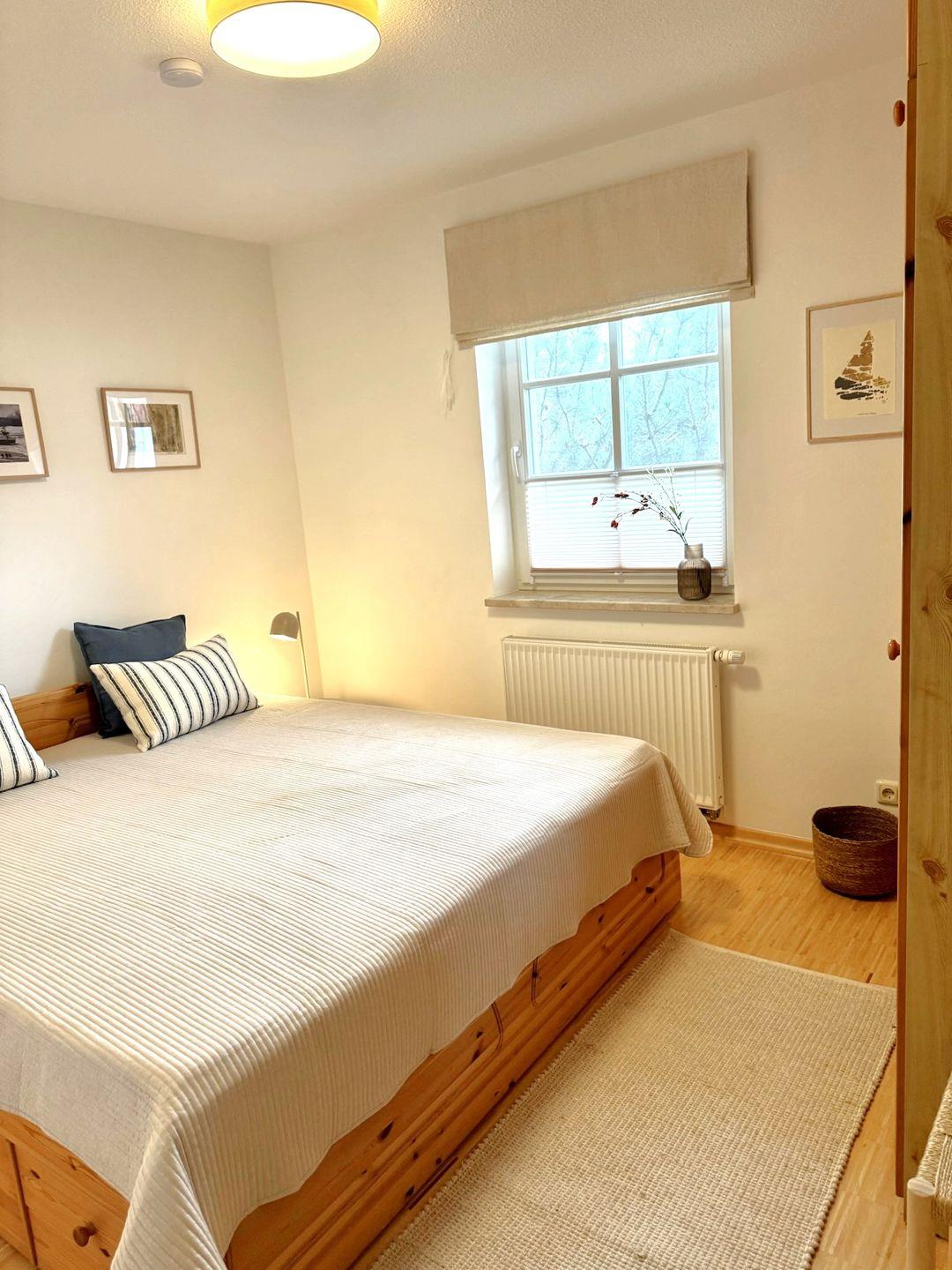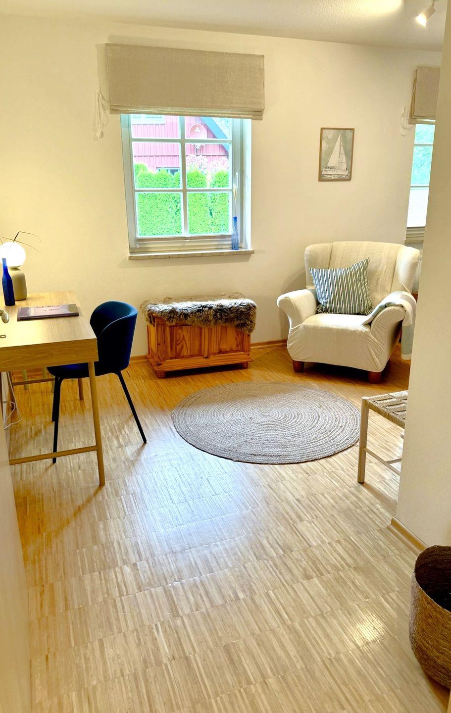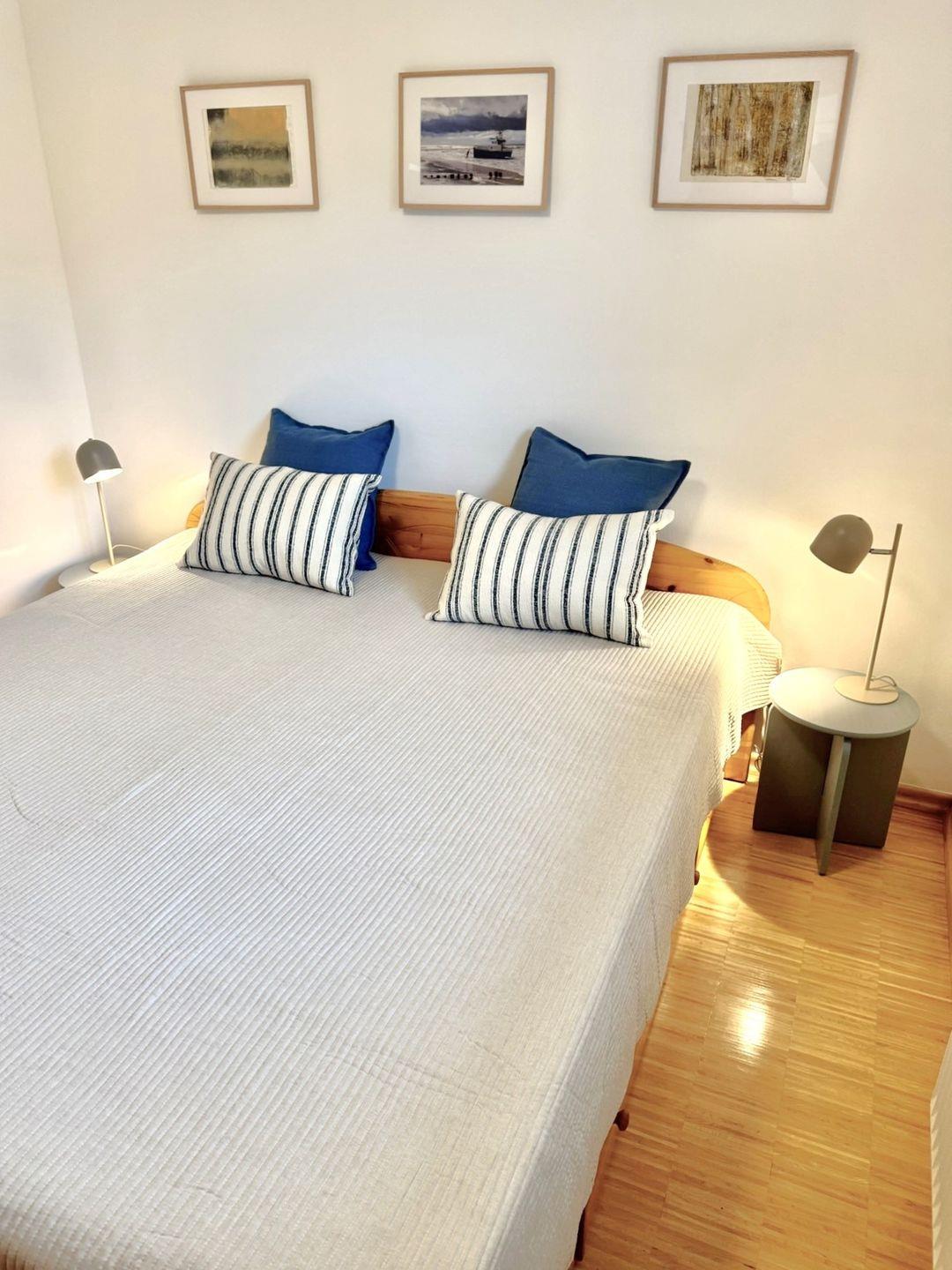 Die ebenerdige und rollstuhlfreundliche Wohnung überzeugt mit einer durchdachten Raumaufteilung und viel Platz zum Wohlfühlen. Zwei separate Schlafzimmer mit hochwertigem Stäbchenparkett bieten angenehme Rückzugsorte. Eines der Schlafzimmer ist mit zwei Einzelbetten und einem großzügigen Schreibtisch ausgestattet und eignet sich damit auch hervorragend für Gäste, die Arbeit und Urlaub miteinander verbinden möchten.