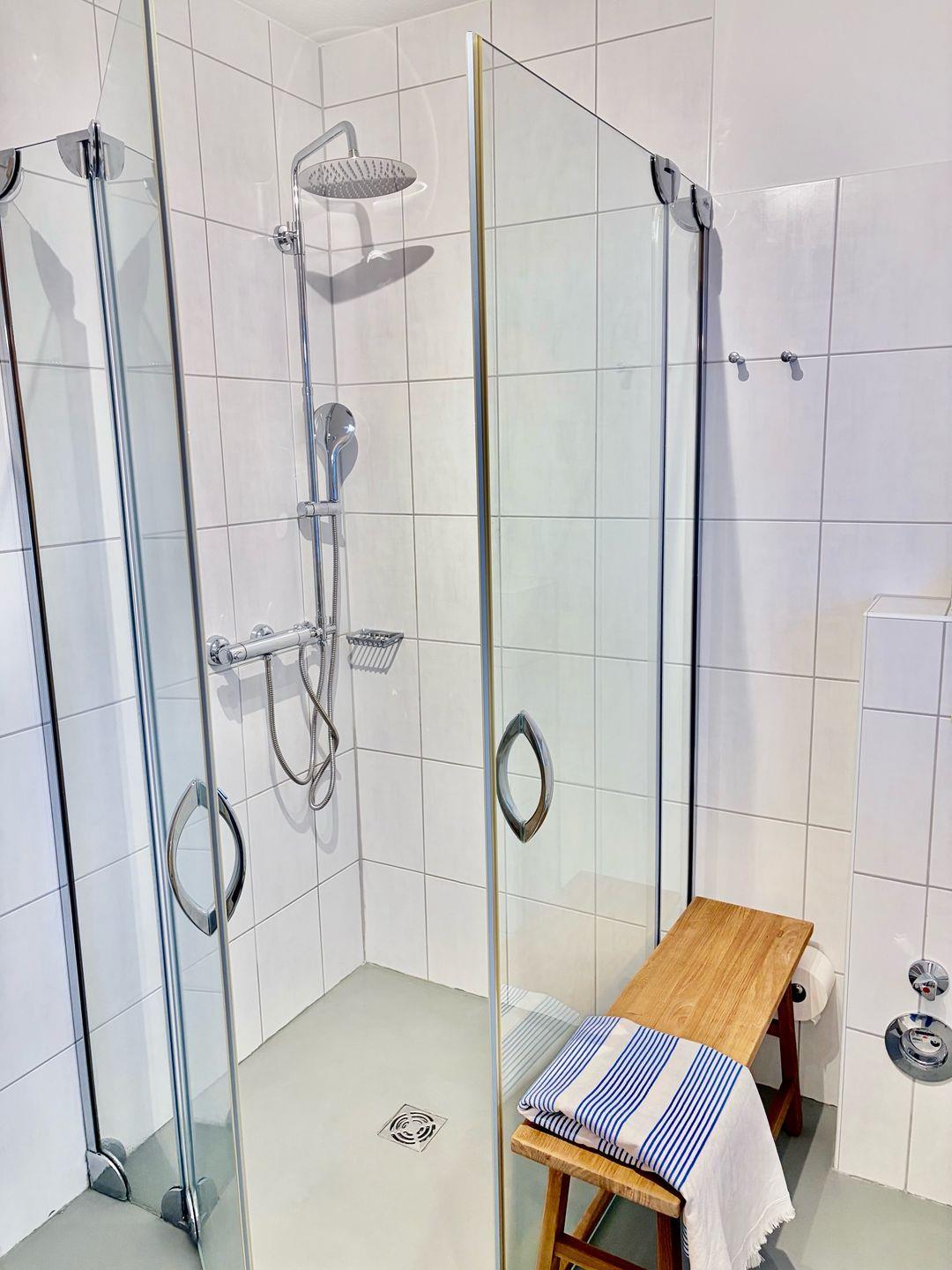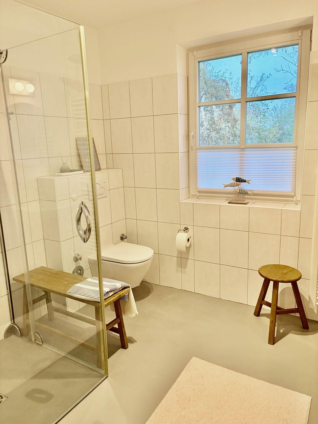 Das moderne Badezimmer verfügt über eine bodengleiche Dusche, WC, Waschbecken und Haartrockner und bietet damit zeitgemäßen Komfort.