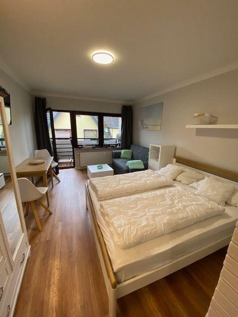 Im 2021 renovierten Apartment erwartet Sie eine durchdachte Innenausstattung, die Ihren Aufenthalt so angenehm wie möglich gestaltet. Neben einem komfortablen Doppelbett und einem Schlafsofa, bietet der Raum einen kleinen Esstisch mit zwei Stühlen, einen Fernseher sowie einen geräumigen Schrank für Ihre Reisekleidung. Eine Pads-Kaffeemaschine, ein Cerankochfeld, ein Wasserkocher und eine Spülmaschine in der Küche unterstützen Ihre Selbstversorgung optimal.