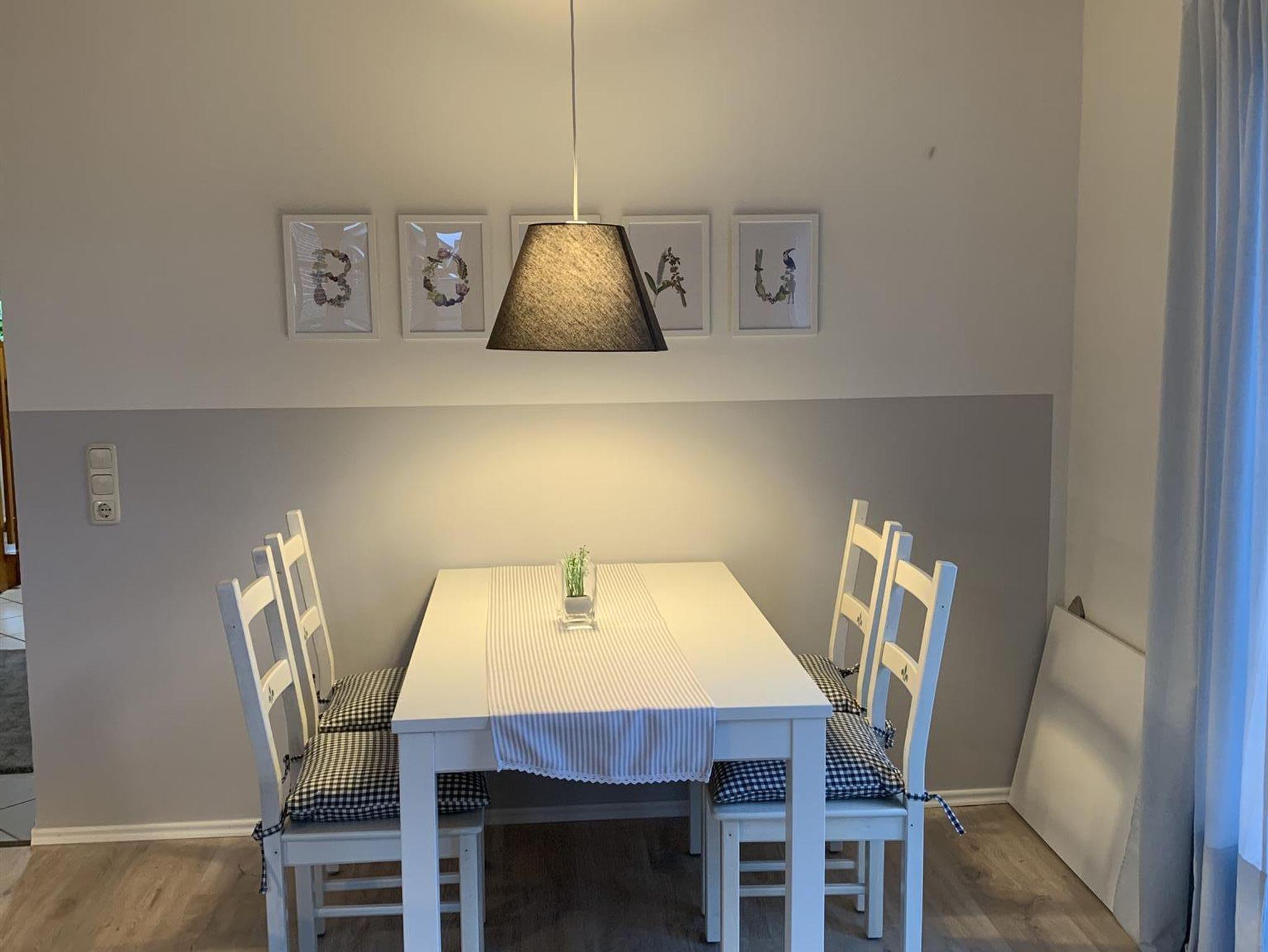 In der Küche selbst wartet auf Sie ein kleiner Sitzbereich für zwei Personen für ein schnelles Frühstück. Von der Diele aus haben Sie auch einen Zugang in einen Hauswirtschaftsraum in der sich eine Waschmaschine für Sie befindet. Ein Gäste-WC ist selbstverständlich im Erdgeschoss vorhanden. Von der Diele aus betreten Sie auch den großzügigen Wohnraum in dem sich dann eine Sofaecke so wie ein Essbereich befindet. Selbstverständlich ist der Wohnzimmerbereich mit einem TV ausgestattet.