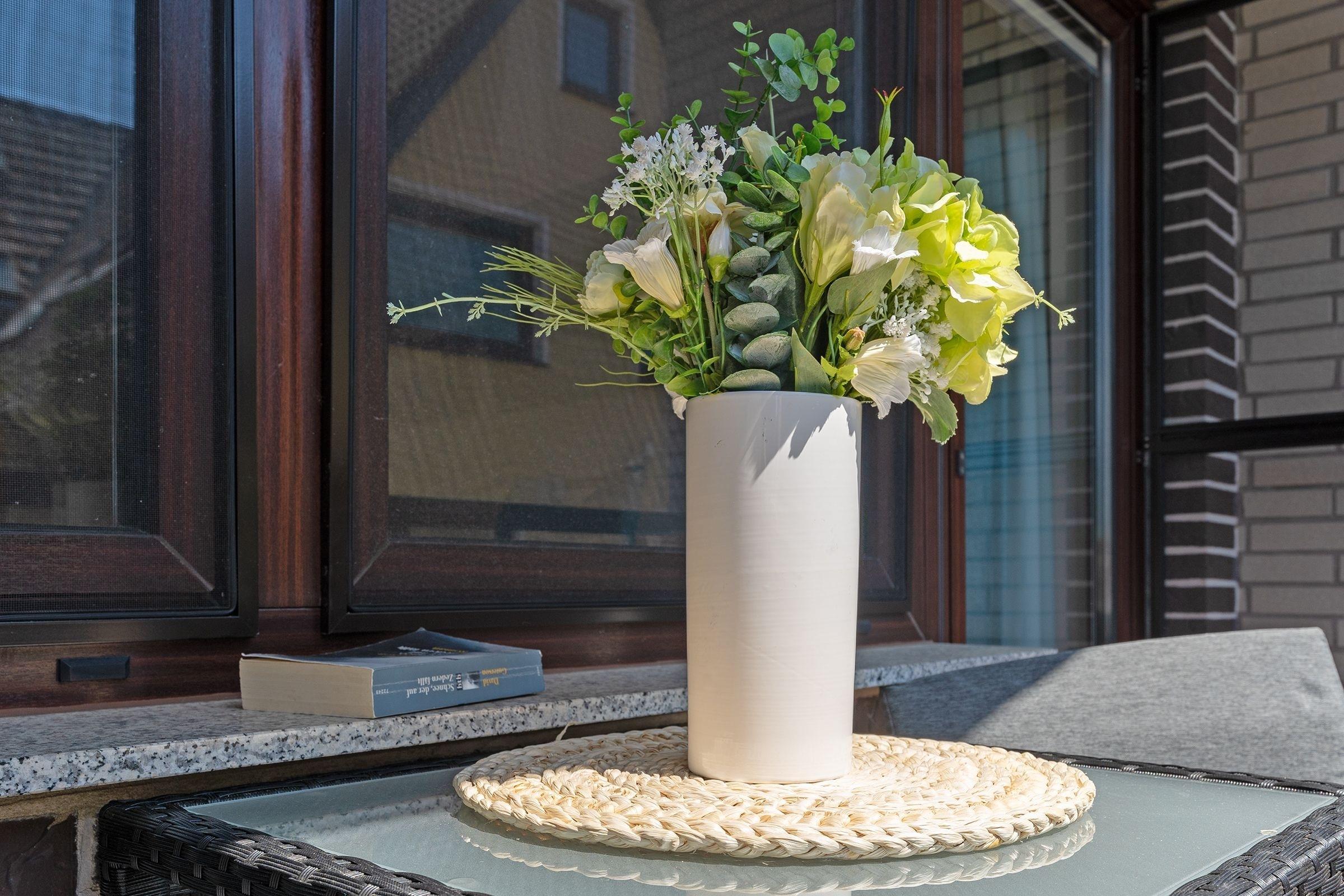 Es erwartet Sie eine moderner und lichtdurchfluteter Wohn-/Schlafbereich mit Zugang auf den möblierten Süd-Balkon. Genießen Sie hier zahlreiche Sonnenstunden mit seitlichem Blick auf den nahegelegenen See. Am Abend verwandeln Sie das platzsparende Schrankbett in Ihre Ruhe-Oase (2x 80x200 cm) und können es sich vor dem Smart-TV und dem Elektrokamin gemütlich machen. Tagsüber bietet der Esstisch ausreichend Platz zum Lesen, Fernsehen, Essen, Klönen oder Spielen. In der angrenzenden Küche, die mit vielen Annehmlichkeiten ausgestattet ist, können Sie Ihre Lieblingsspeisen spielend zubereiten. Das funktionale Dusch-Bad ist zusätzlich mit einem beheizbaren Handtuchhalter sowie einem Fön ausgestattet.