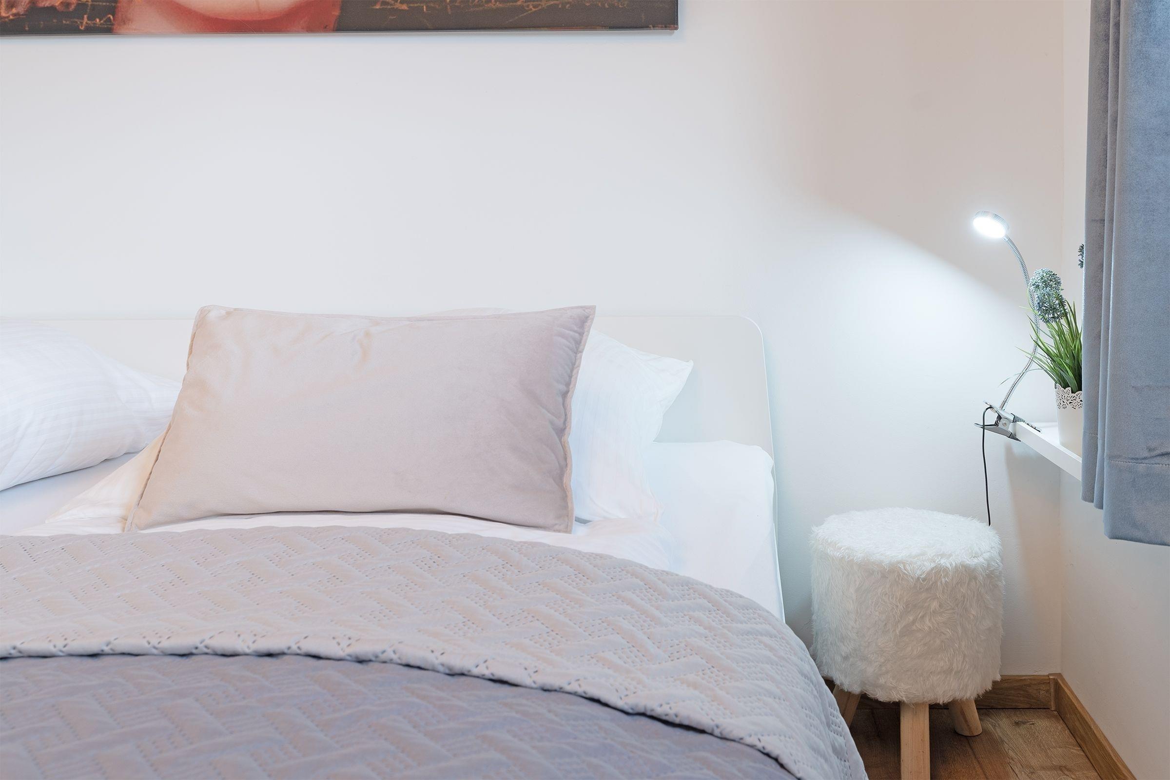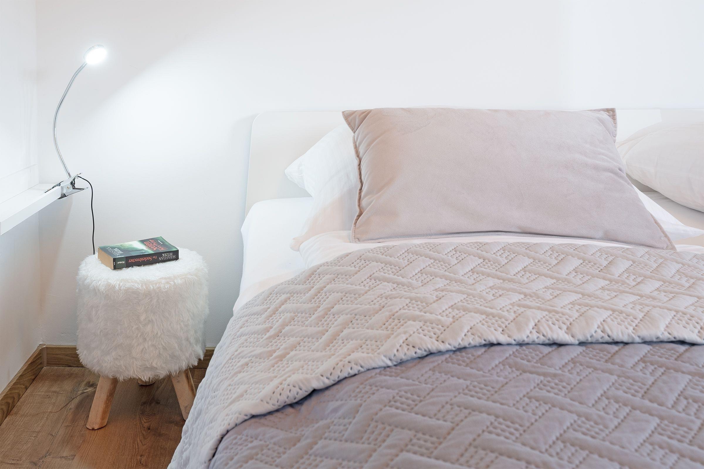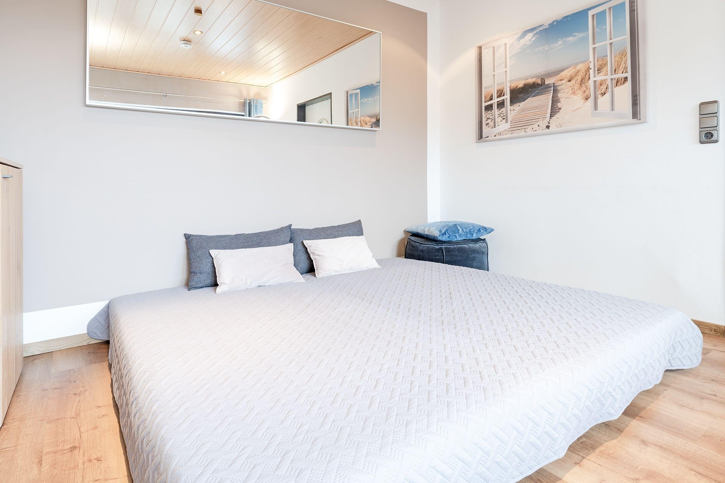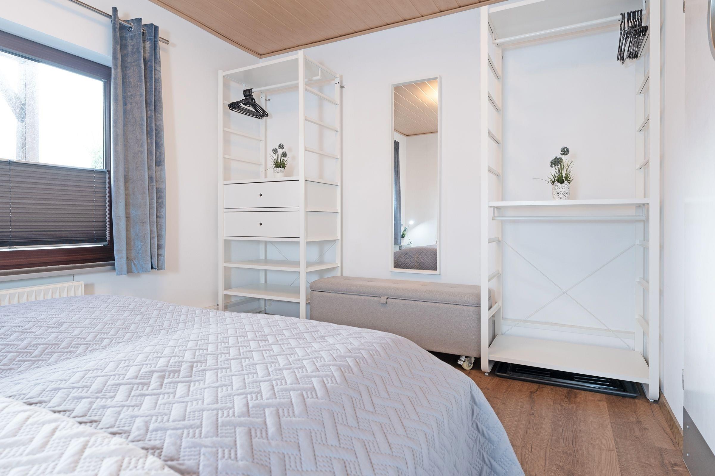 Schlafzimmer: 1 Doppelbett (2x 100x200 cm), Kleiderschrank, Verdunkelungsmöglichkeit: Plissee und Vorhang, Platz für Kinderbett
