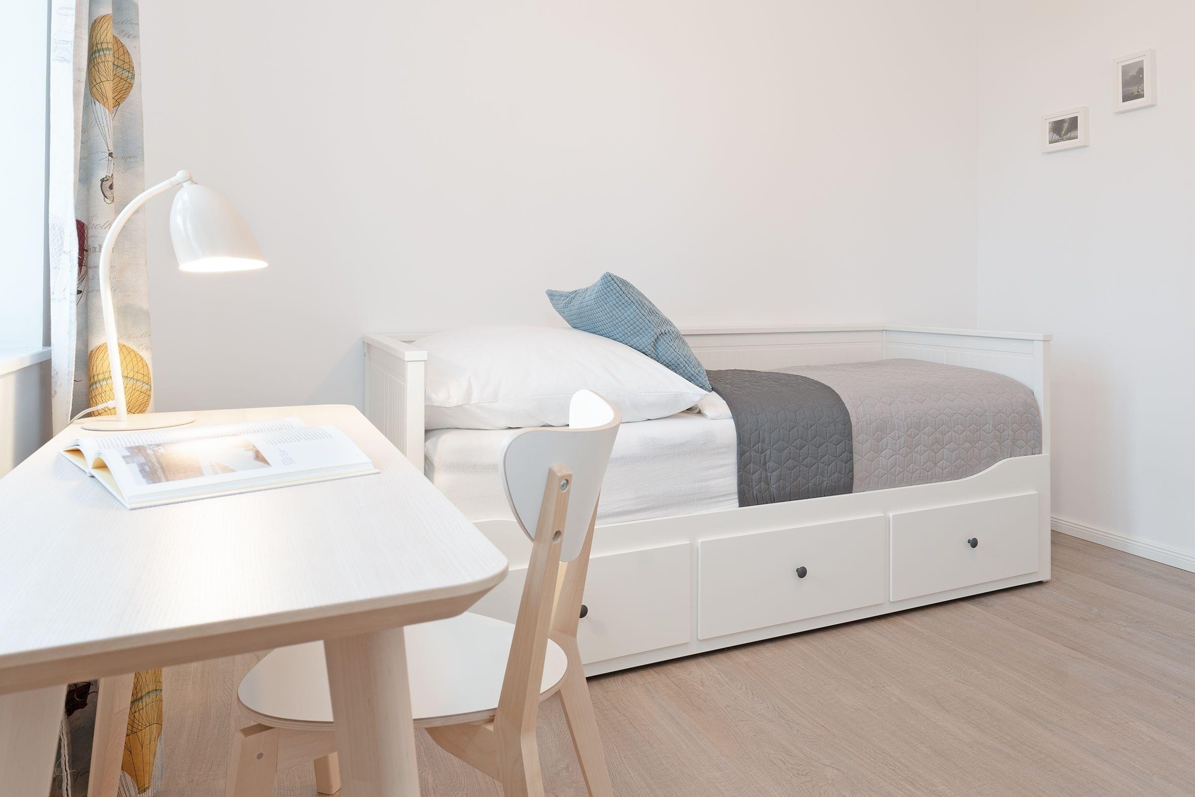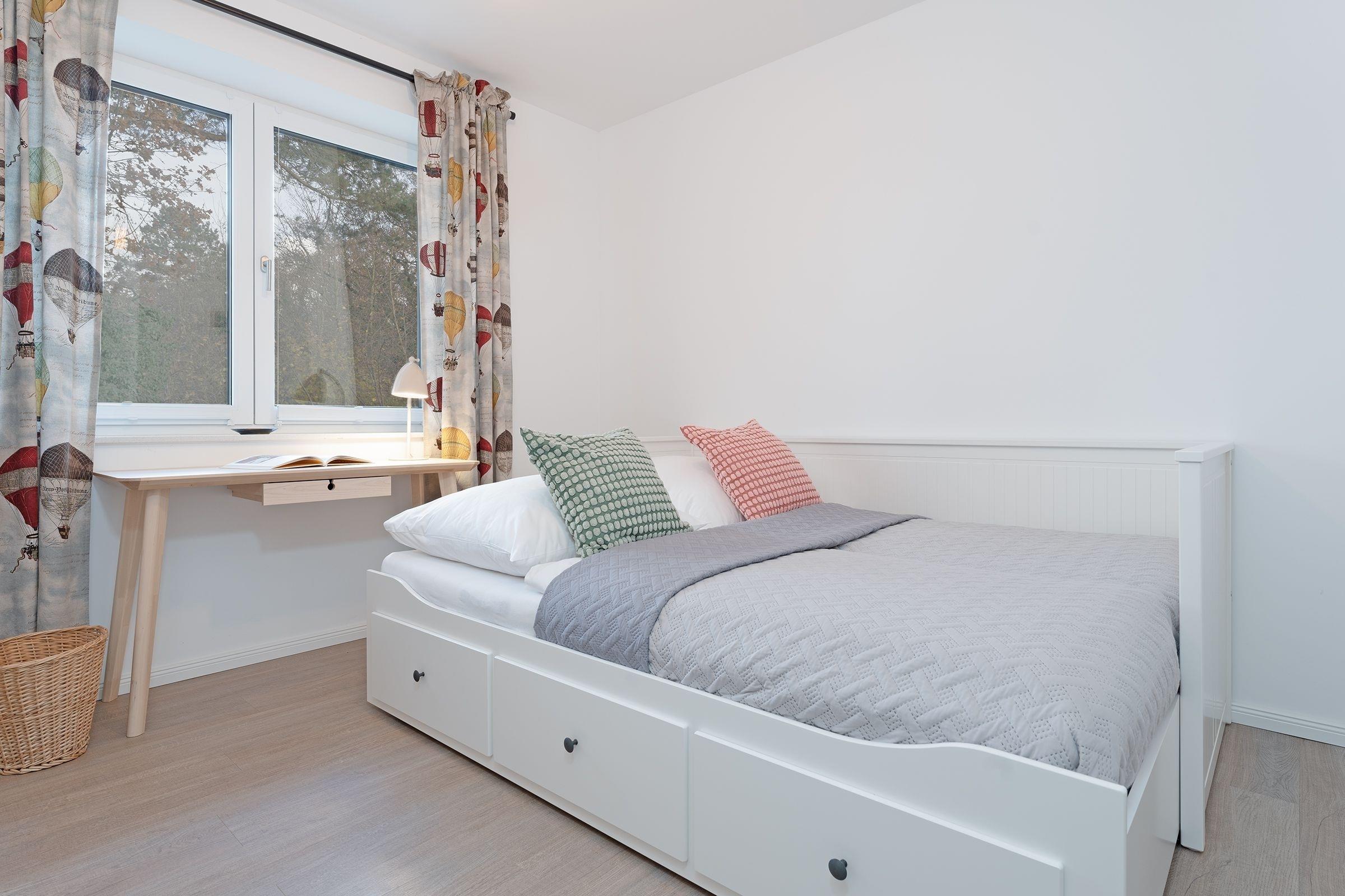 Schlafzimmer 2: 1 Kojenbett (80x200 cm, ausziehbar auf 160x200 cm), Kleiderschrank