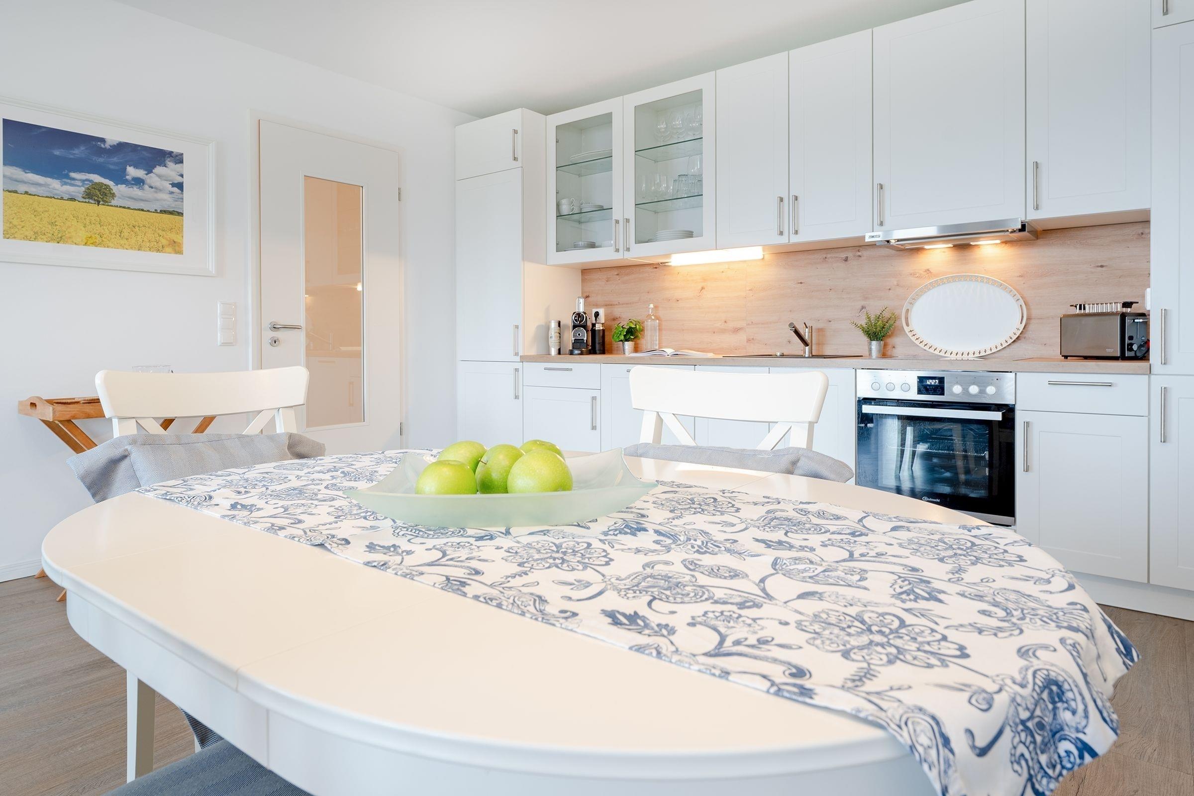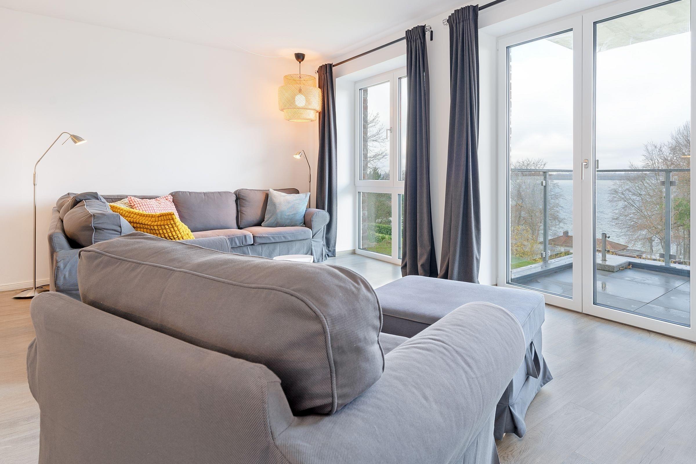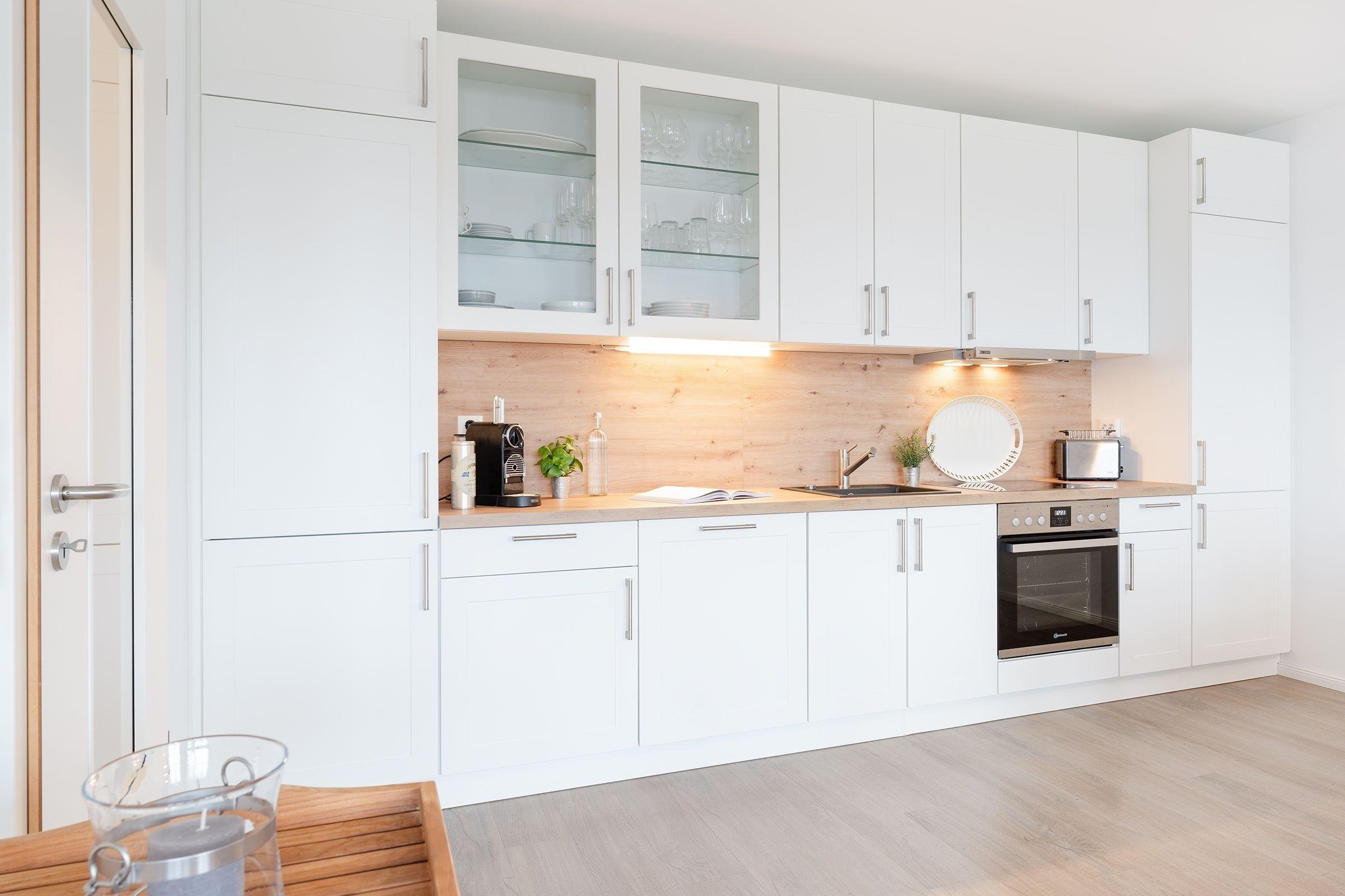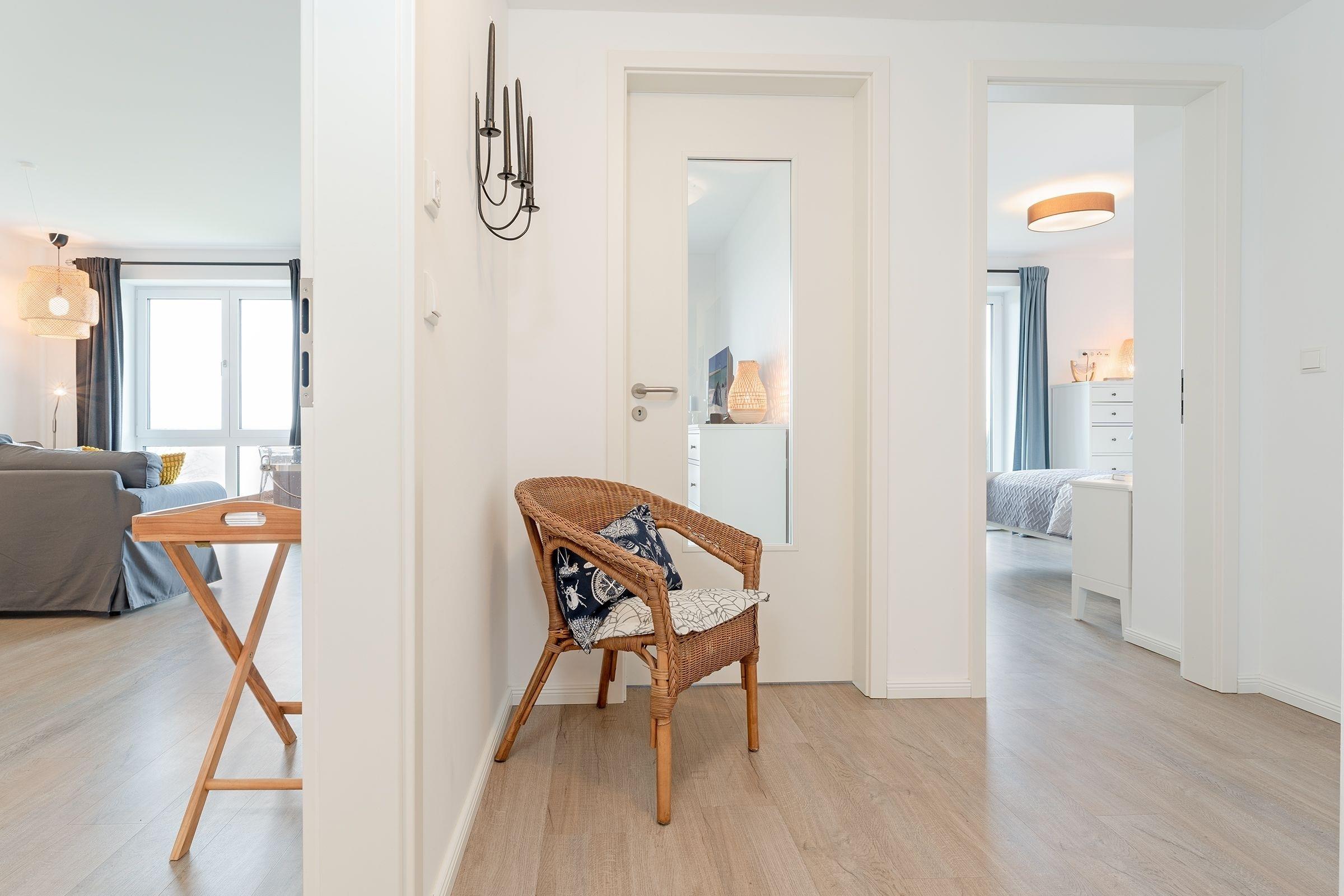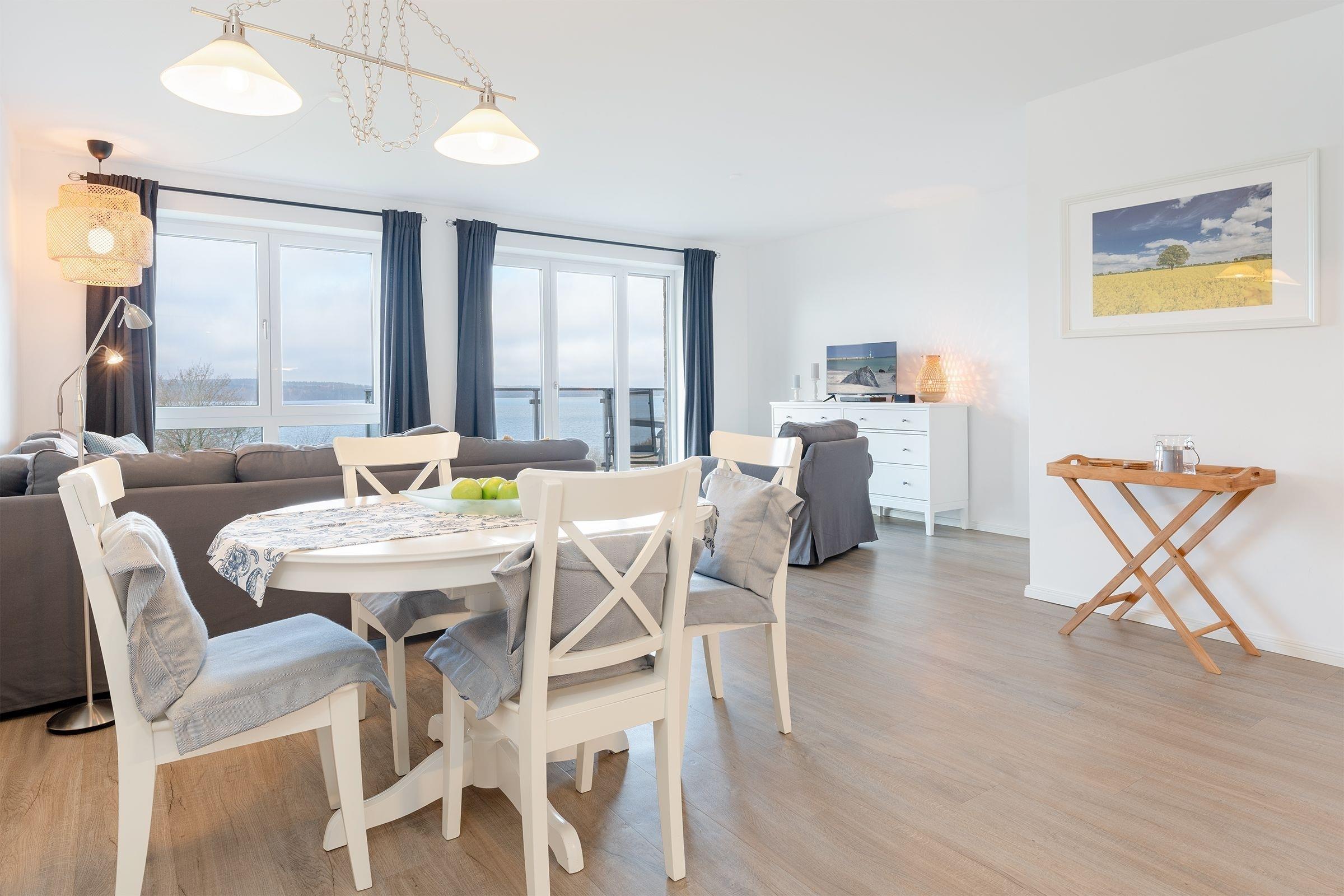 Der helle Wohnbereich empfängt Sie mit einer gemütlichen Sitzecke und einer kuscheligen Sofalandschaft – und einem traumhaften Blick auf den Großen Plöner See. Treten Sie auf den großzügigen, möblierten Südwest-Balkon und lassen Sie hier den Abend mit Ihren Lieblingsspeisen ausklingen. Die zum Wohnbereich hin offene, moderne Küche mit Geschirrspüler und Nespresso-Maschine bringt Hobbyköche sicher zum Lächeln. Nach einem tollen Urlaubstag finden Sie im Doppelbett (2x 90x200 cm) im Schlafzimmer erholsamen Schlaf. Von hier aus haben Sie auch Zutritt auf den großen Balkon. Das zweite Schlafzimmer bietet ein Kojenbett (80x200 cm, ausziehbar auf 160x200 cm). Morgens begrüßt Sie das tageslichthelle Bad mit bodengleicher Dusche und Badewanne. Dazu gibt es ein Gäste-WC. Ziehen Sie zum Start in den Tag ein paar Bahnen durch den See, eine schöne Badestelle ist fußläufig erreichbar.