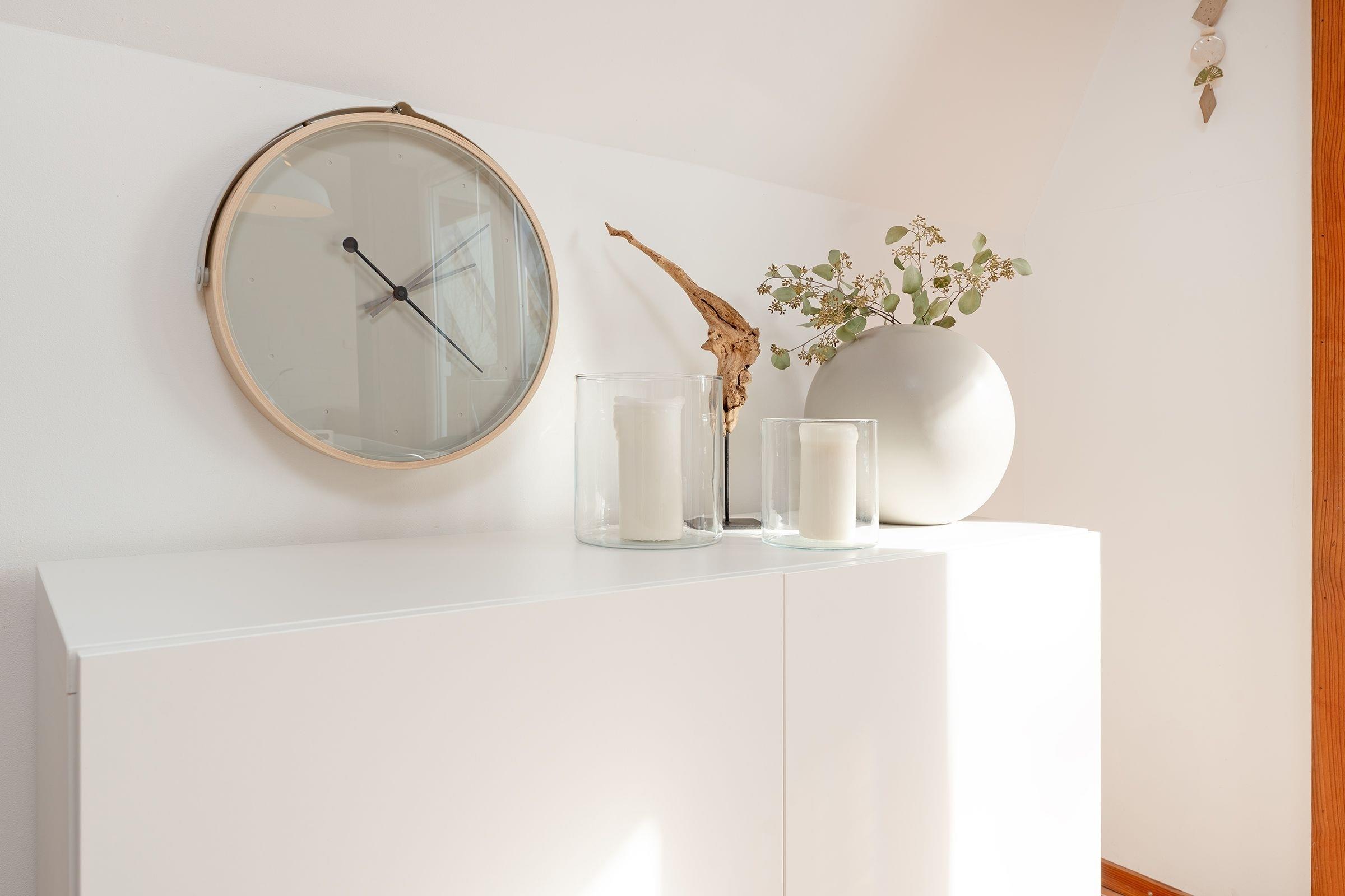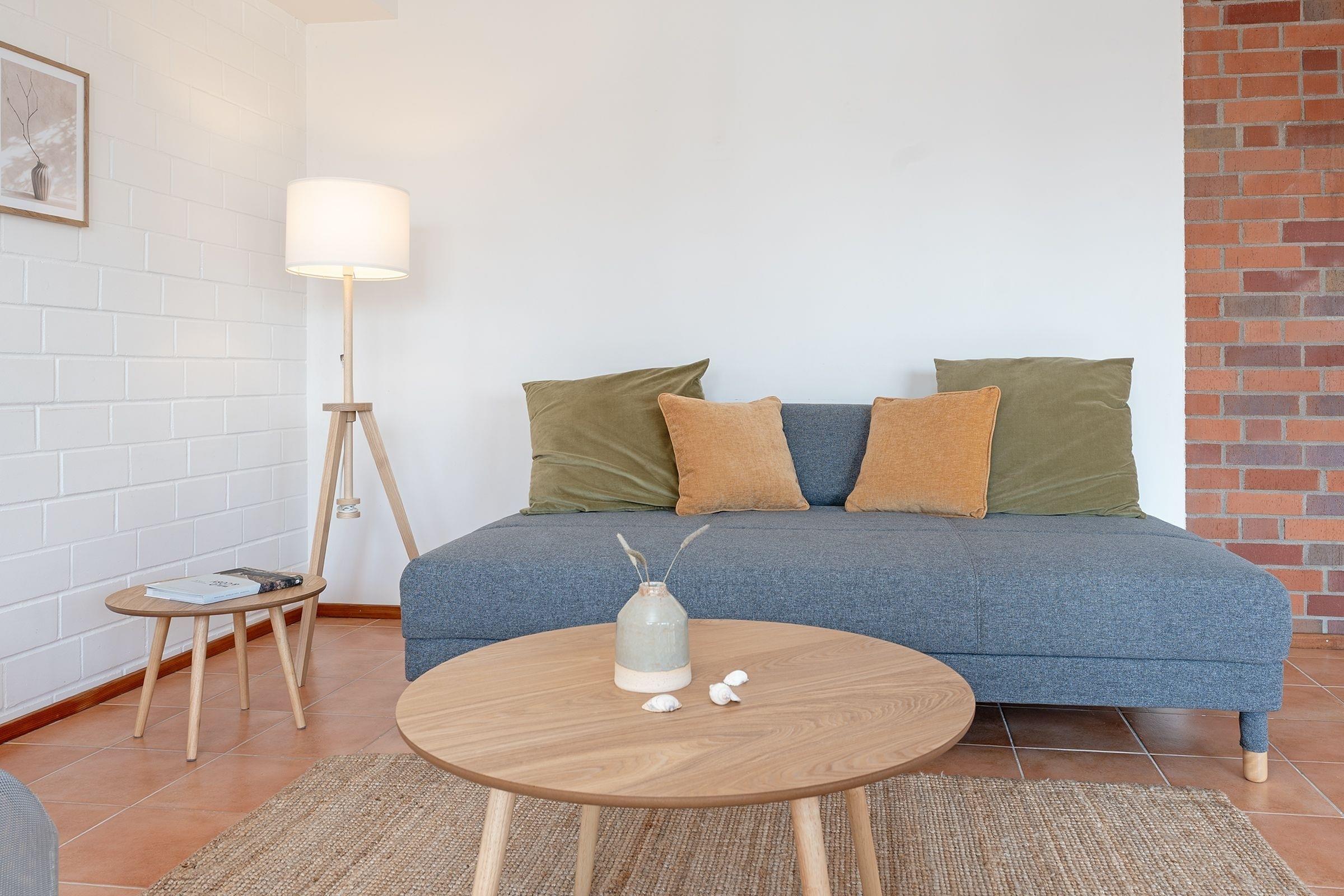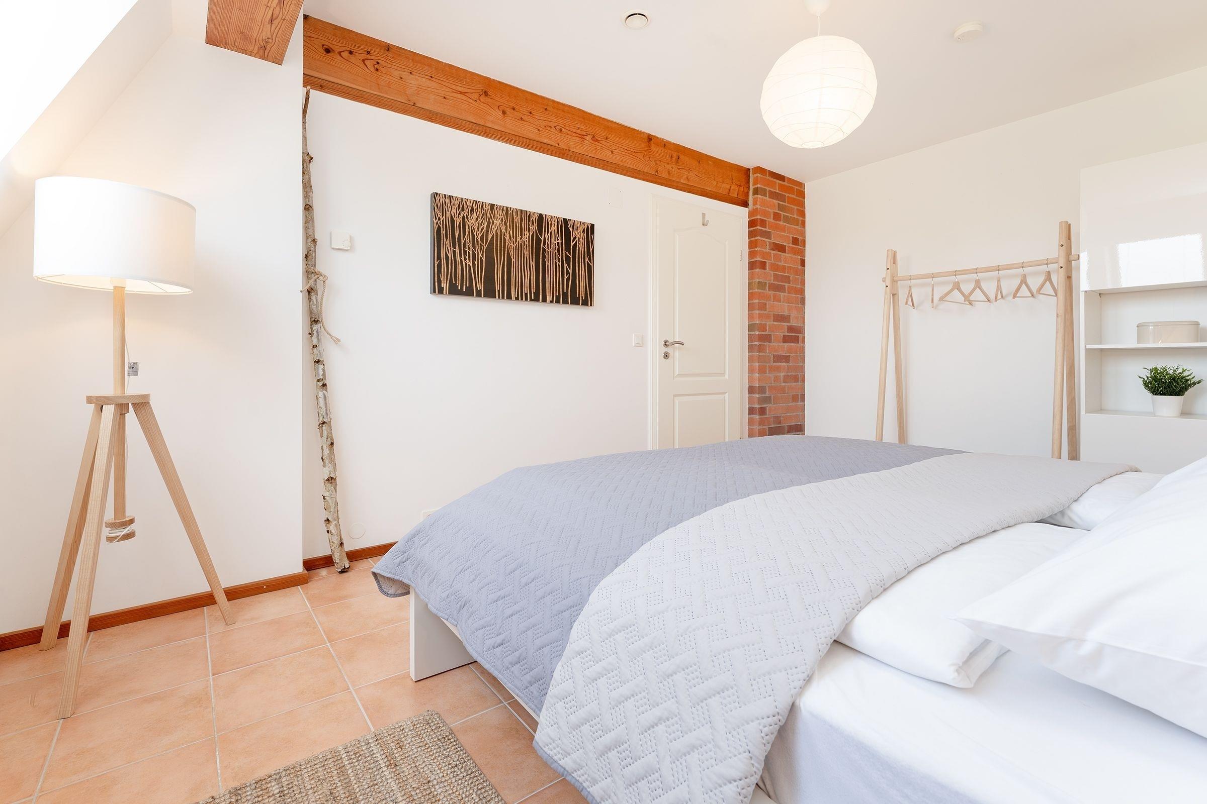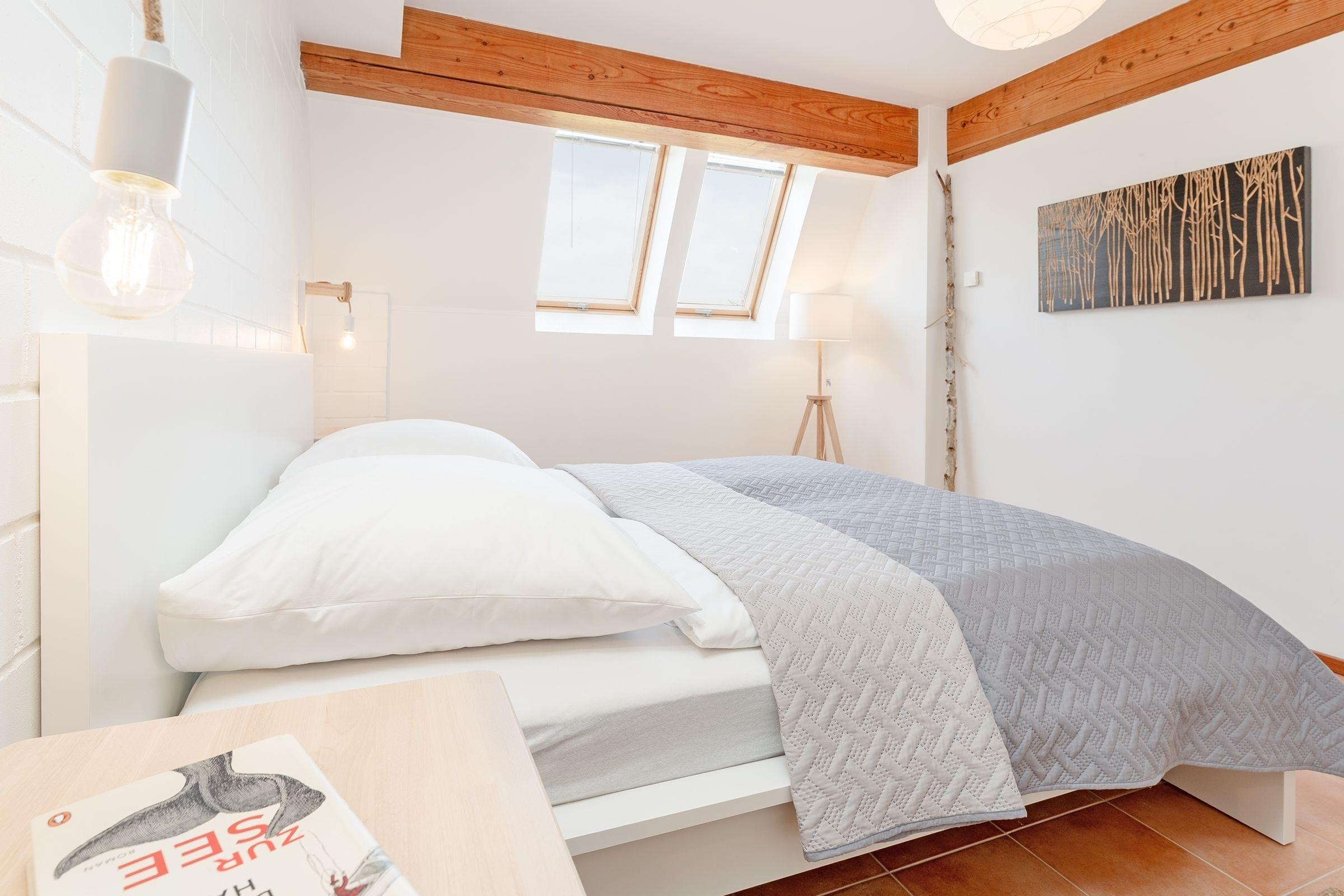 Diese großzügige Ferienwohnung besticht durch ihre moderne Ausstattung und die idyllische Lage in der Holsteinischen Schweiz. Sie ist perfekt für eine erholsame Auszeit geeignet. Das helle und stilvoll eingerichtete Wohnzimmer lädt mit einer gemütlichen Sofaecke und einem TV zum Entspannen ein. Von hier aus gelangen Sie auf den überdachten Balkon mit Südausrichtung, der mit Gartenmöbeln ausgestattet ist – ideal für ein Frühstück im Freien oder einen gemütlichen Abend. Die moderne, offene Küche ist mit einem Cerankochfeld, Backofen, Kühlschrank mit Gefrierfach und einer Nespresso-Maschine hervorragend ausgestattet. Der edle Essbereich am Fenster bietet Platz für gesellige Mahlzeiten und gemeinsame Stunden. Das Schlafzimmer ist komfortabel eingerichtet und bietet ruhige Nächte für 2 Personen im Doppelbett (180x200 cm). Das moderne Badezimmer ist mit einer Wanne mit Duschfunktion sowie Fußbodenheizung ausgestattet.