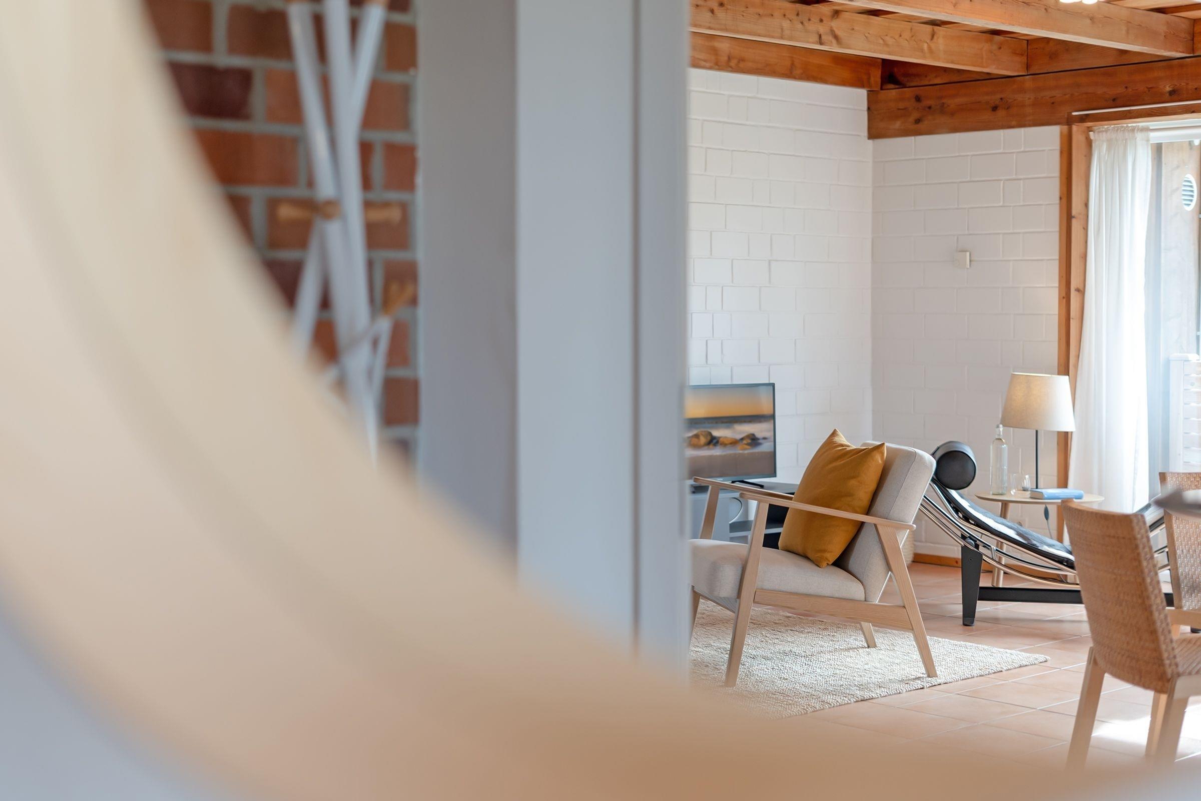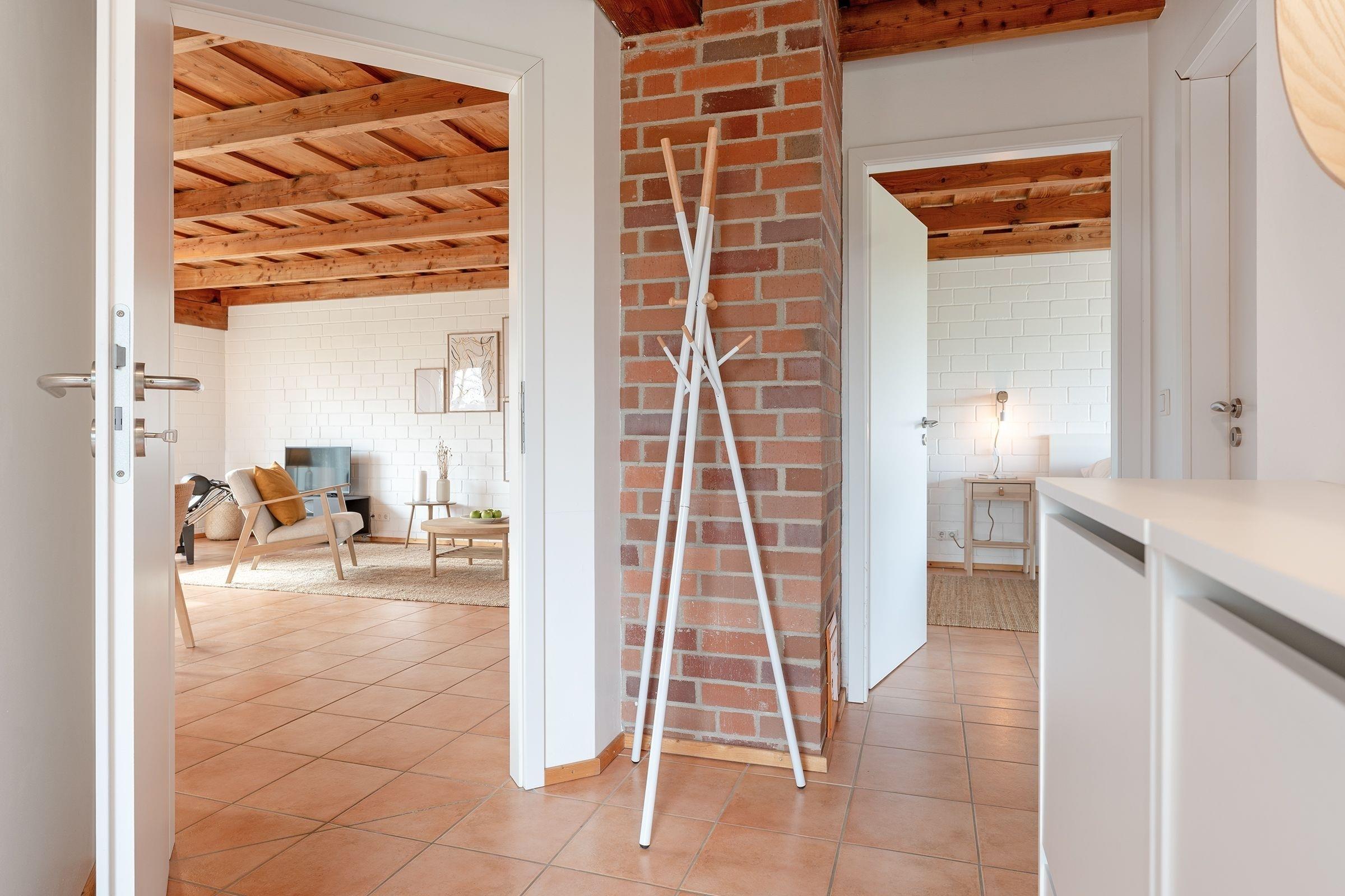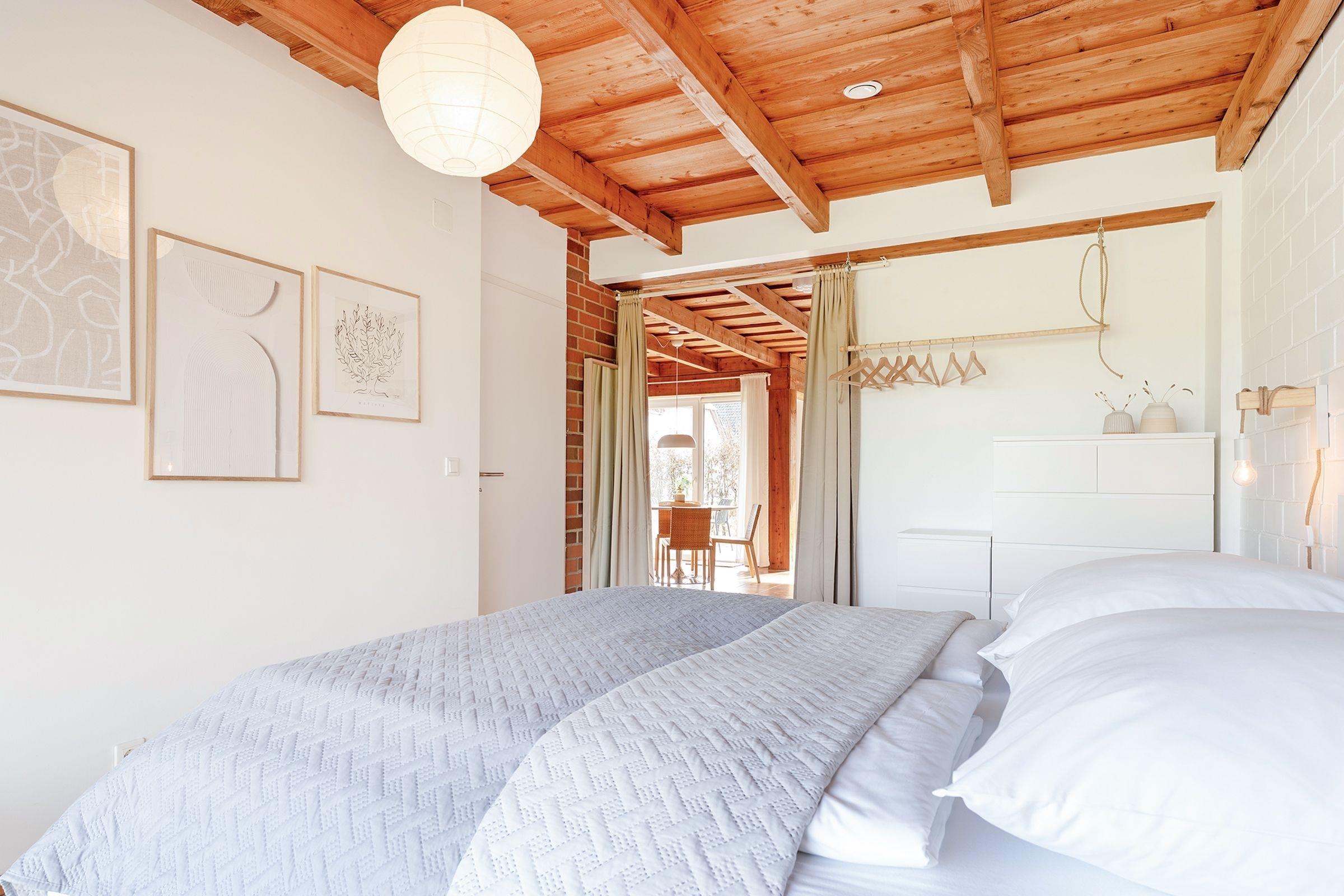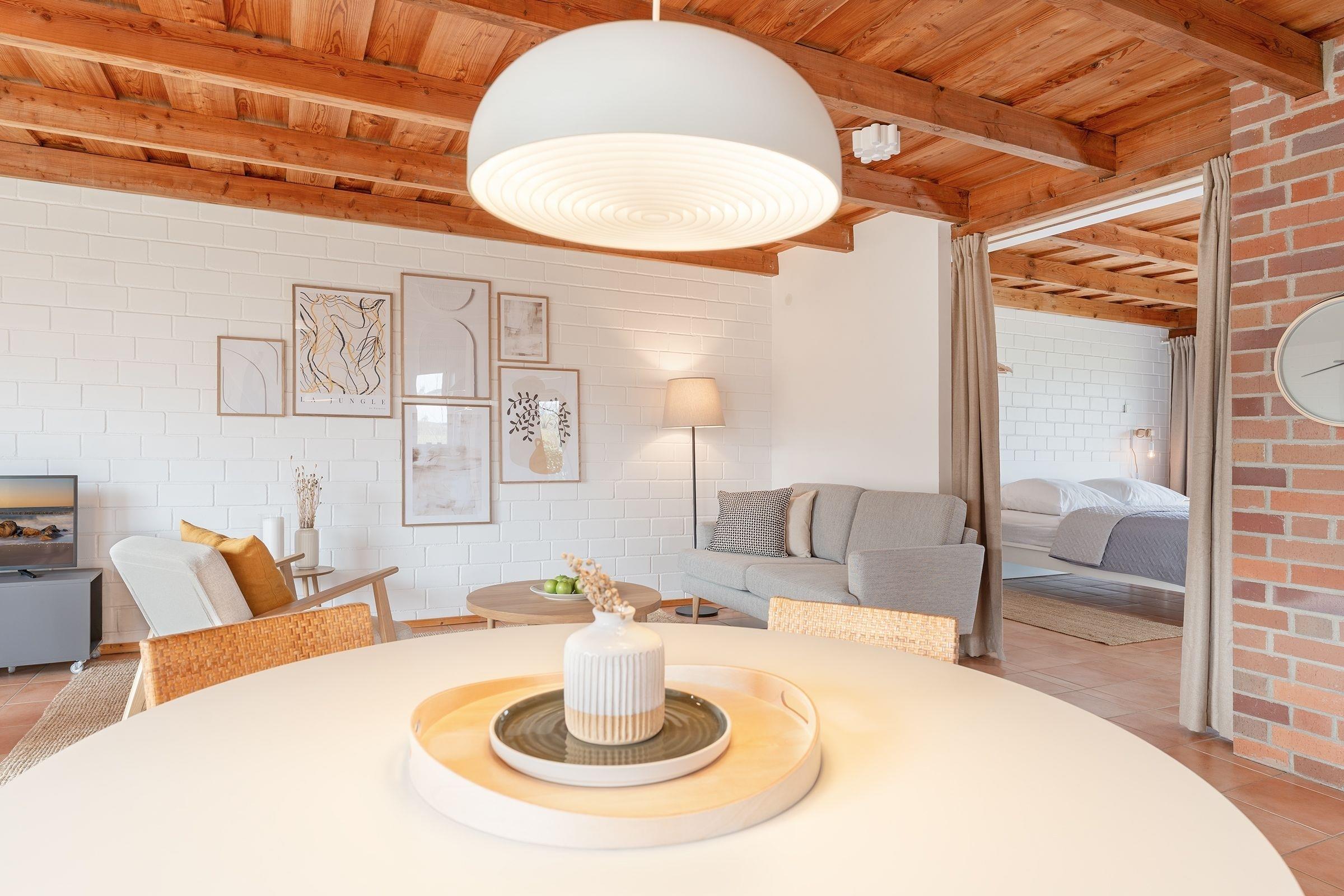 Diese moderne Ferienwohnung in Bosau bietet den perfekten Rückzugsort für einen entspannten Urlaub in der Holsteinischen Schweiz. Die großzügige und geschmackvolle Einrichtung sorgt für Wohlfühlatmosphäre. Das helle Wohnzimmer lädt mit einer gemütlichen Sofaecke und einem TV zum Verweilen ein. Von hier aus gelangen Sie auf die überdachte Terrasse, die mit Gartenmöbeln ausgestattet ist – ideal für Mahlzeiten oder entspannte Stunden im Freien. Der angrenzende Gemeinschaftsgarten bietet zusätzliche Möglichkeiten zur Erholung. Die offene, moderne Küche ist sehr gut ausgestattet: Cerankochfeld, Backofen, Kühlschrank mit Gefrierfach und eine Espressomaschine lassen keine Wünsche offen. Der Essbereich bietet ausreichend Platz für gemeinsame Mahlzeiten. Das Schlafzimmer mit bodentiefen Fenstern ist komfortabel eingerichtet und überzeugt mit seiner harmonischen Gestaltung. Das bequeme Doppelbett (2x 90x200 cm) sorgt für erholsame Nächte. Das tageslichthelle Duschbad bringt Sie entspannt in den neuen Tag.